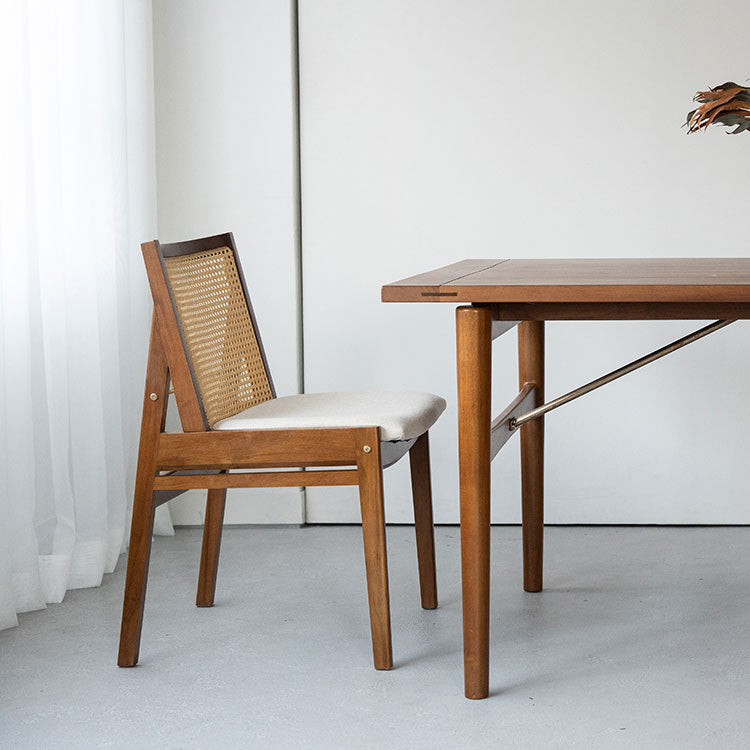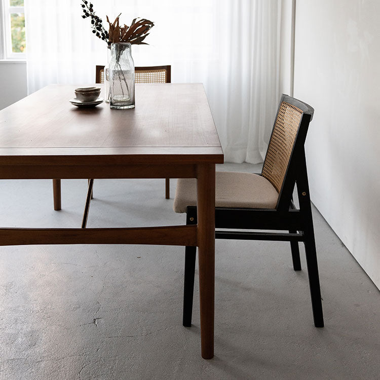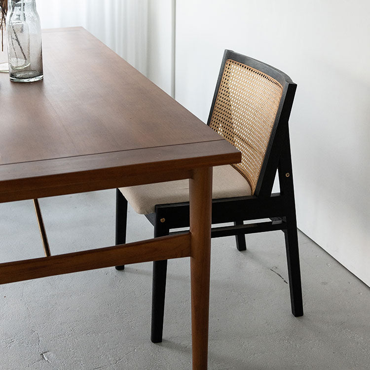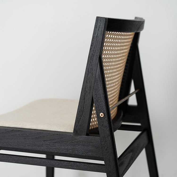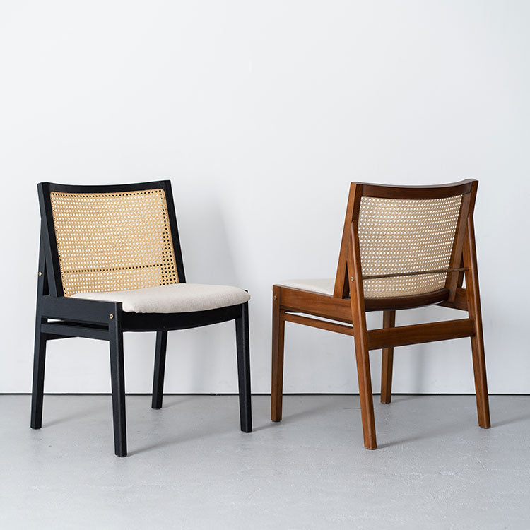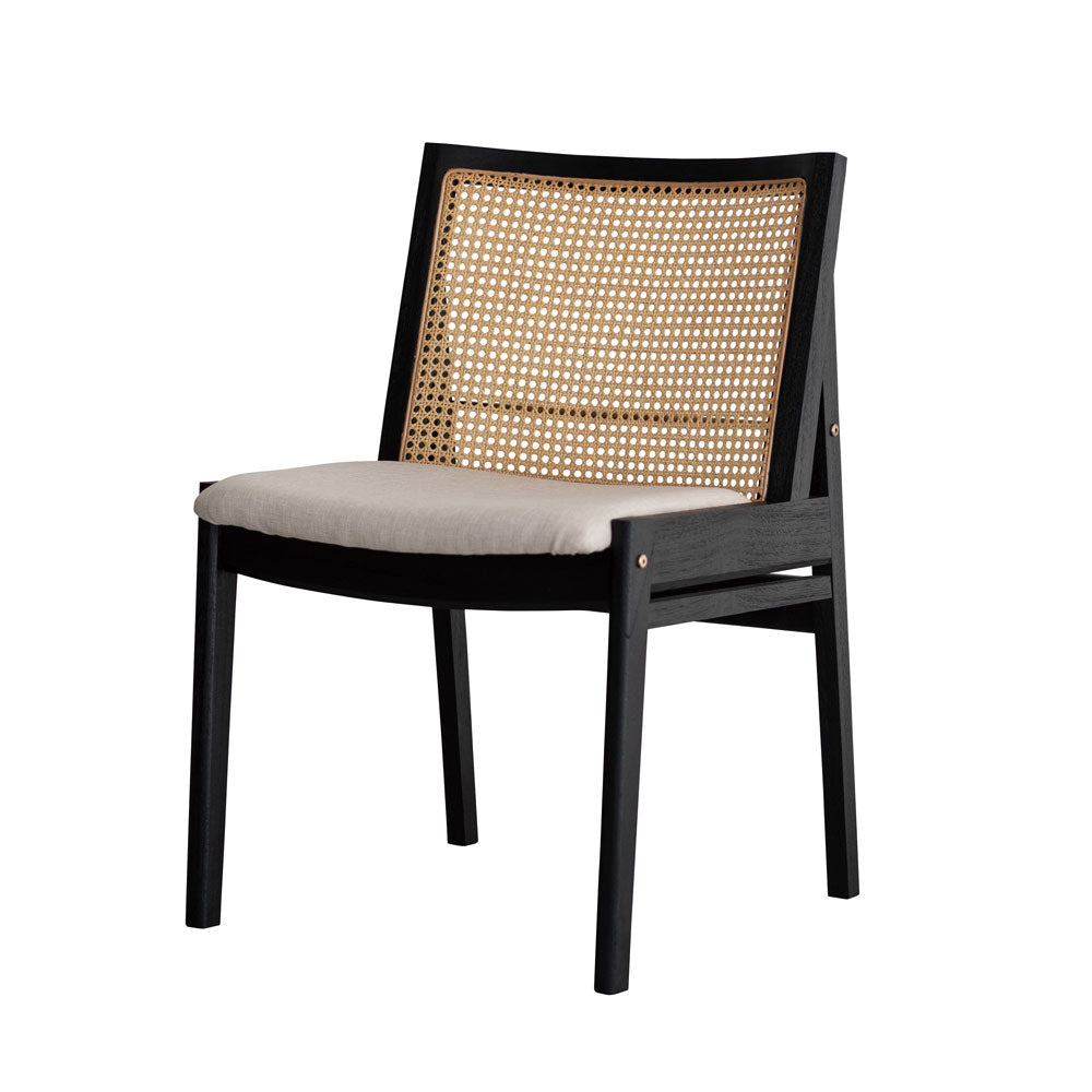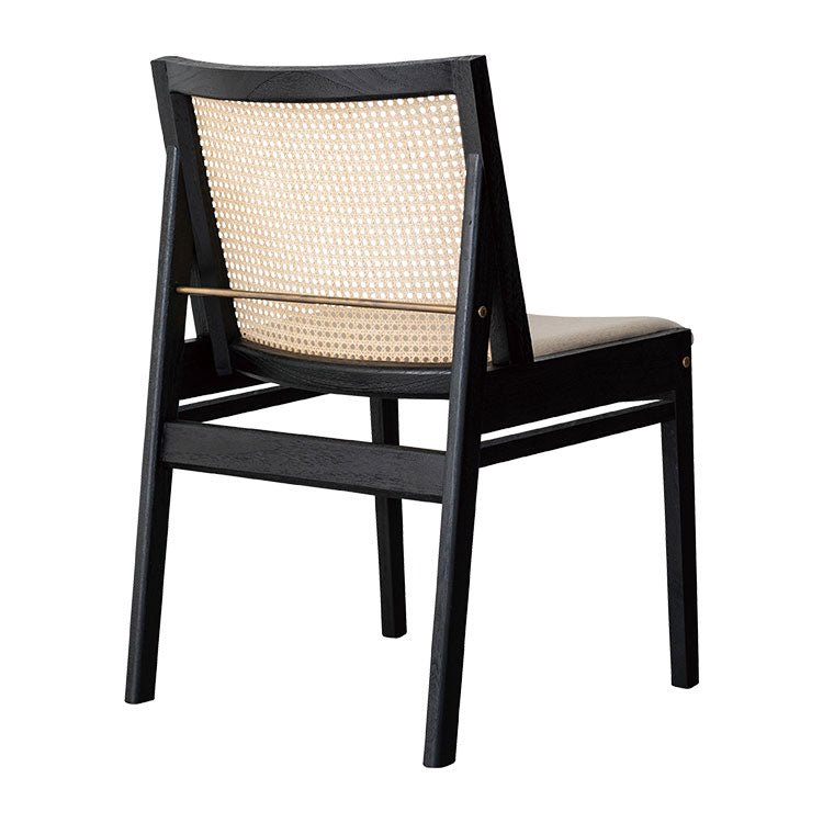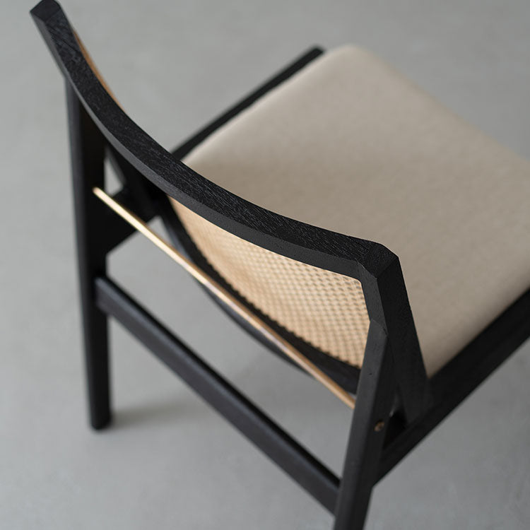 異素材のコントラストが美しいダイニングチェア 背に張り込まれたラタンは背中にそうように湾曲し、 快適な座りを生み出します