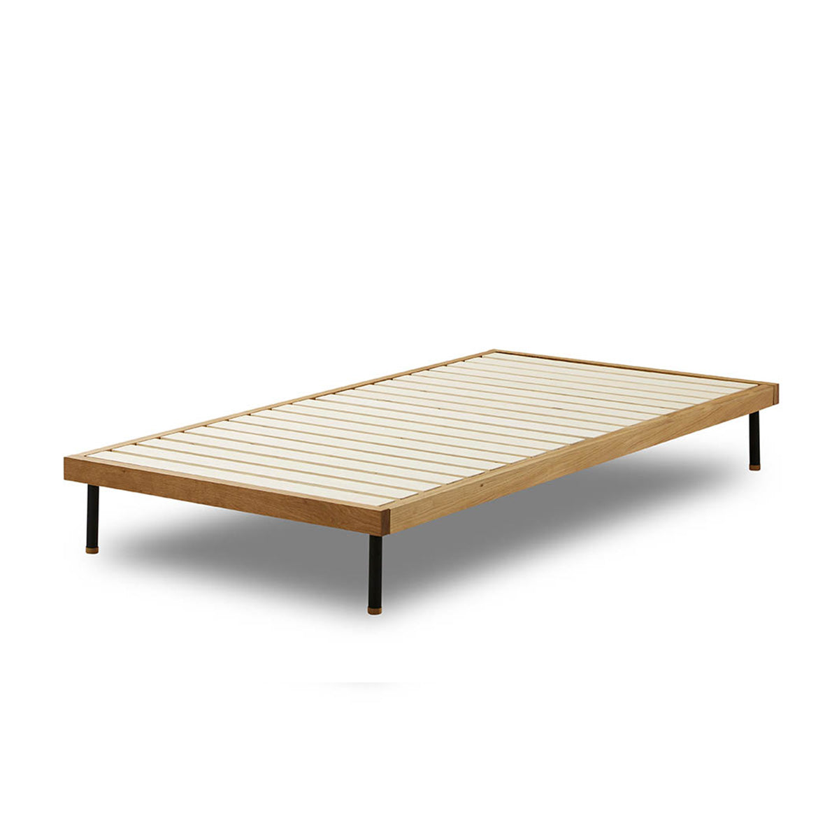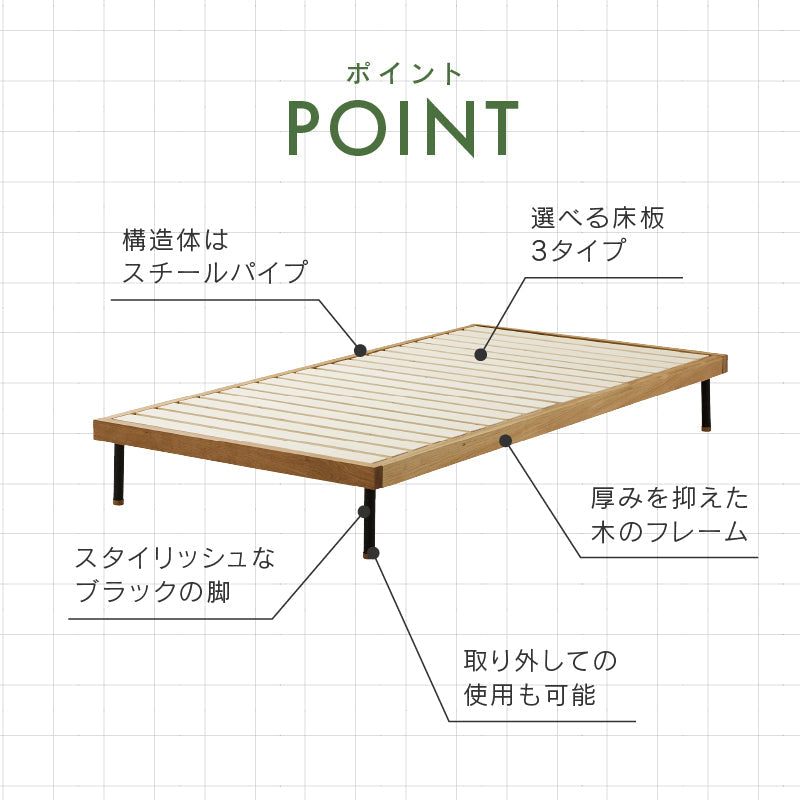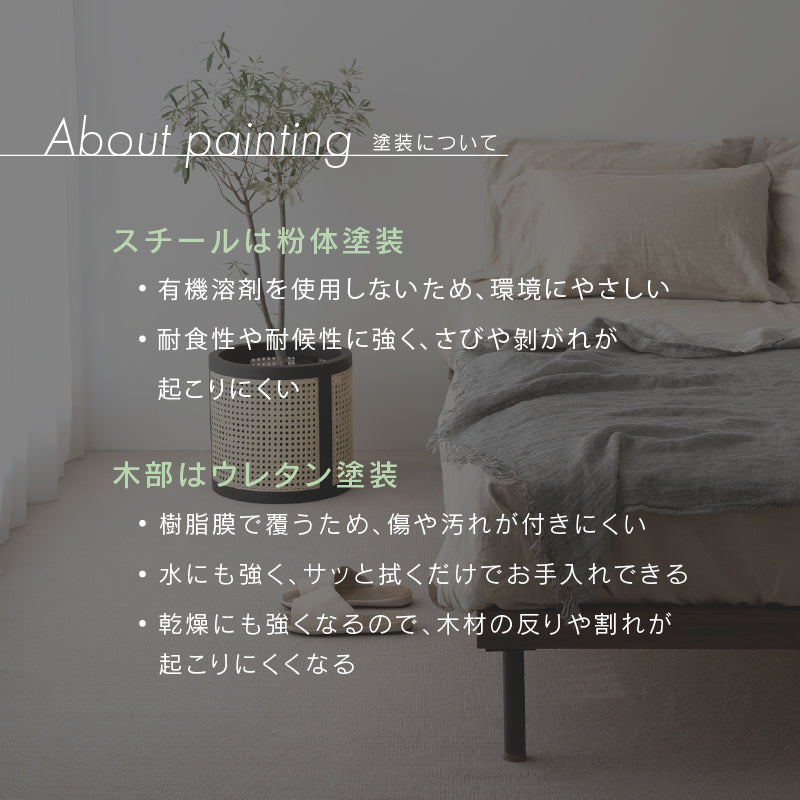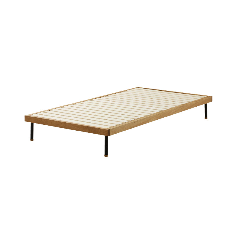 商品情報 寝室はシンプルで落ち着く空間に。 木製のベッドフレームを構造から見直し、よりシンプルで使いやすいベッドフレームを追求しました。 フレーム部分は木でありながら、厚みを抑え、すっきりとした印象に。 サイドフレームにはスチールパイプを採用し、強度面にも配慮し設計されています。 スッと伸びた細身のスチール脚は、脚先の無垢がアクセント。