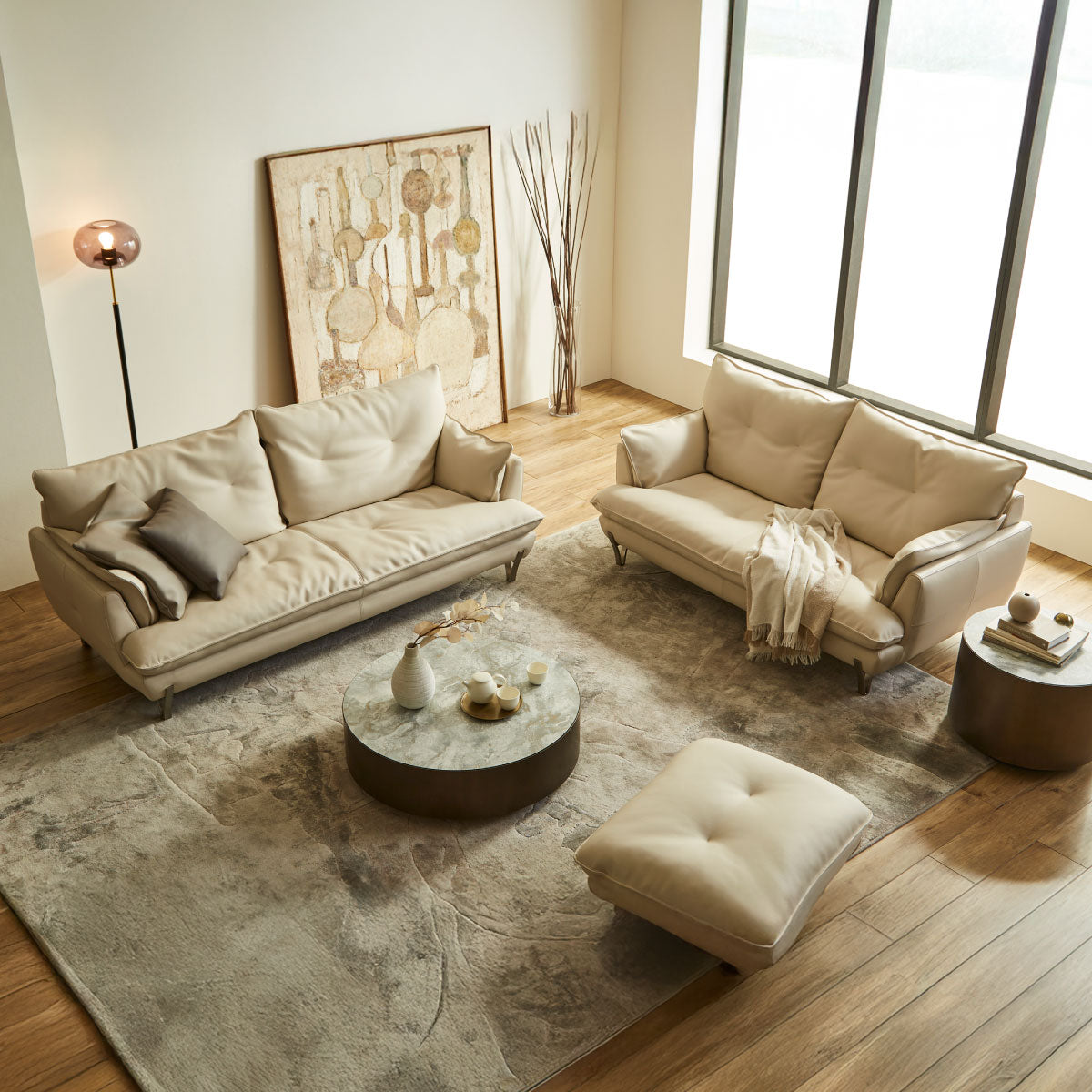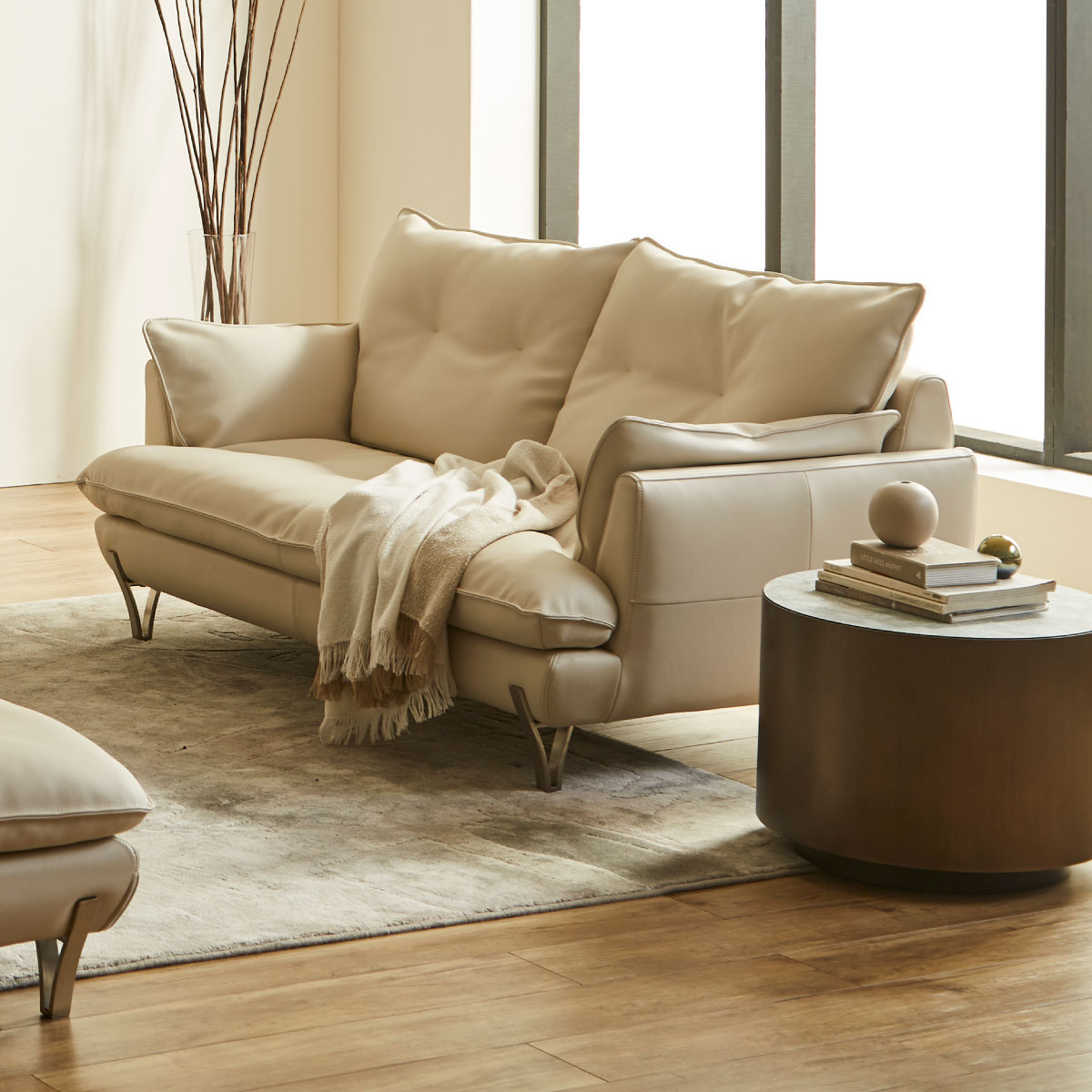 シャープな脚がソファ全体を引き締め、モダンな雰囲気を演出。