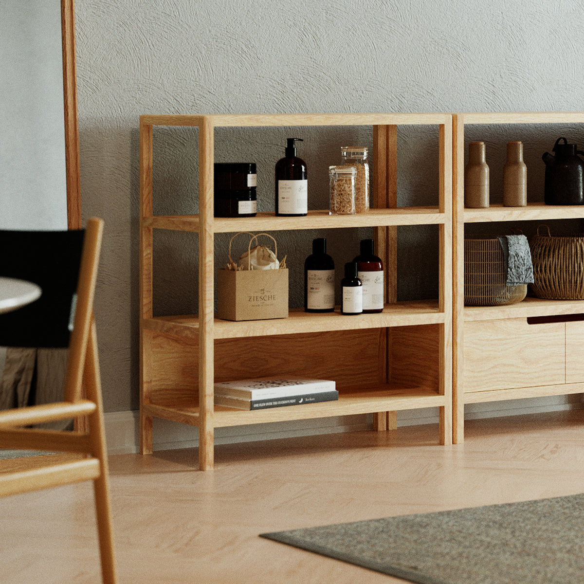 木目の美しさを引き立てるシンプルなデザインで、ナチュラルな空間に調和します。