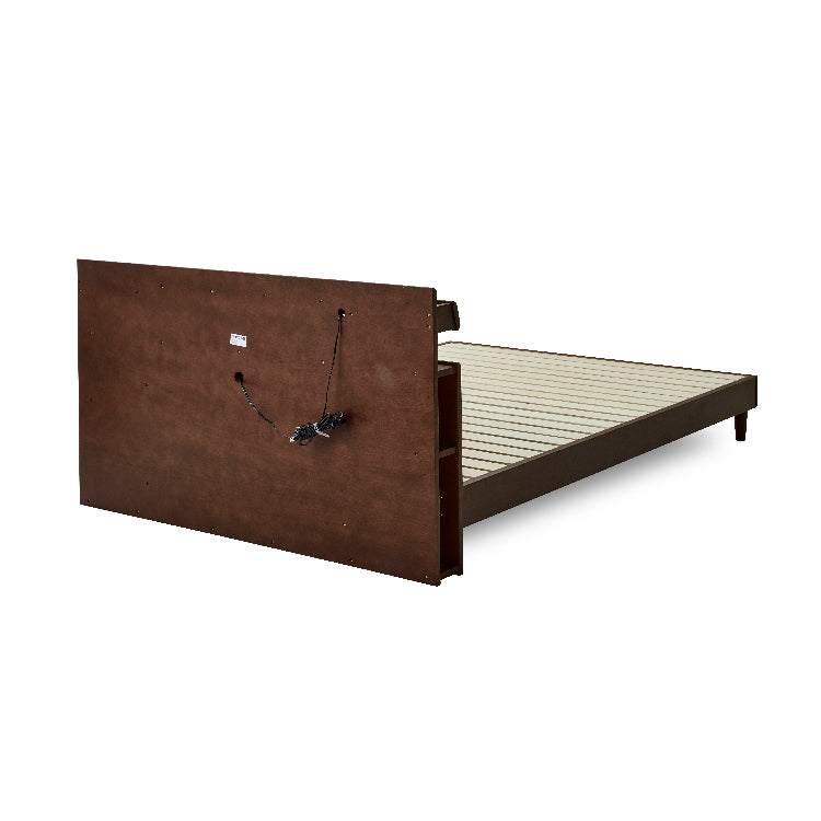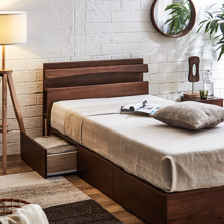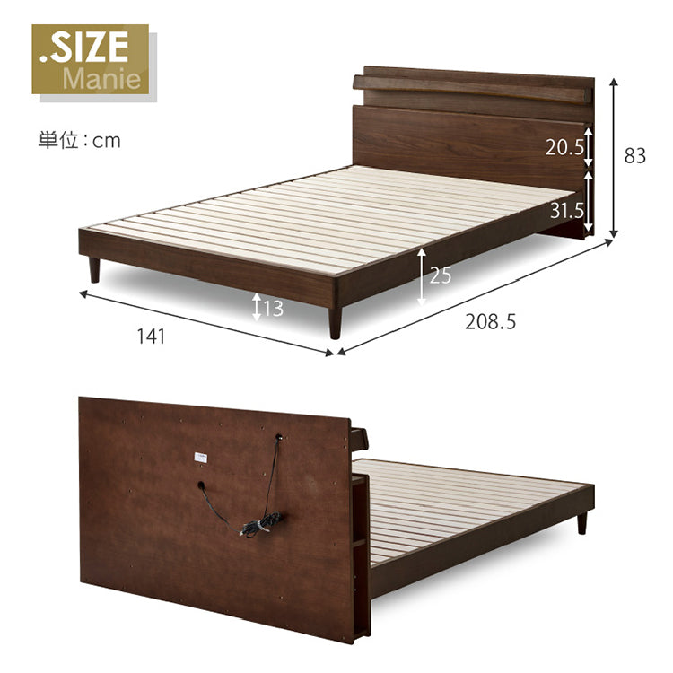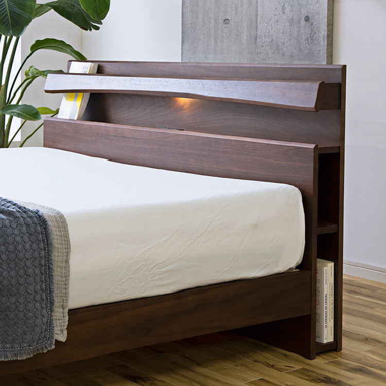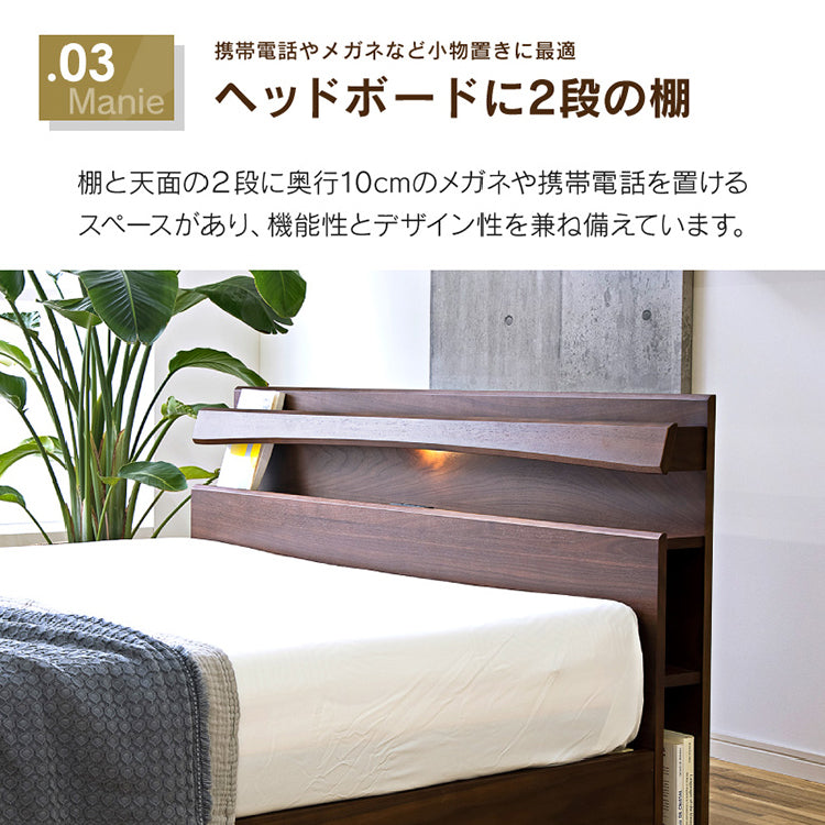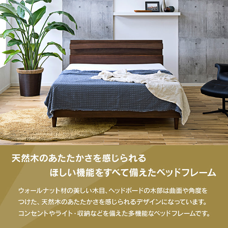 商品情報 ウォールナット材の美しい木目、ヘッドボードの木部は曲面や角度をつけた、天然木のあたたかさを感じられるデザインになっています。 ヘッドボードの天面・棚の2段にめがねや携帯電話をおけるスペースがあり、機能性とデザイン性を兼ね備えています。 照明や充電に便利な2口コンセント、タブレットや雑誌を立てられるブックラック、ヘッドボード側面にも収納があり、欲しい機能が充実しています。