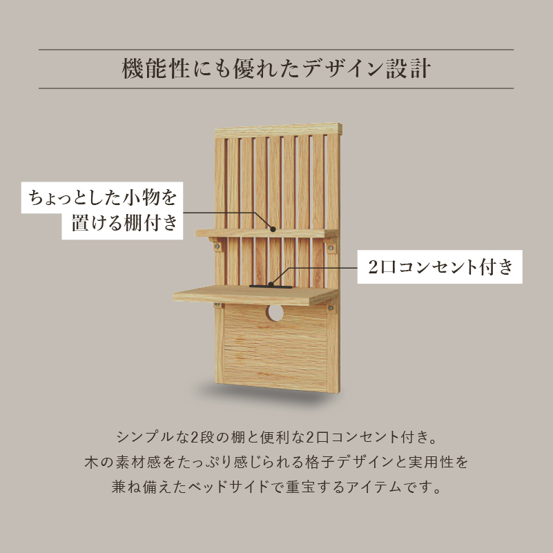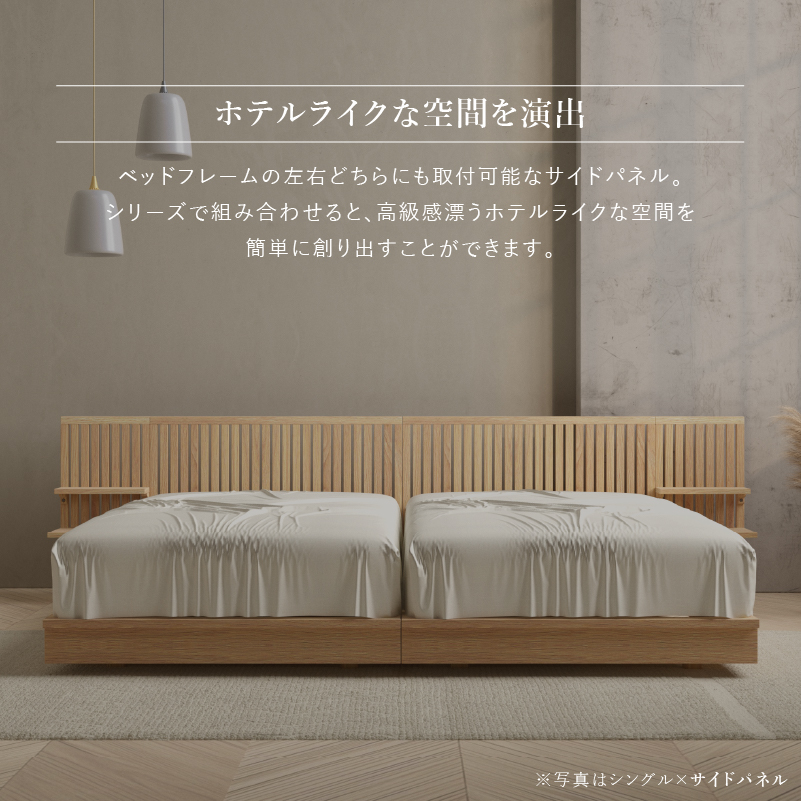 商品情報 ベッドフレームに組み合わせると一気にホテルライクな空間にしてくれるヘッドサイドパネル。シンプルな棚板付きで、見た目の演出のみならず小物を置く場所としても重宝します。 また、2口コンセント付きのためベッドフレームに追加すると見た目の華やかさのみでなく実用性もアップします。