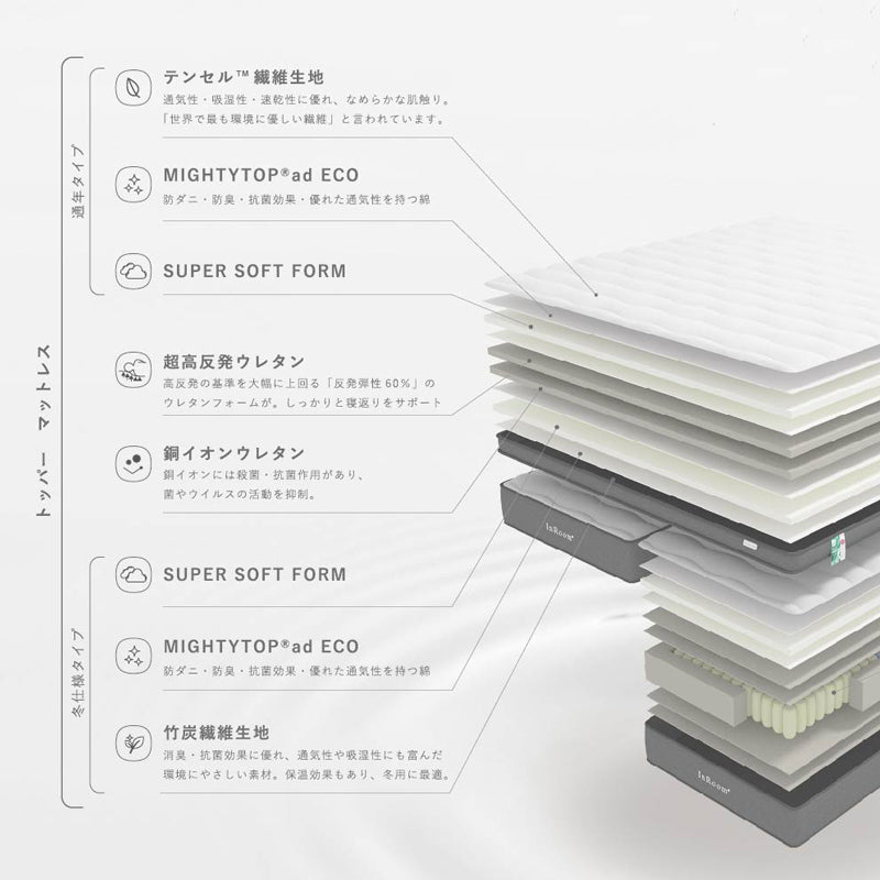 マットレスは無理に折り曲げないでください。両面仕様のアイテムは、2~3ヶ月に1度、上下の向きや天地裏表を変えして頂くと、より長持ちします。