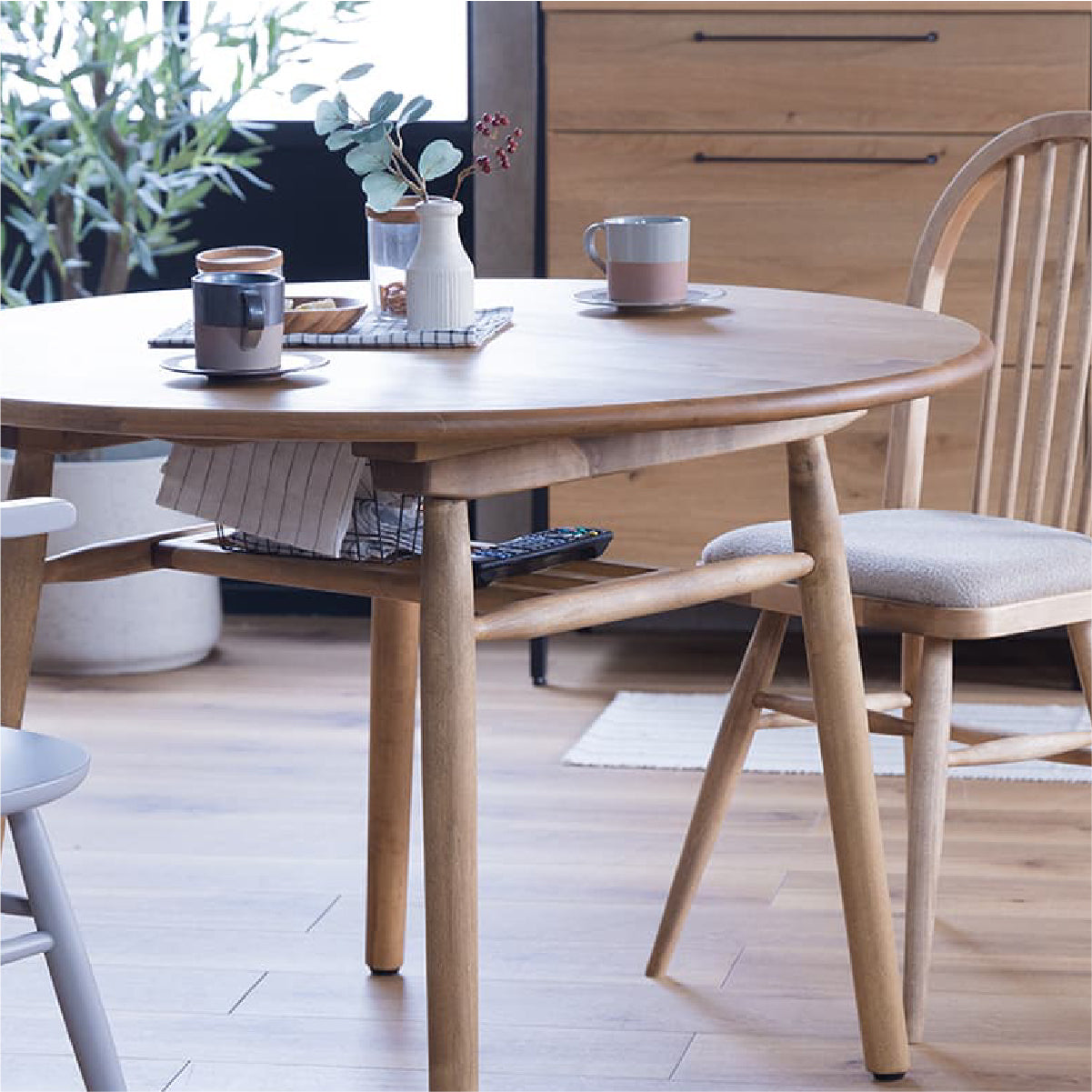 丸型90・105cm、長方形140cmの3サイズ展開。空間や人数に合わせてお選びいただけます。