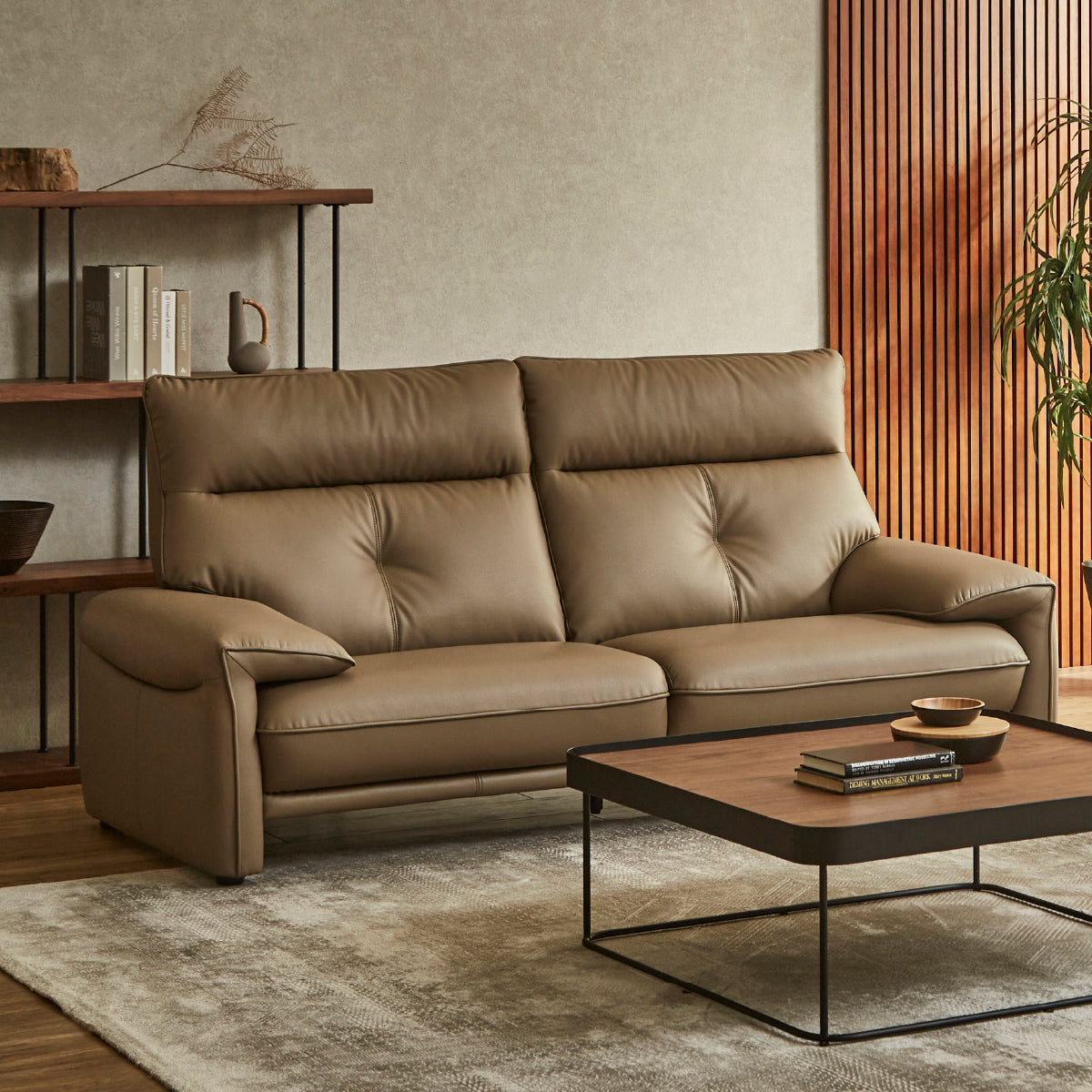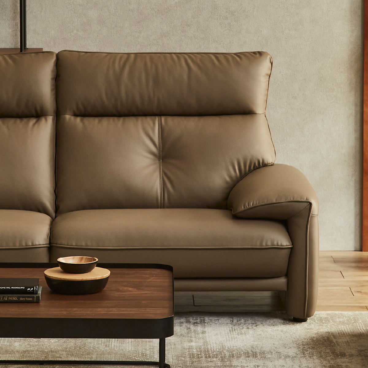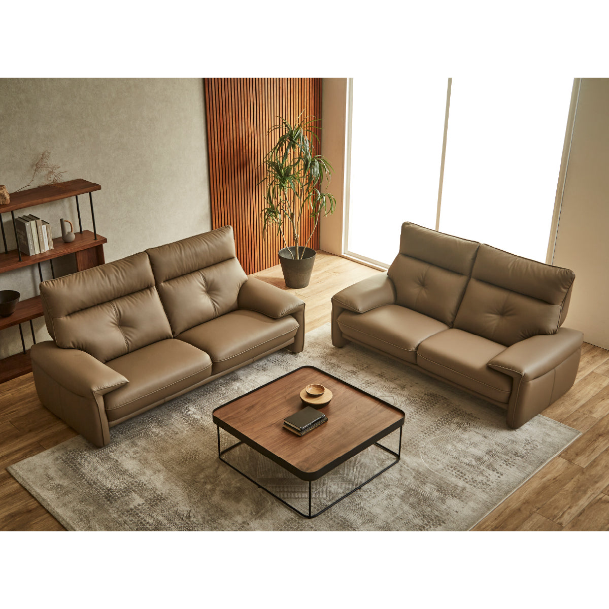 重厚感と洗練されたデザインが融合したソファ。内側に折れ曲がった肘、背フレームの曲線が特長です。