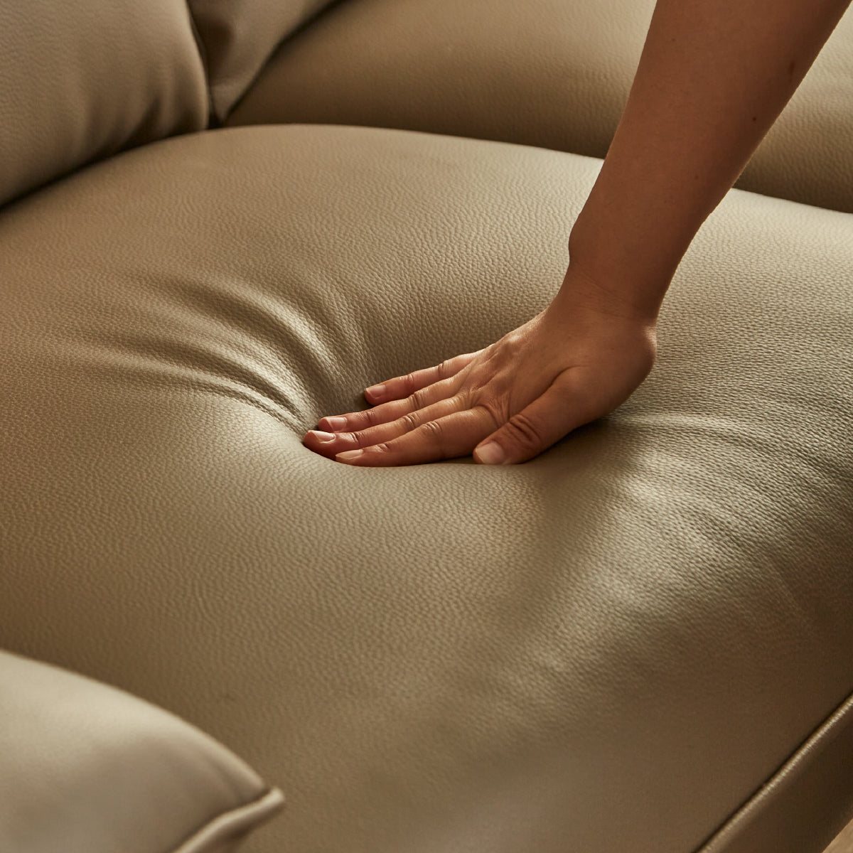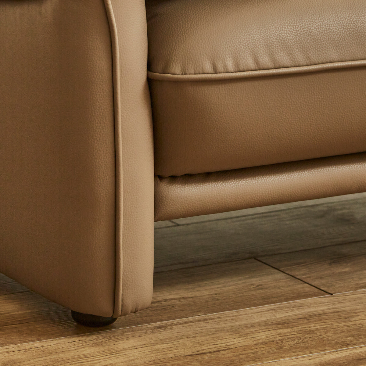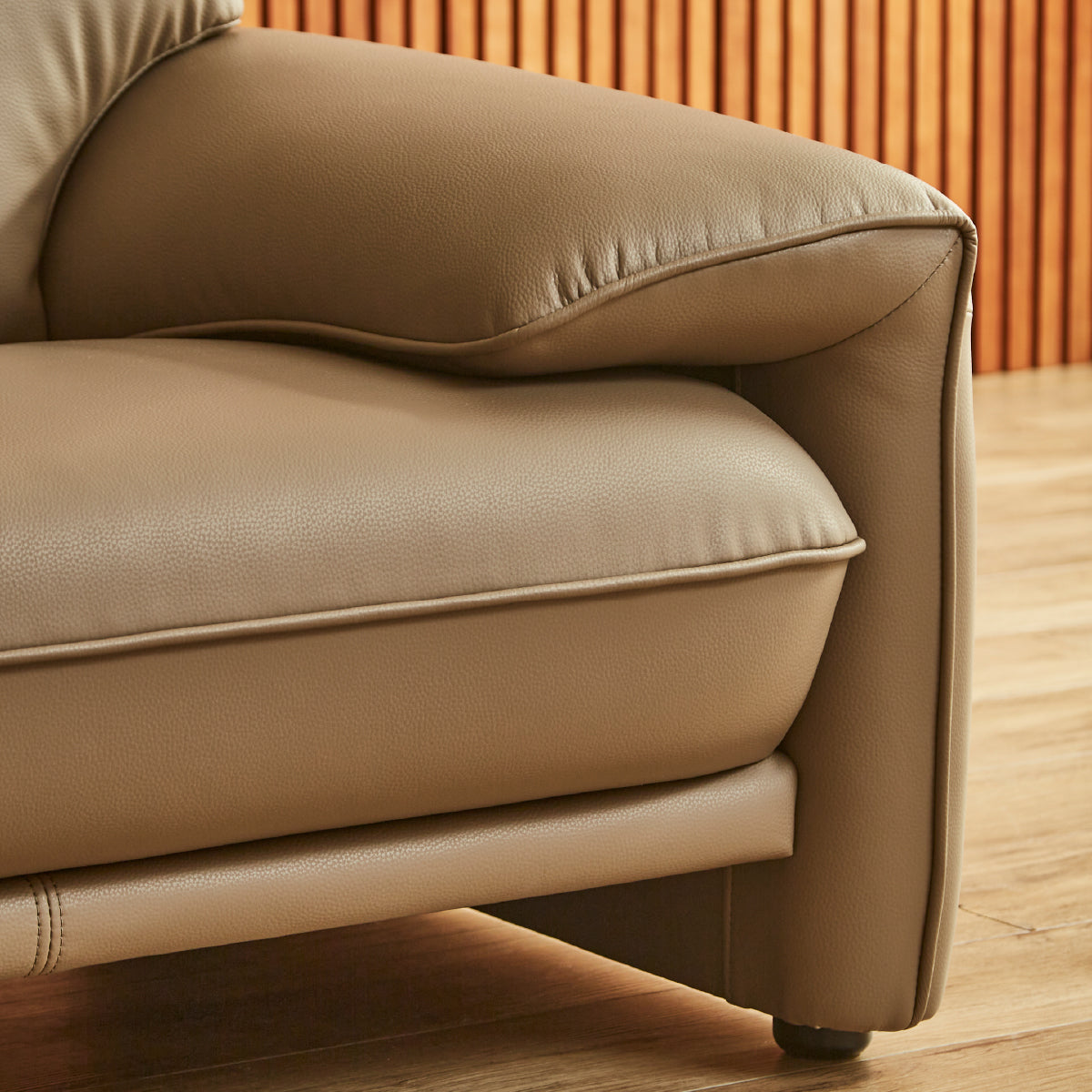 重厚感と洗練されたデザインが融合したソファ。内側に折れ曲がった肘、背フレームの曲線が特長です。