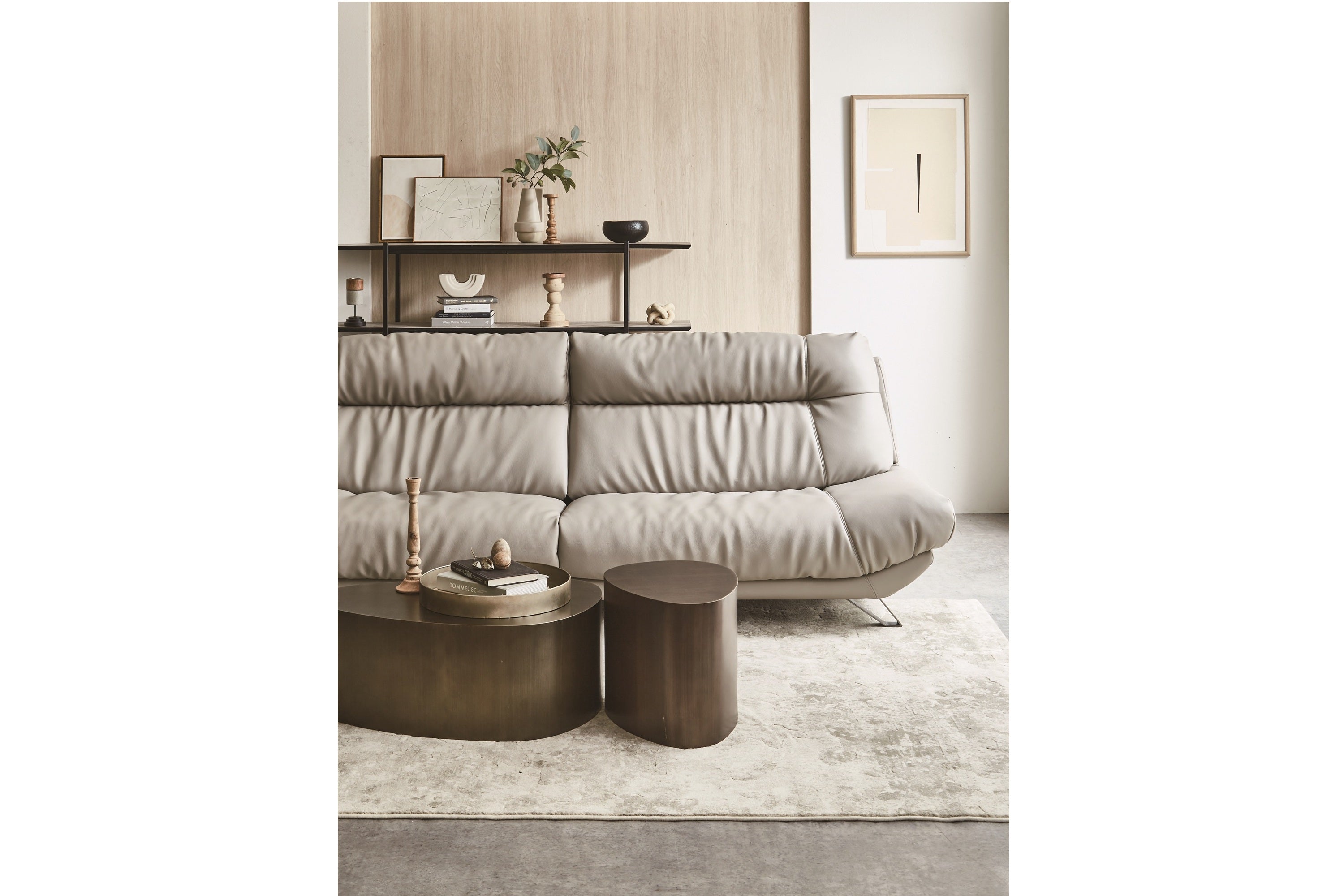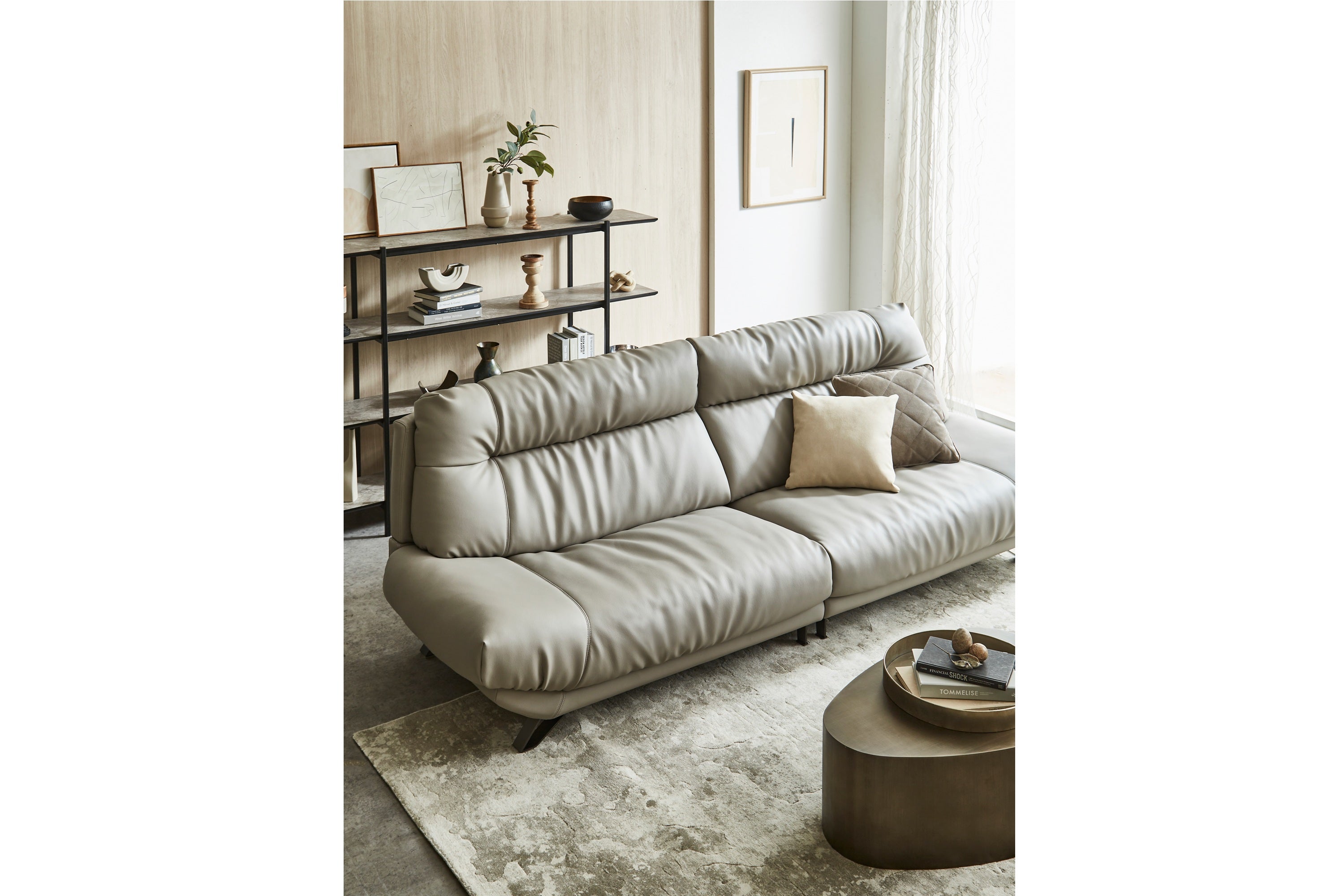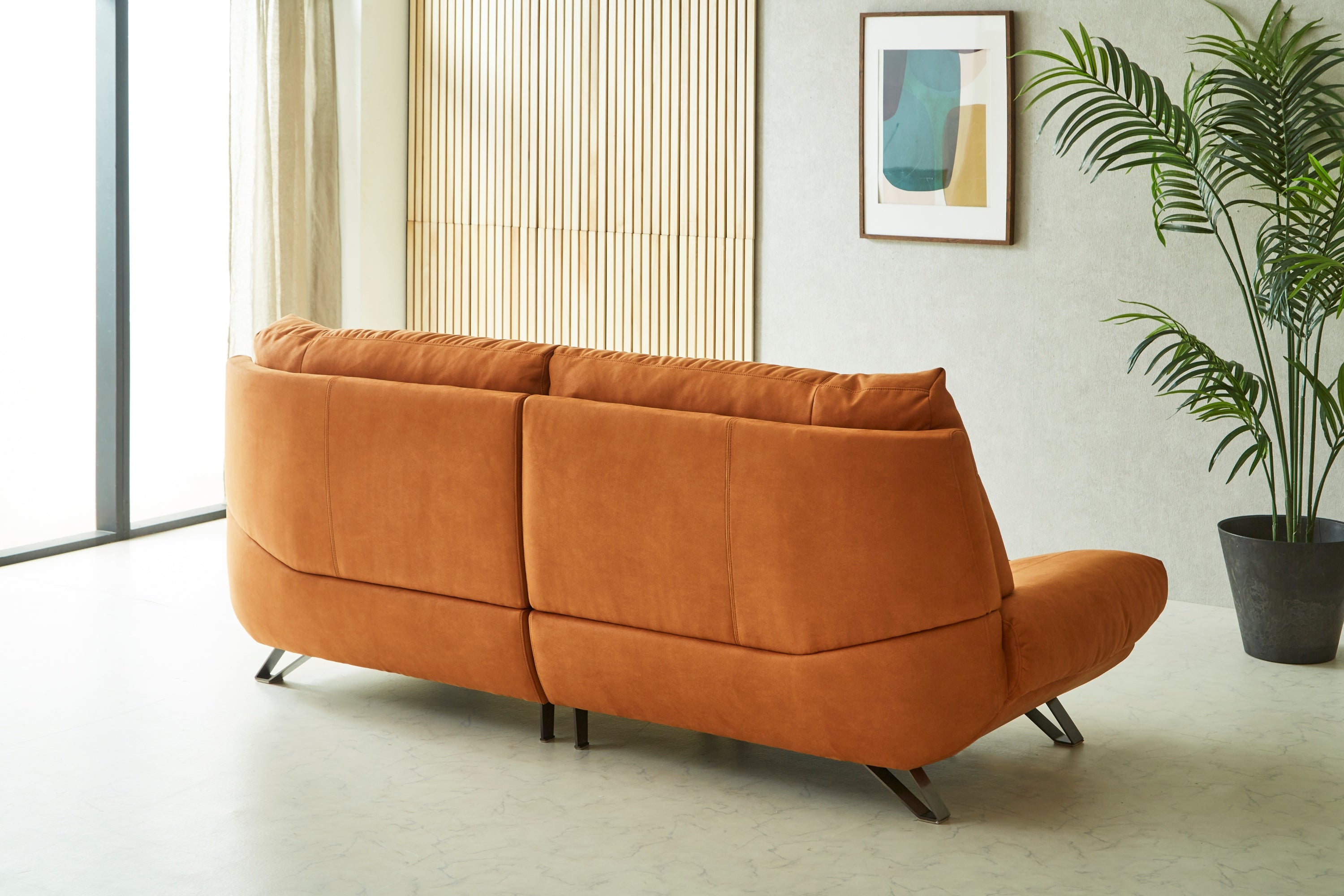 ソファの中央についている脚は、人が座った時に床に接地する構造で、 あくまで荷重がかかった時の補強用のものでございますので、浮いている状態が正常になります。