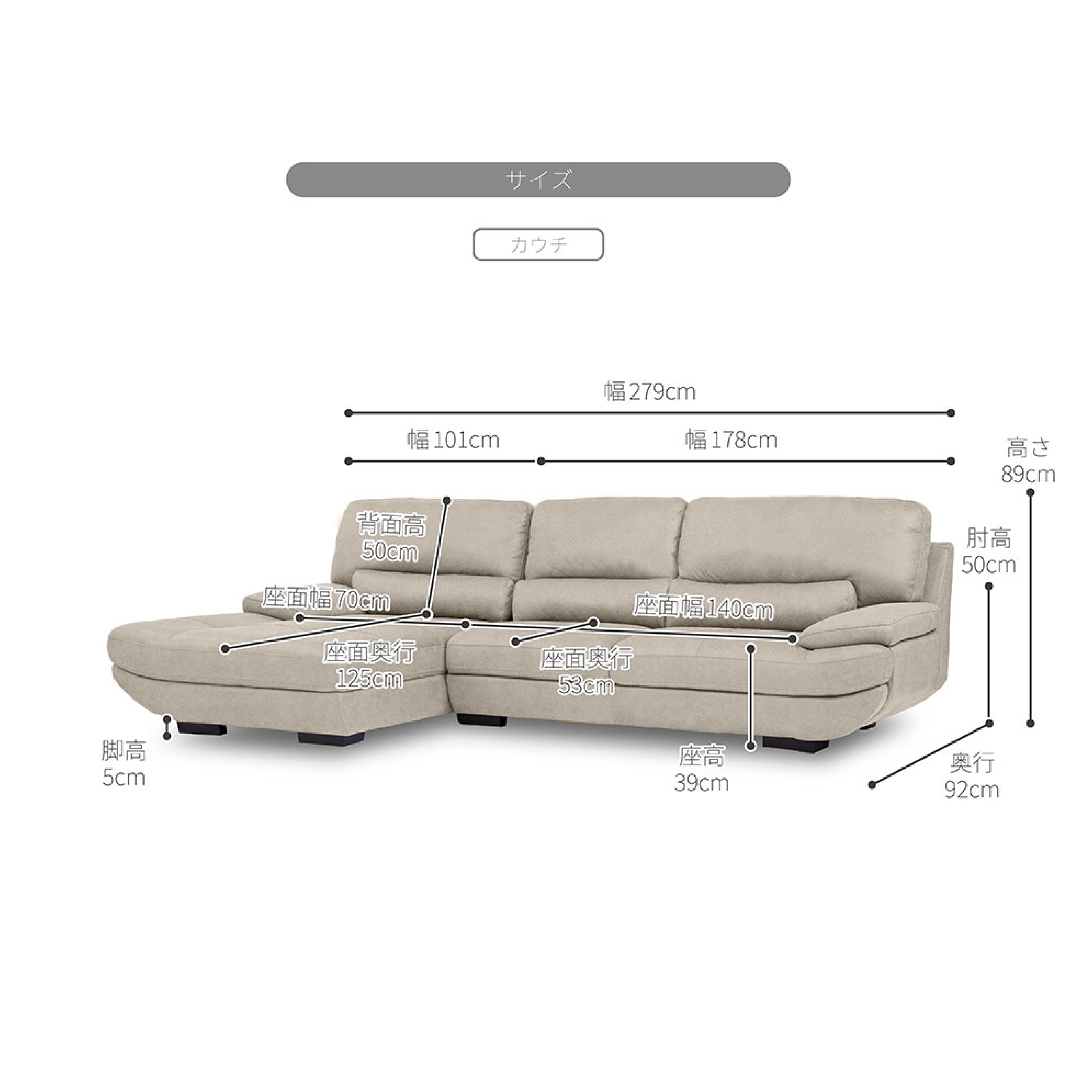商品サイズ 幅279.0 × 奥行92.0〜奥行164.0 × 高さ89.0cm