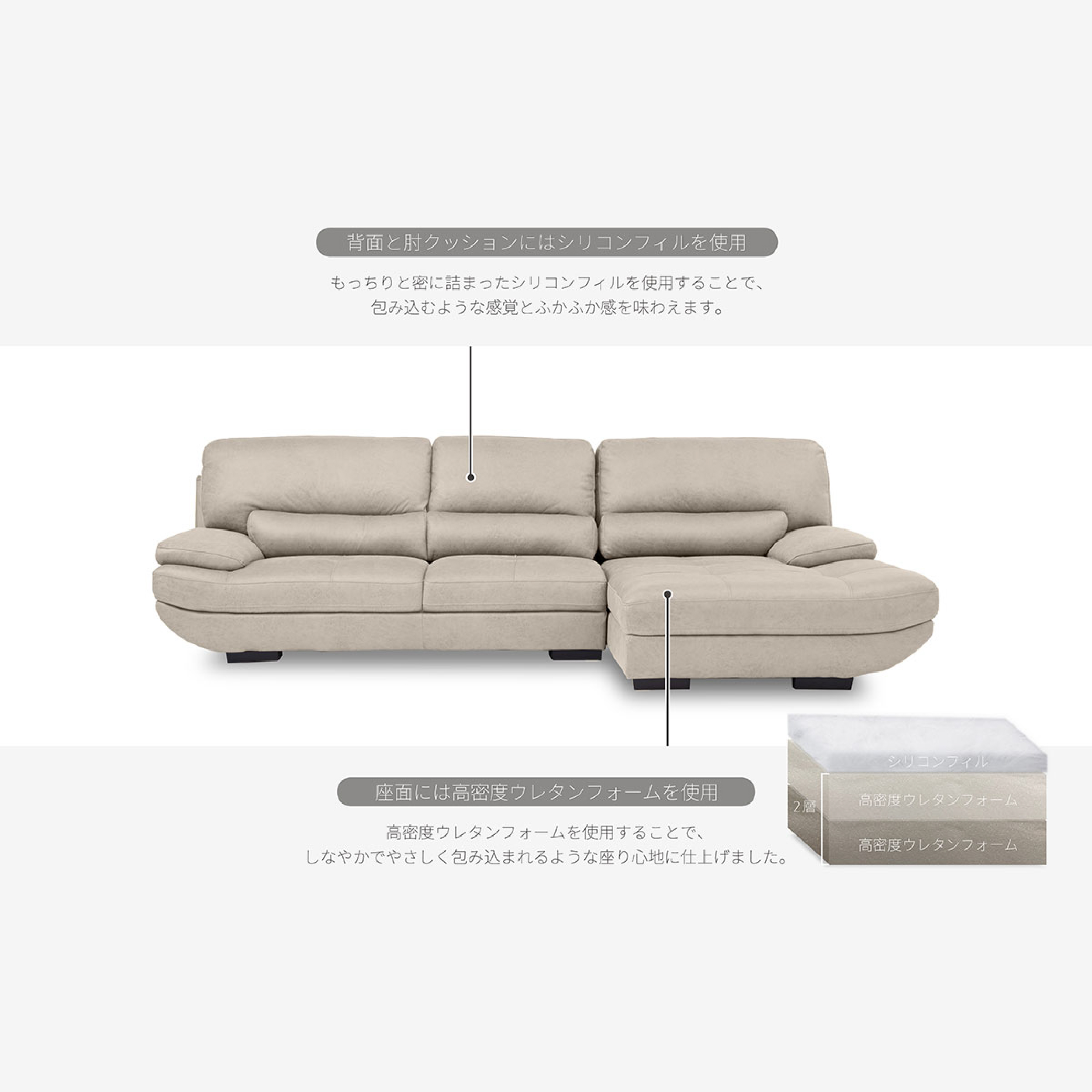 本体構造 座面:Sバネ/高密度ウレタンフォーム 背面:シリコンフィル