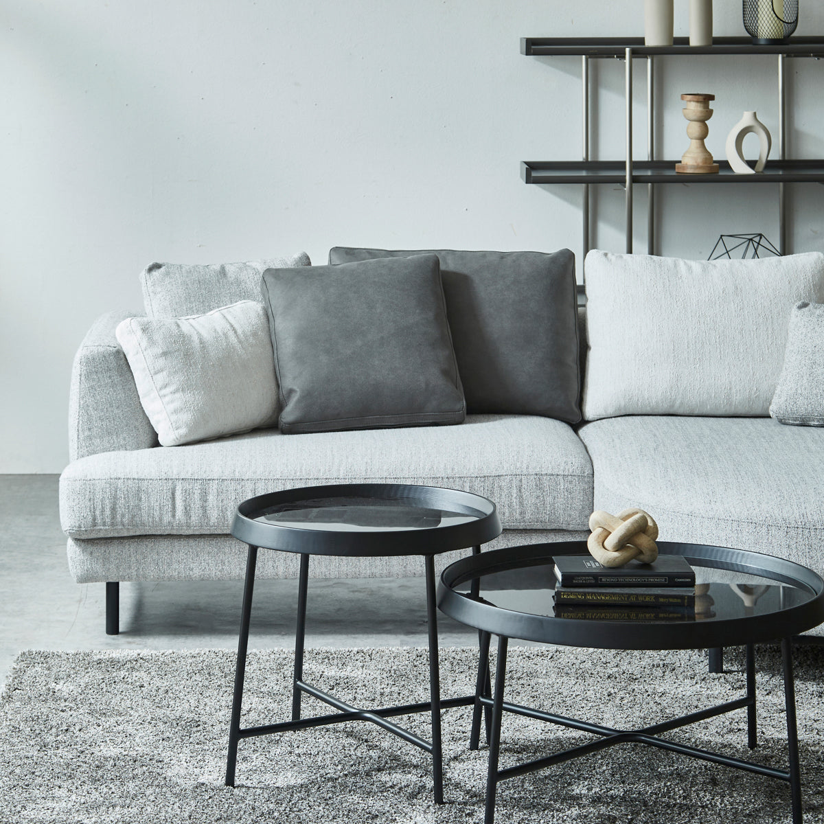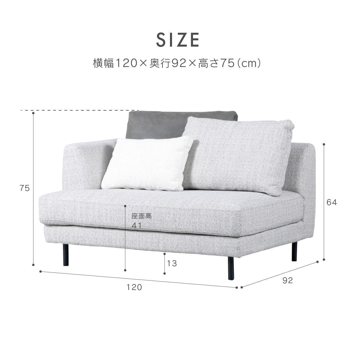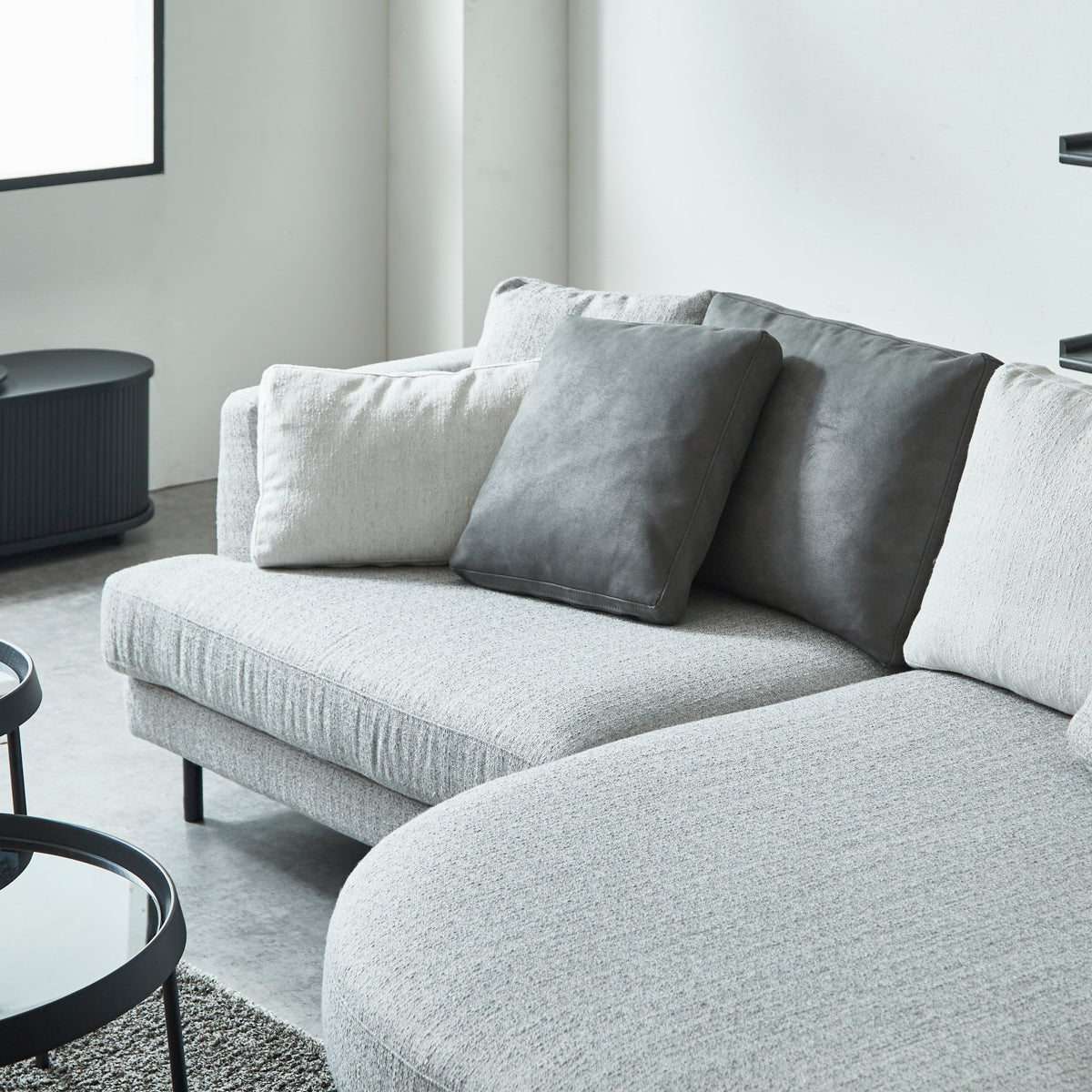 商品情報 張地や大きさの異なる背クッションは、空間にアクセントをもたらし、座り方に合わせてクッションを自由にくつろげます。 ベーシックなグレー系のファブリックとブラックの脚で、様々なインテリアに馴染みやすいデザインです。