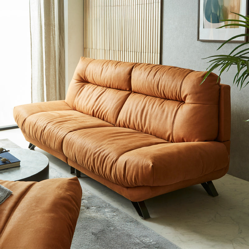 ソファの中央についている脚は、人が座った時に床に接地する構造で、 あくまで荷重がかかった時の補強用のものでございますので、浮いている状態が正常になります。