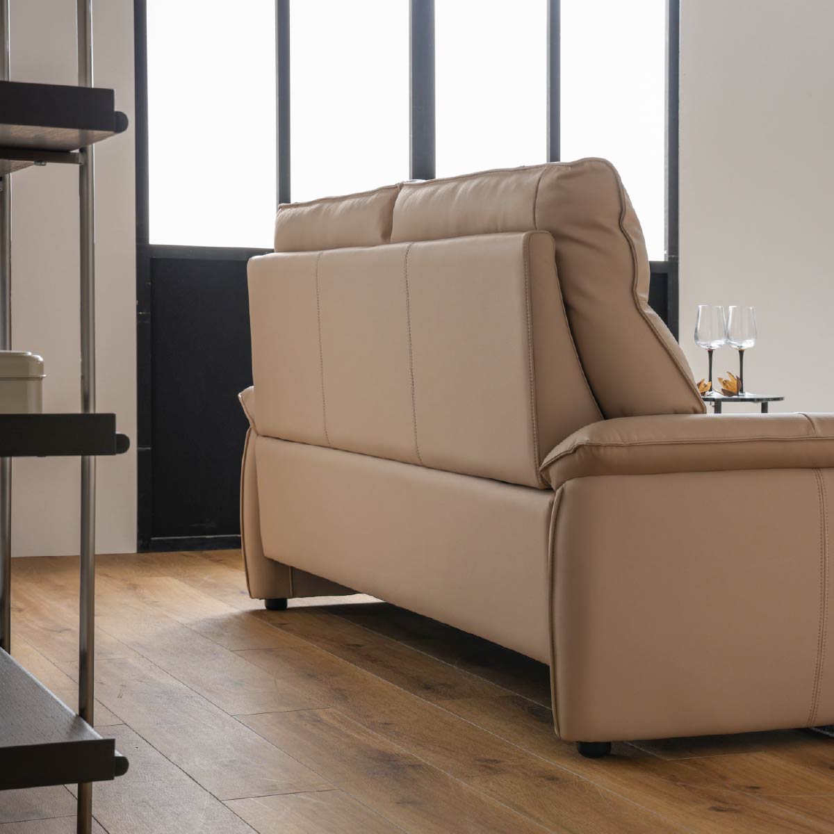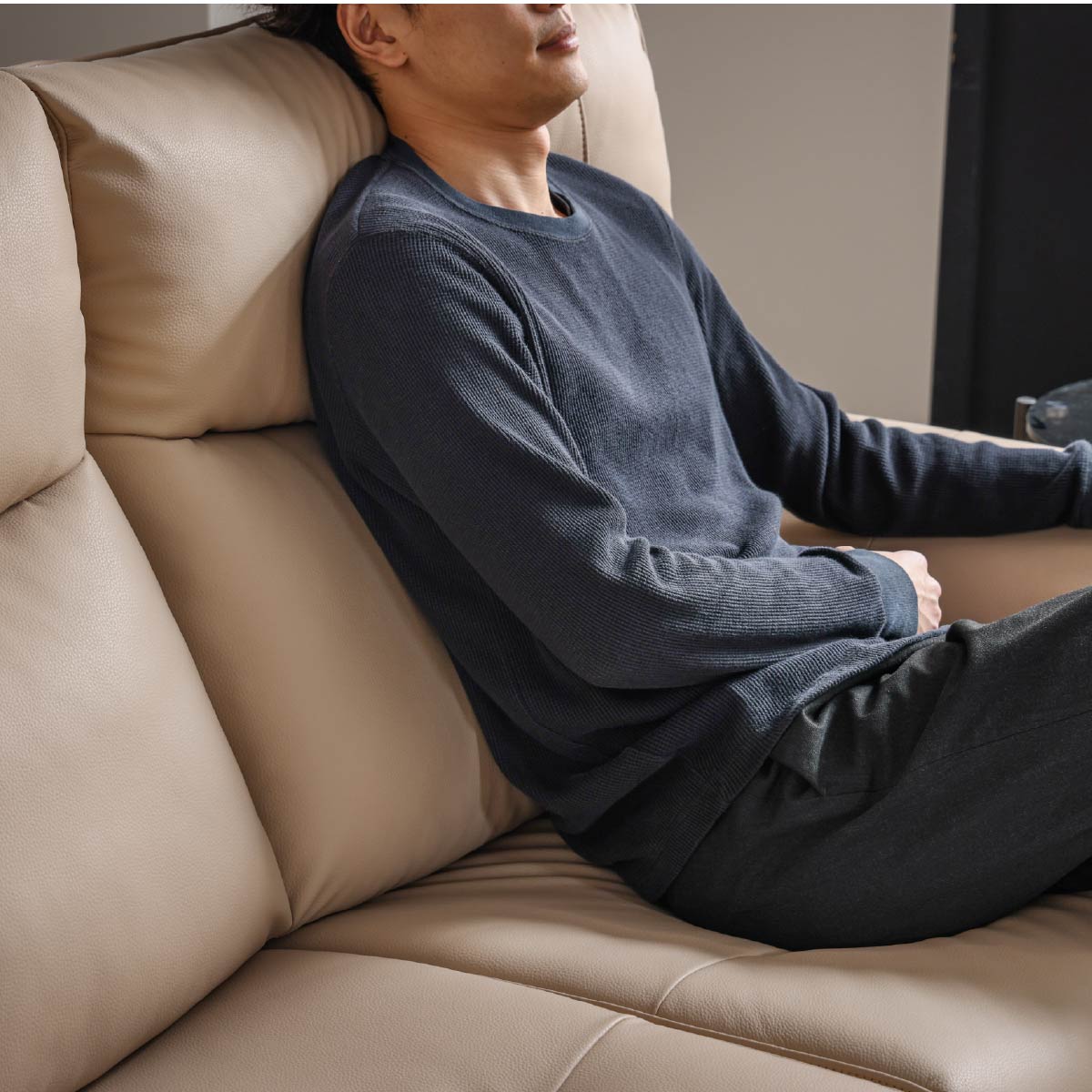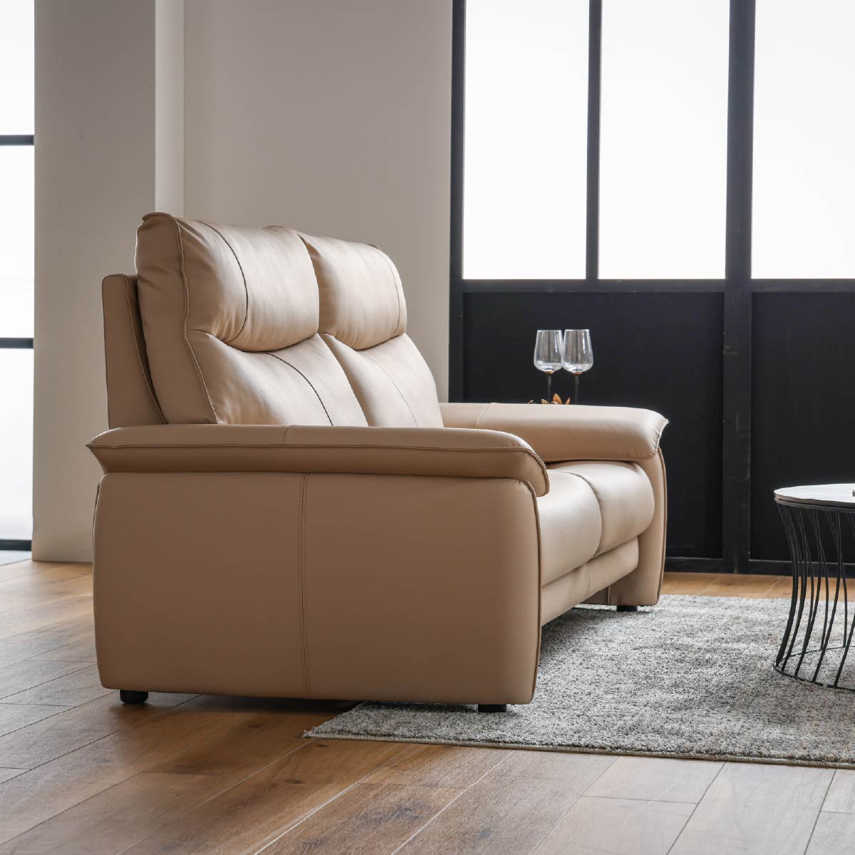 商品情報 上質なリラックス感と現代的なドイツデザインを融合させた逸品です。頭部の位置、背中の角度が計算されたハイバックデザインが、長時間の着座、心地良い座り心地を提供します。座面は深すぎず、女性にも座りやすい適度な奥行を備えています。このソファのボリューム感と洗練されたデザインのバランスが、お部屋に洗練された快適な空間を創出します。