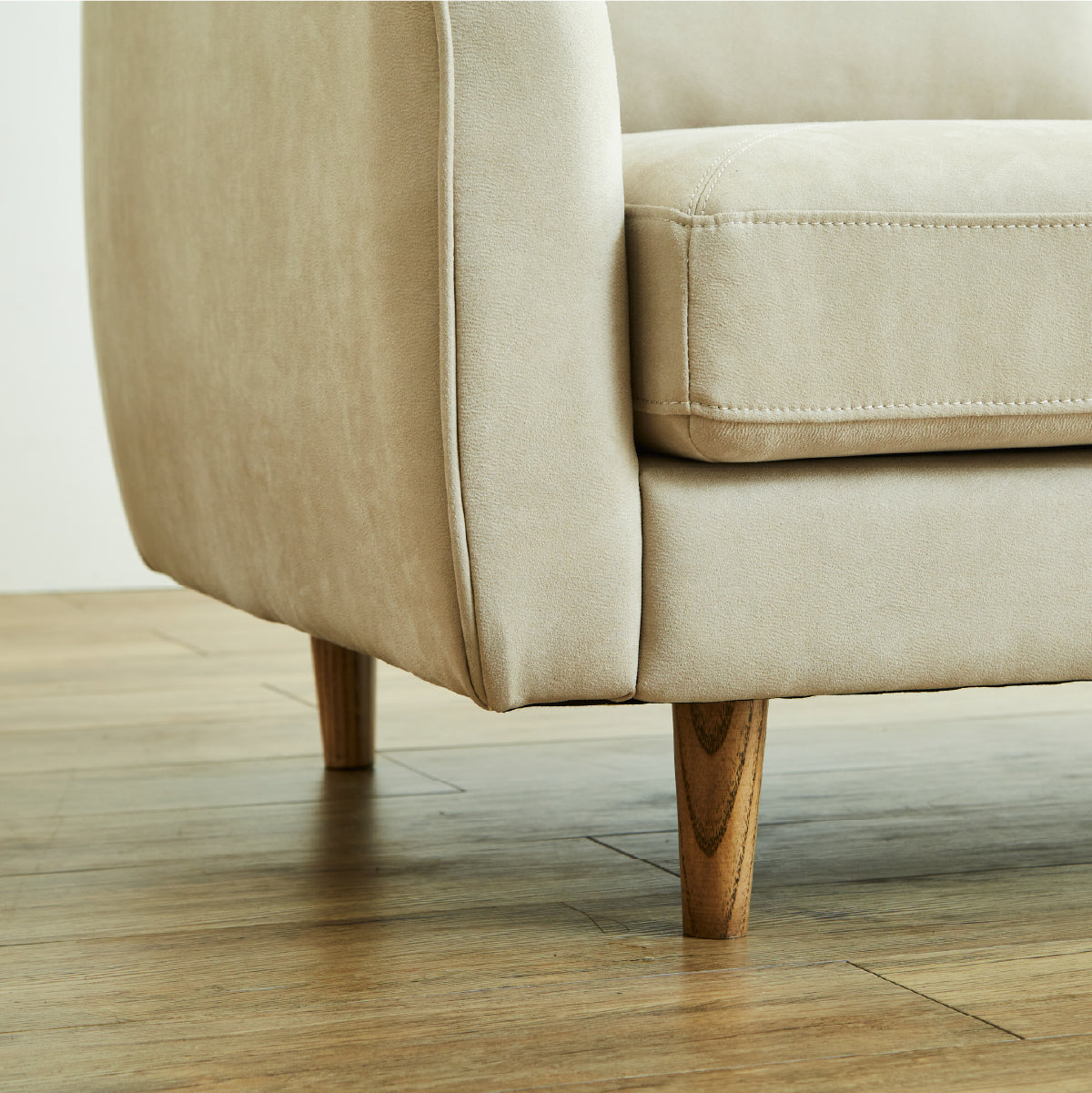 脚はタモ無垢材を使用しており、ナチュラルな木目があたたかみをプラス。脚裏には傷防止のフェルト付き。