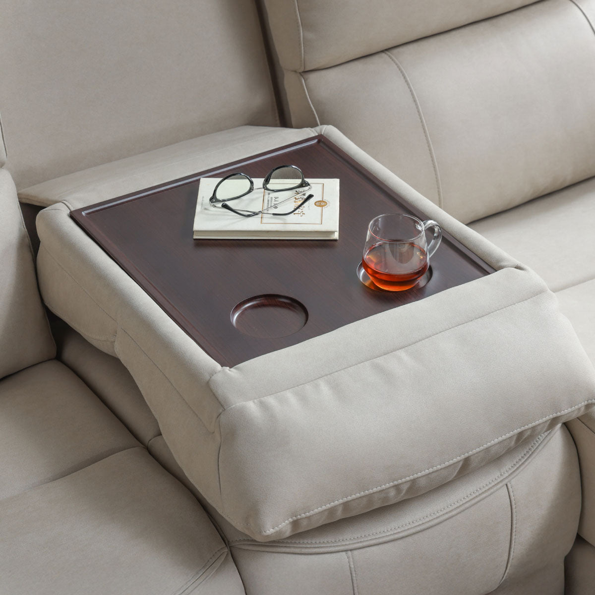 中央の背クッションを前に倒すと、雑誌や飲み物などを置くことができる便利なテーブルが現れます。