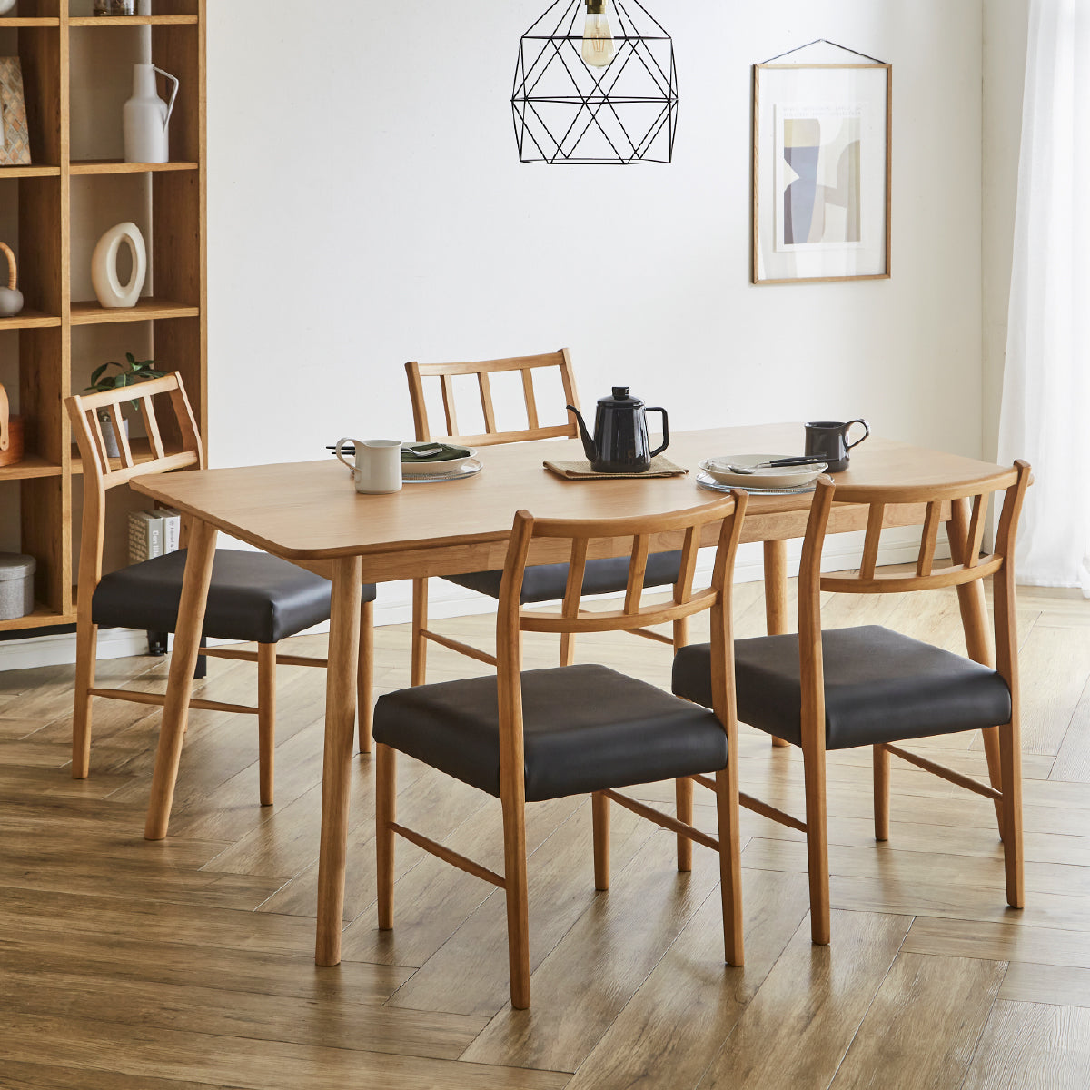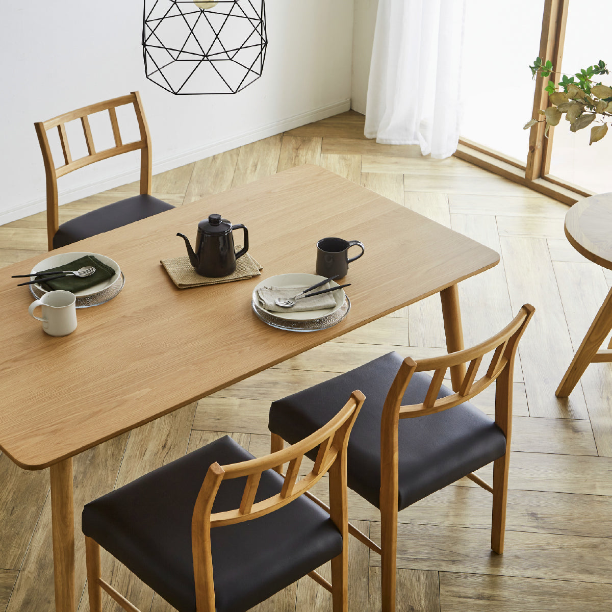 商品情報 天板は質感ある天然木突板を使用、チェアは座面メッシュ+ウェービングベルト仕様で軽量かつ快適に着座できます