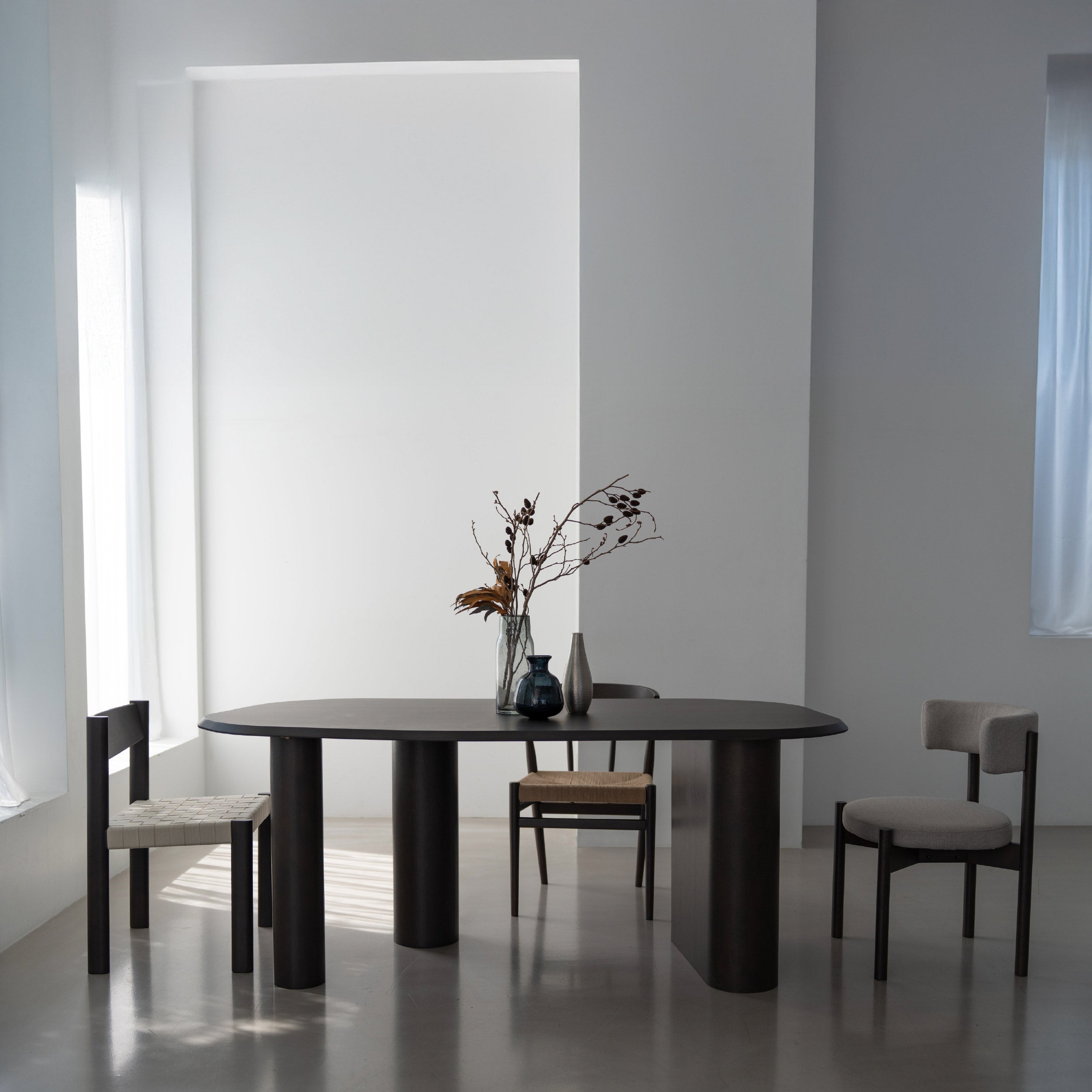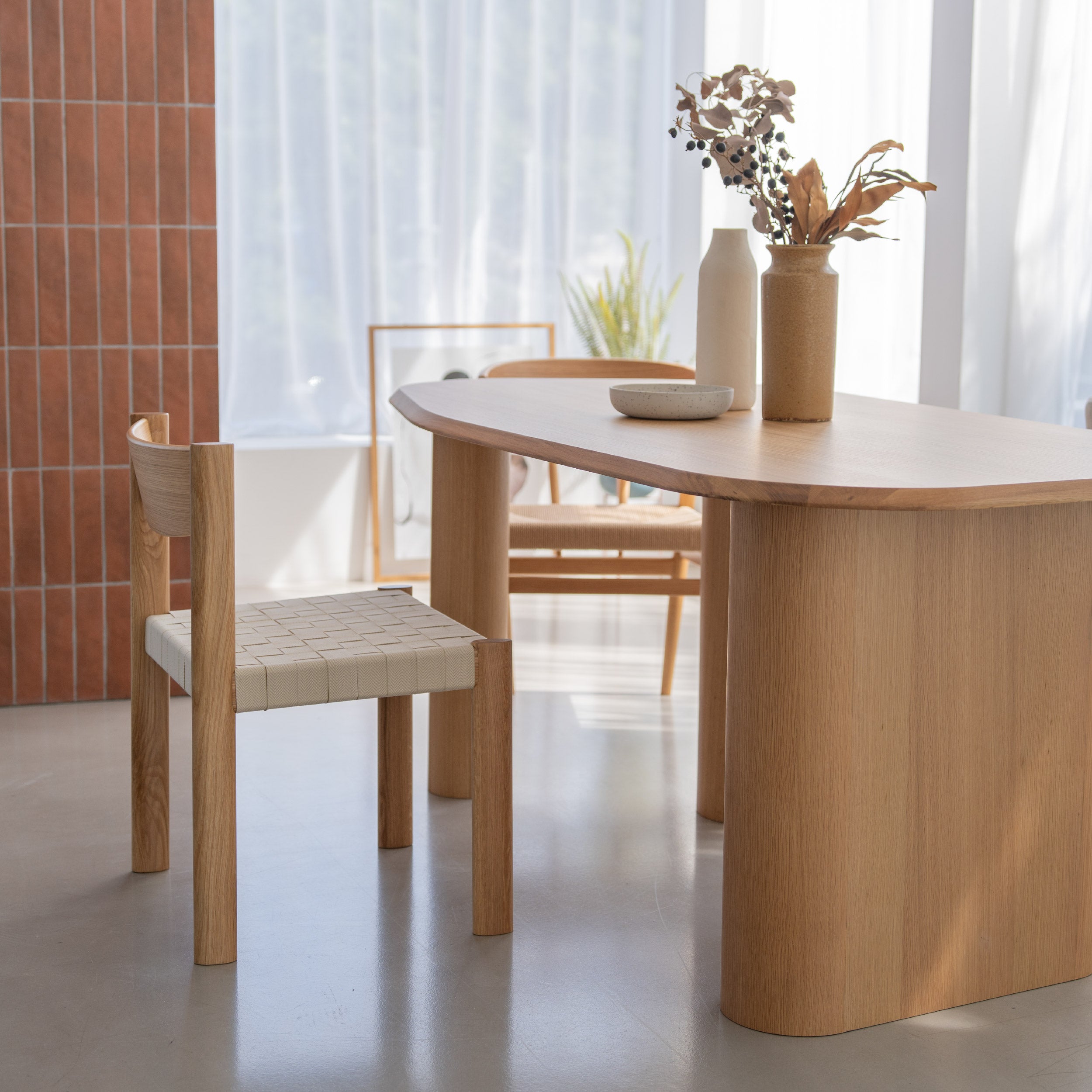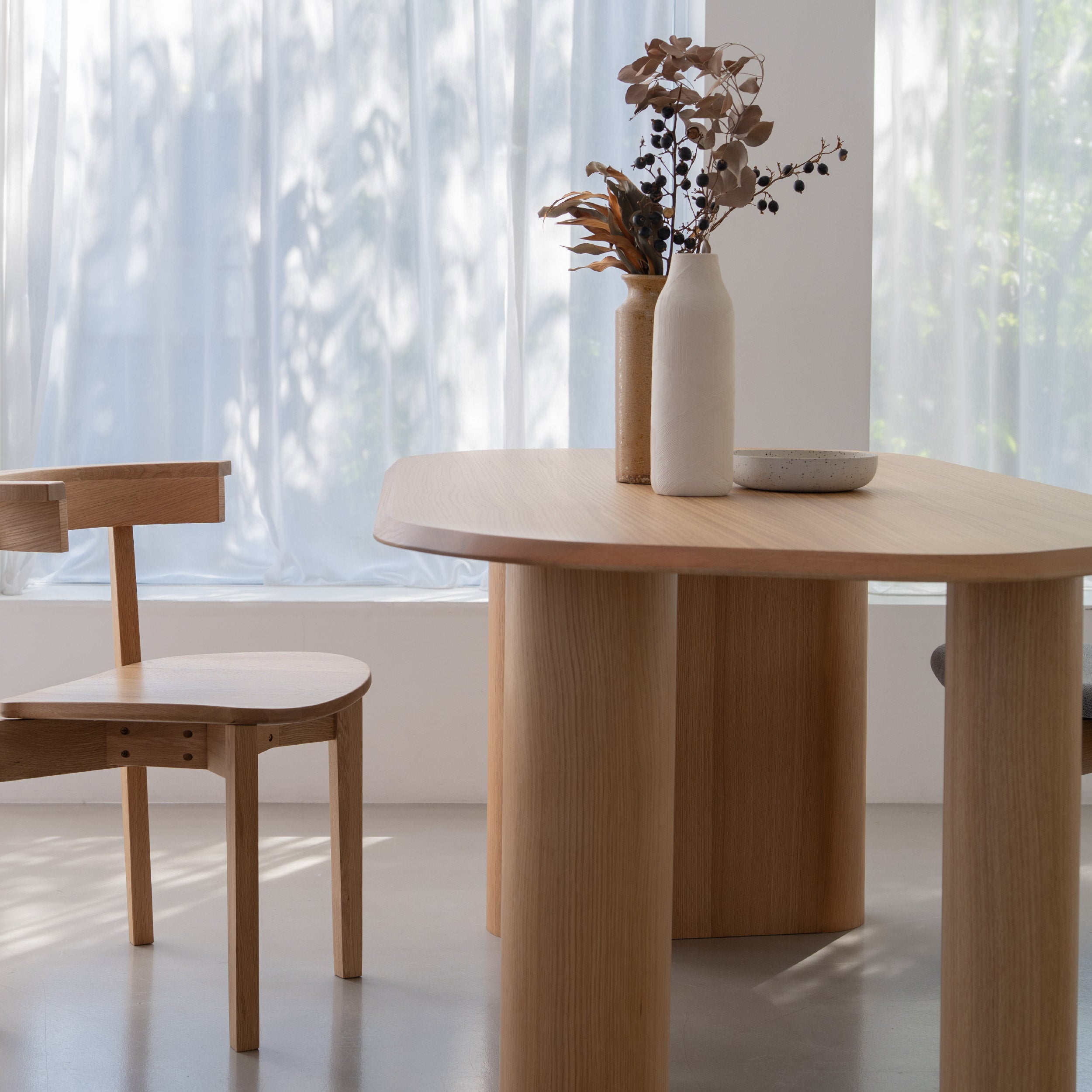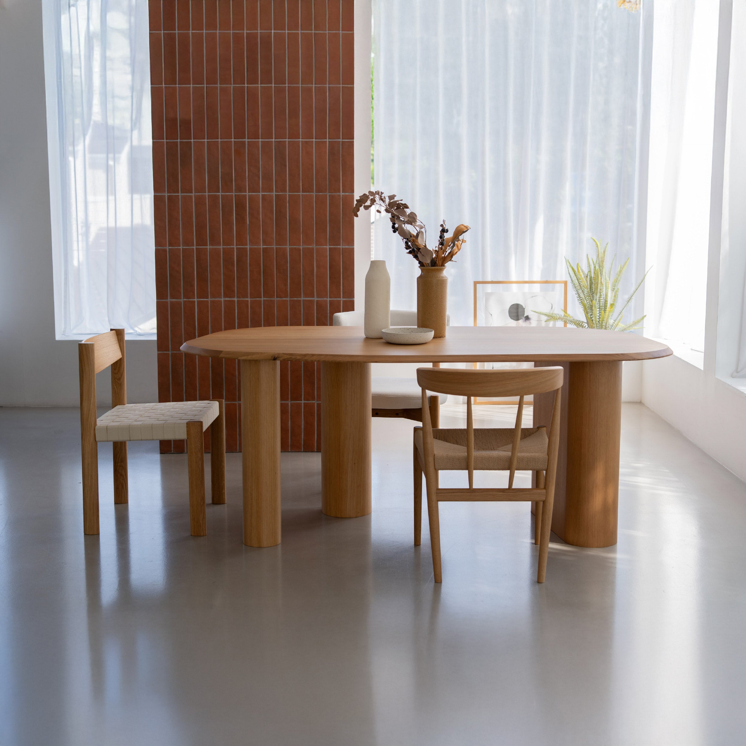 変則的な形の天板は、チェアの置き場所を選ばず、 ダイニングの空間を自由で楽しく演出してくれます。