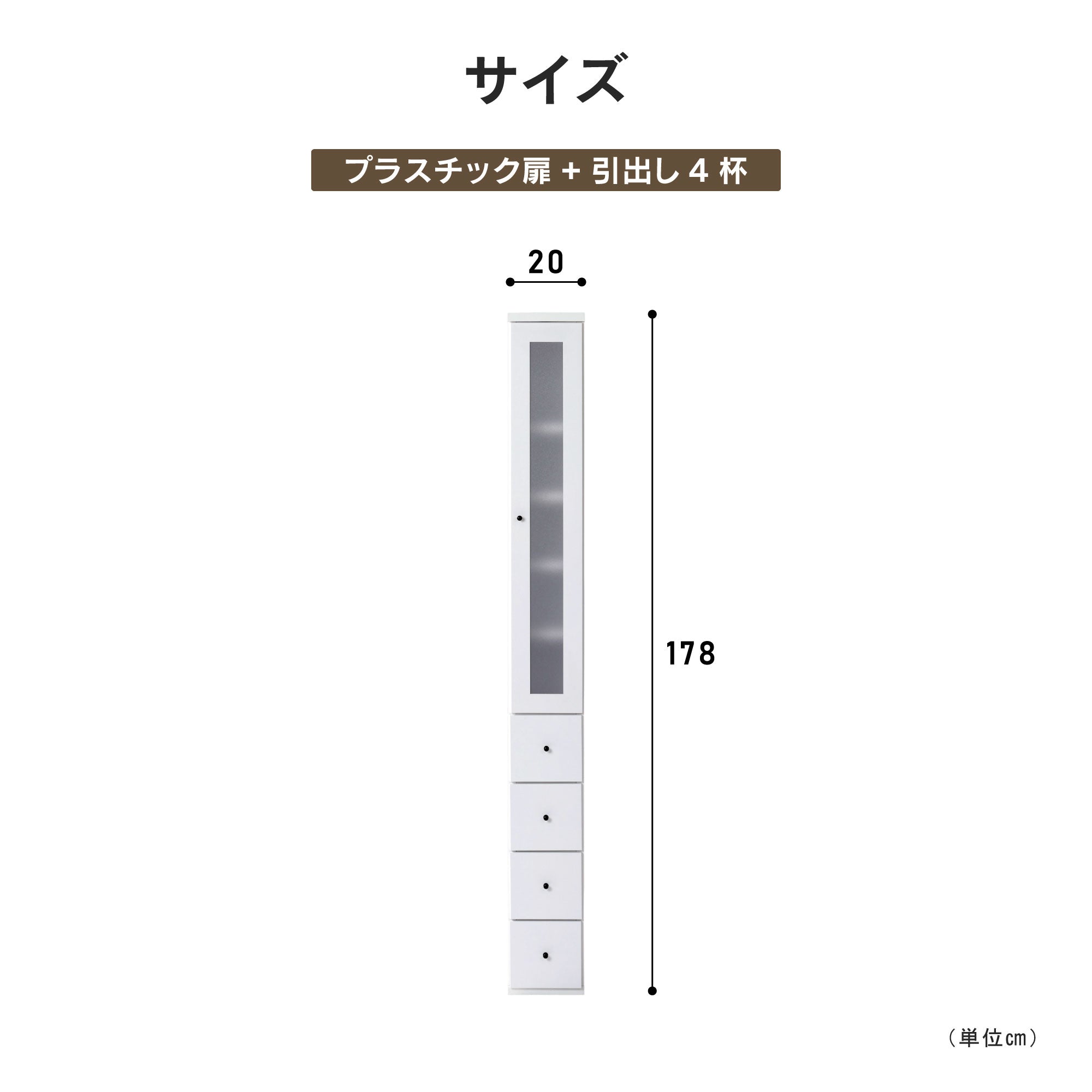 商品情報 キッチンや洗面所、リビングなどの狭い場所を有効利用できます。20㎝から45c㎝の間で2.5c㎝単位でお好みの幅をお選びいただけます。たっぷり収納できる引出4杯付き。