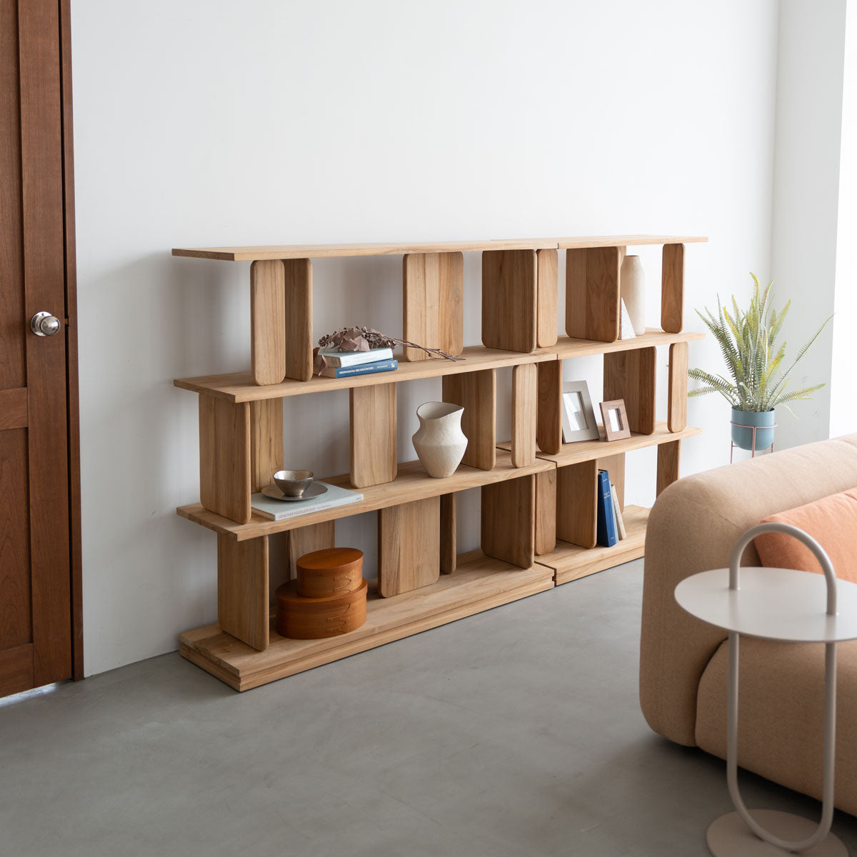 商品情報 シャープで凛とした棚に、柔らかい印象の支柱パネルがランダムに配置された、アイコニックなデザインのシェルフ。 壁面をアートな雰囲気に演出します。 両面使いできる仕様なので、空間を仕切るパーテーションとしてもお使いいただけます。