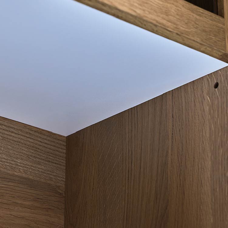 オイル塗装は水分・油分に弱く、長時間放置すると輪ジミやシミの原因になります。木材の表面に施した、無垢の風合いを活かした仕上げです。