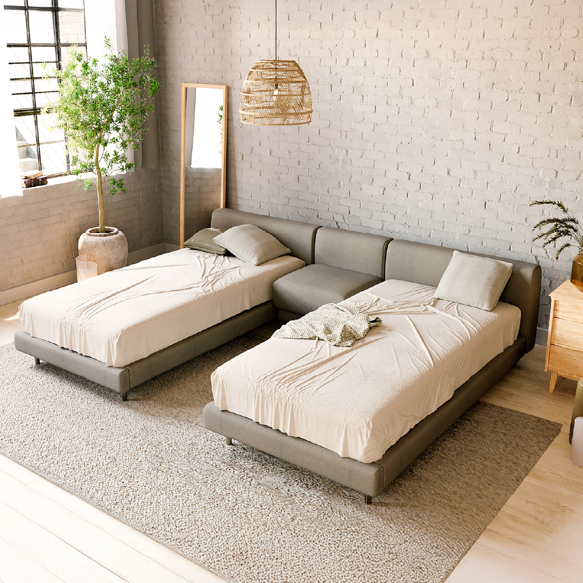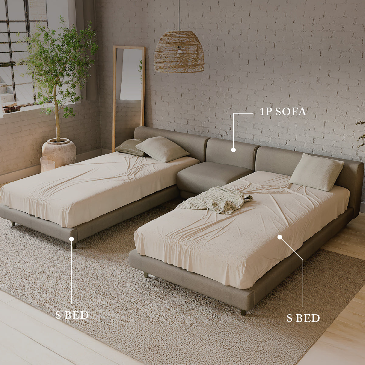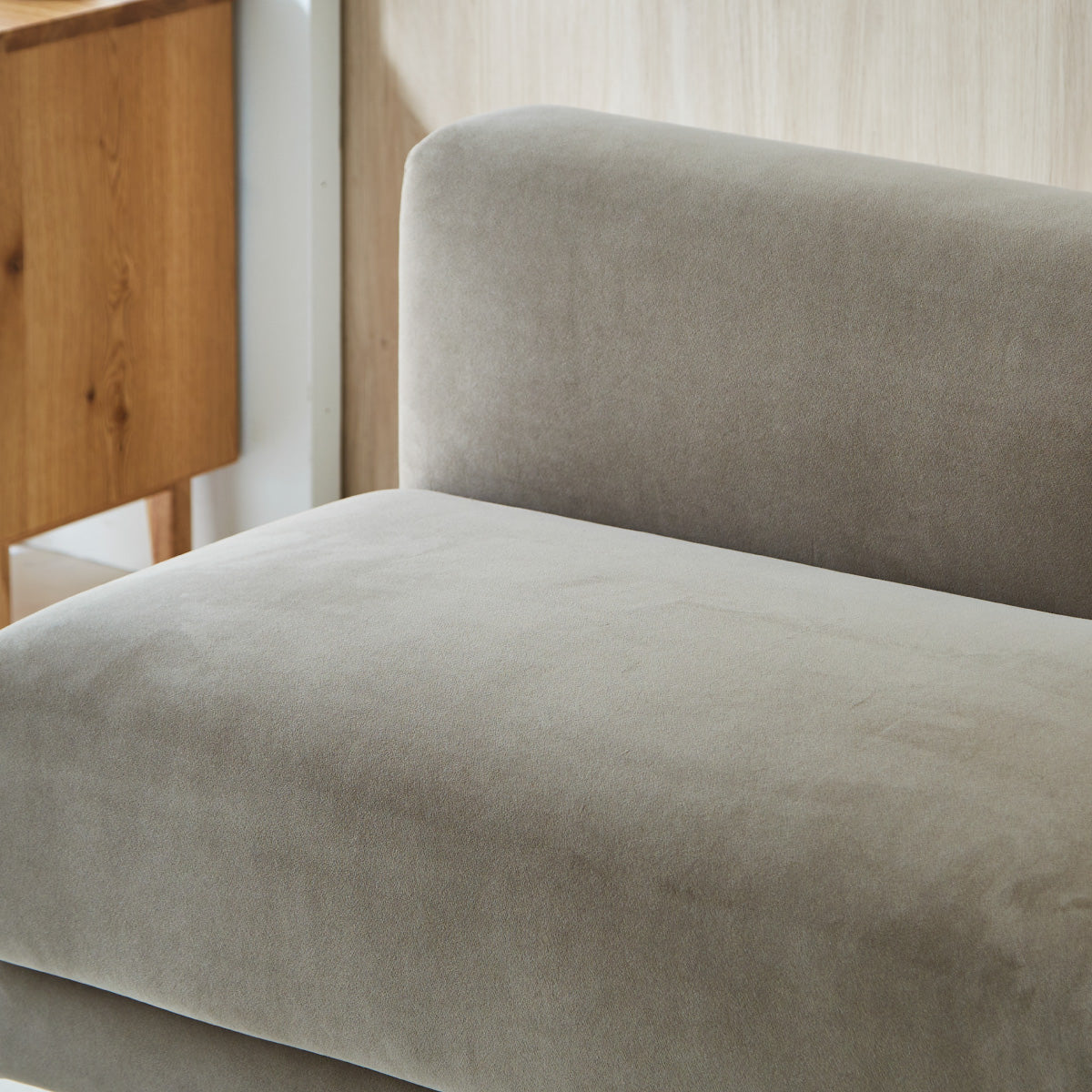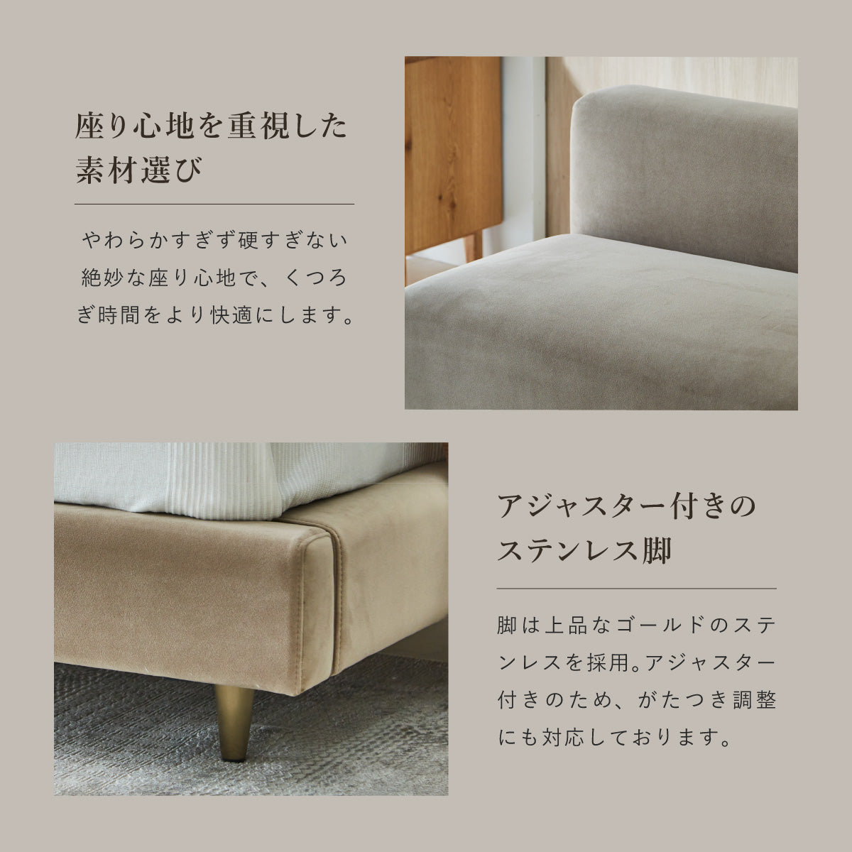 やわらかなベルベット調生地を纏い、 ベッドと美しく調和するソファ。