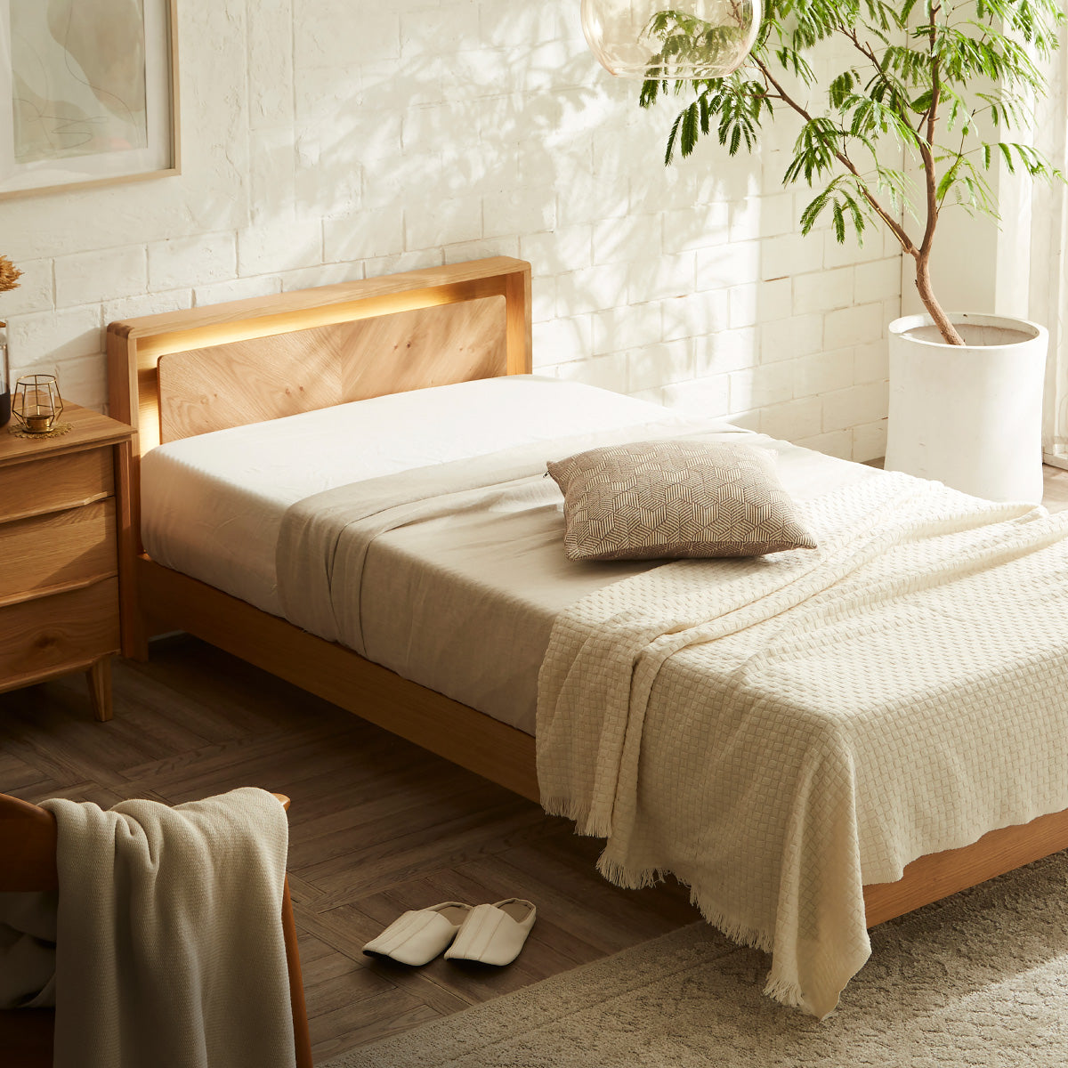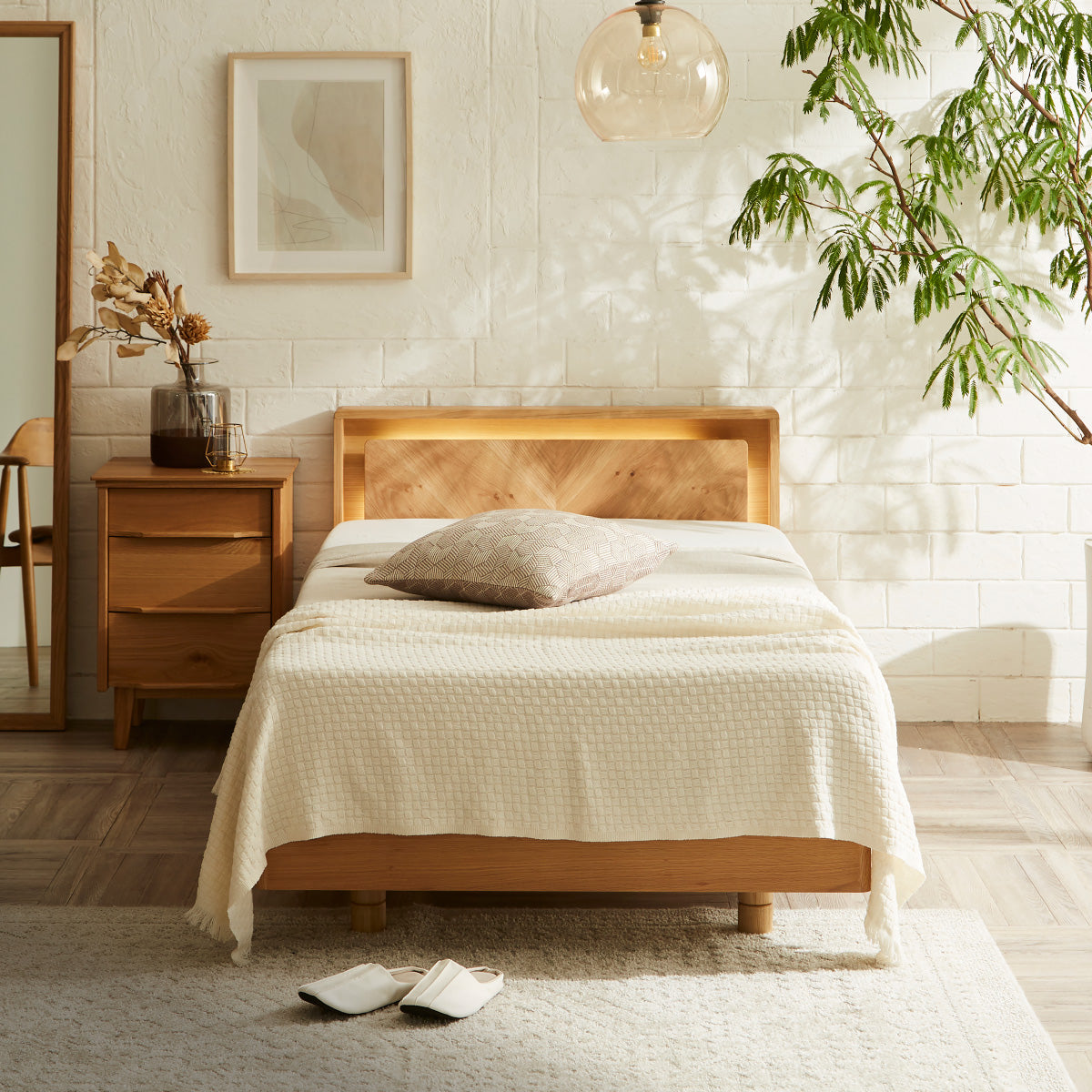 商品情報 やさしい間接照明が、お部屋に温かな光を届け、心がふと安らぐ時間を包み込みます。 ミドルロータイプの高さ設計により、圧迫感なく、広がりを感じさせるすっきりとしたシルエット。どんな空間にも溶け込み、上品で落ち着いた雰囲気を生み出します。 ヘッドボードに施された矢張りのデザインは、シンプルでありながらも個性を感じさせ、空間にさりげないアクセントを添えます。