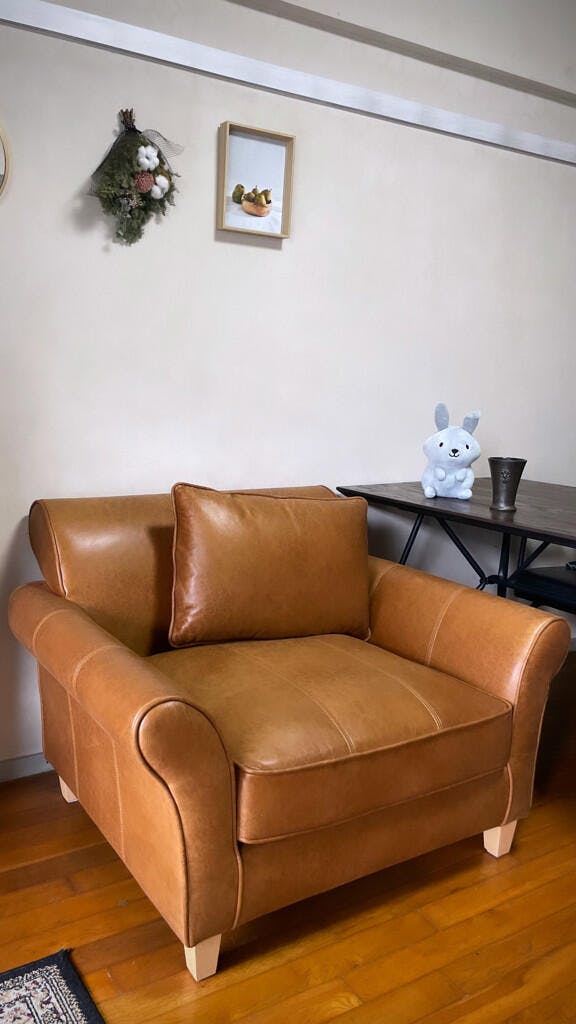 受注生産なので届くまで時間にはかかりましたが、非常に満足のいく商品です。 レザーテックスの質感も、高級感があって素敵です。1人掛けソファでもかなり大きいので、ゆったり出来ます。ソファの上で、胡座書いたり体育座りも出来る座面の広さ。 玄関のドアギリギリで入ったので、搬入経路は注意必須です。 気に入ったので、オットマンも購入検討しています。