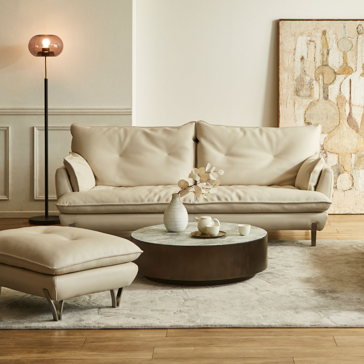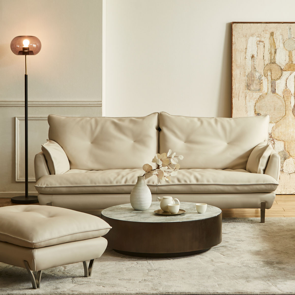 ソファの中央についている脚は、人が座った時に床に接地する構造で、 あくまで荷重がかかった時の補強用のものでございますので、浮いている状態が正常になります。