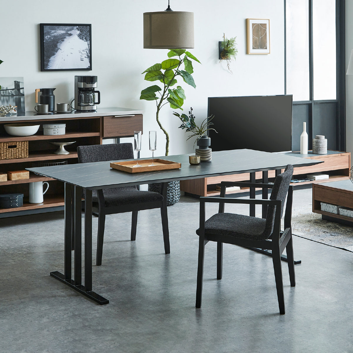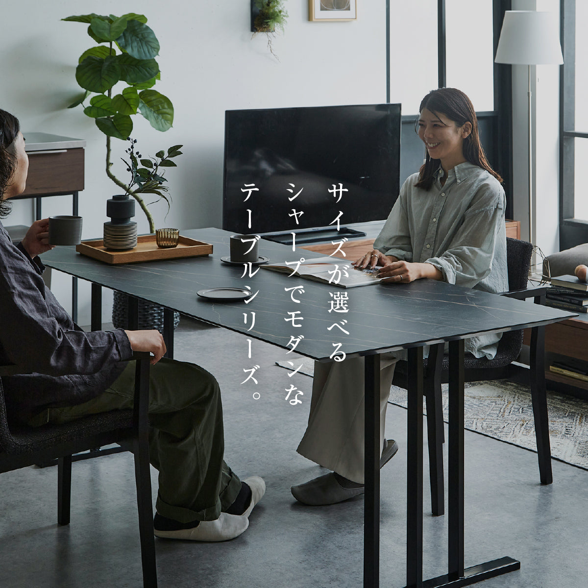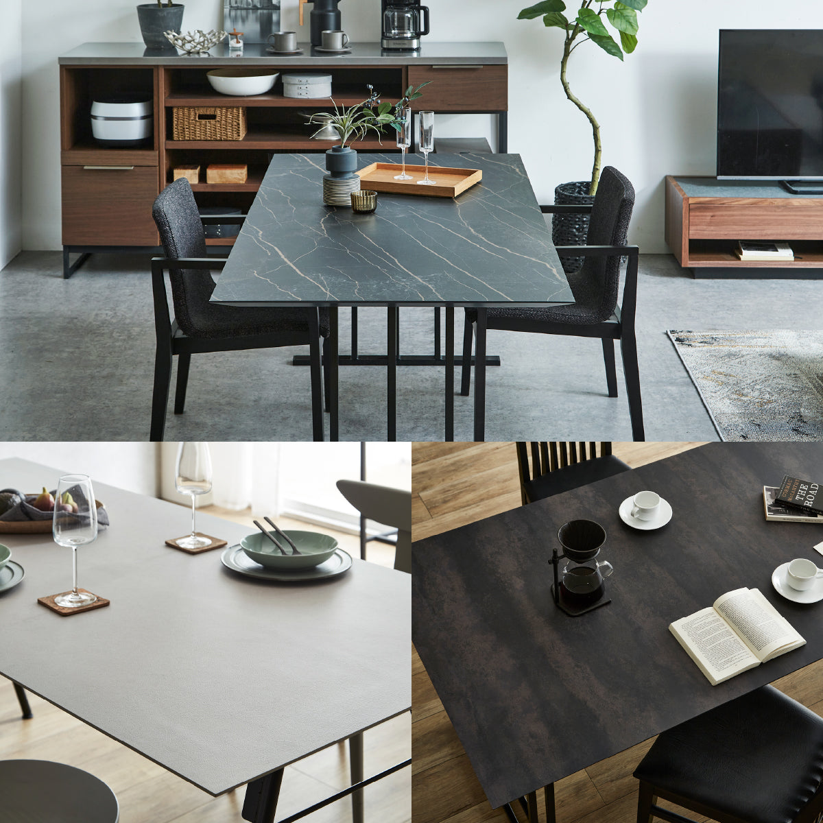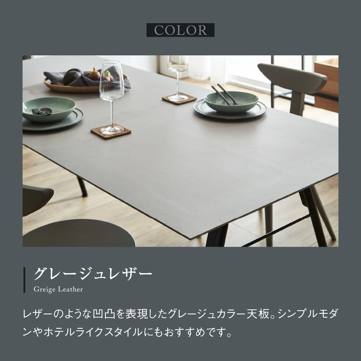 商品情報 天板カラーを、3種のメラミン材からセレクト可能です。グレージュレザーはレザーの凹凸を表現したグレージュカラー、ブラックストーンは雷のような模様が印象的な黒系の石目調、パティナは金属が酸化し変色したような質感をイメージしています。どれも天板の印象を最大限引き出すため、エッジを可能な限り薄く見せる設計としています。