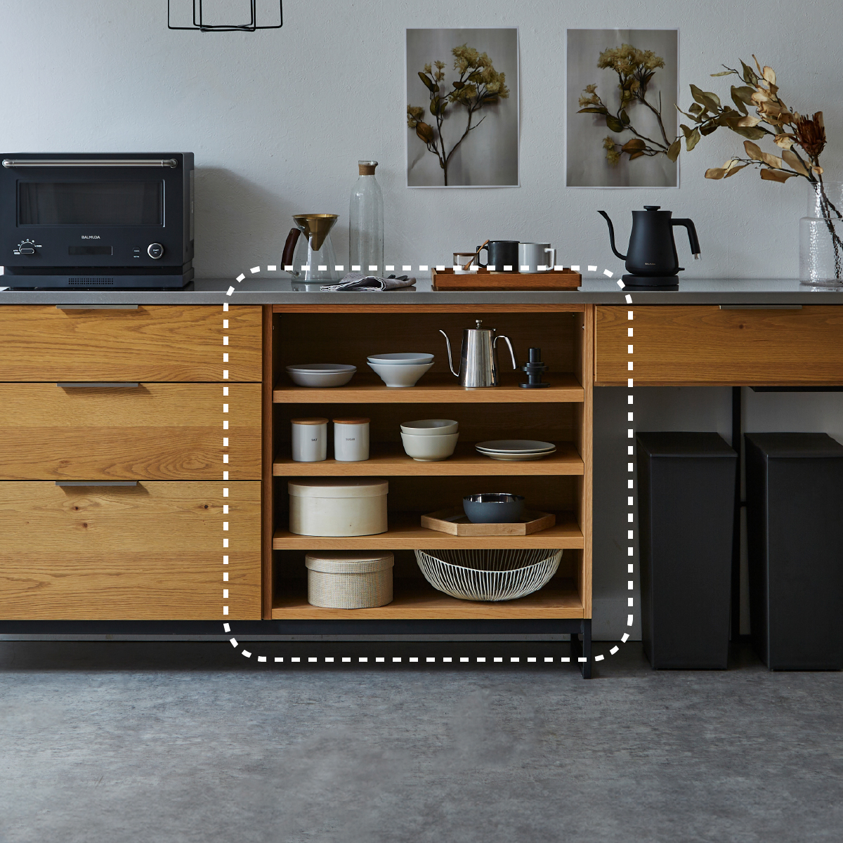 商品情報 対面型システムキッチンにあわせるイメージで設計しています。サイズ展開も160~240センチと幅広い展開とし、さまざまな用途に対応可能です。本体はウォールナットとホワイトオーク、脚タイプは、台輪式とスチール脚からセレクト可能です。本体はスライドカウンター、オープンシェルフ、引出、ダストと4つのタイプから組み合わせ可能です。