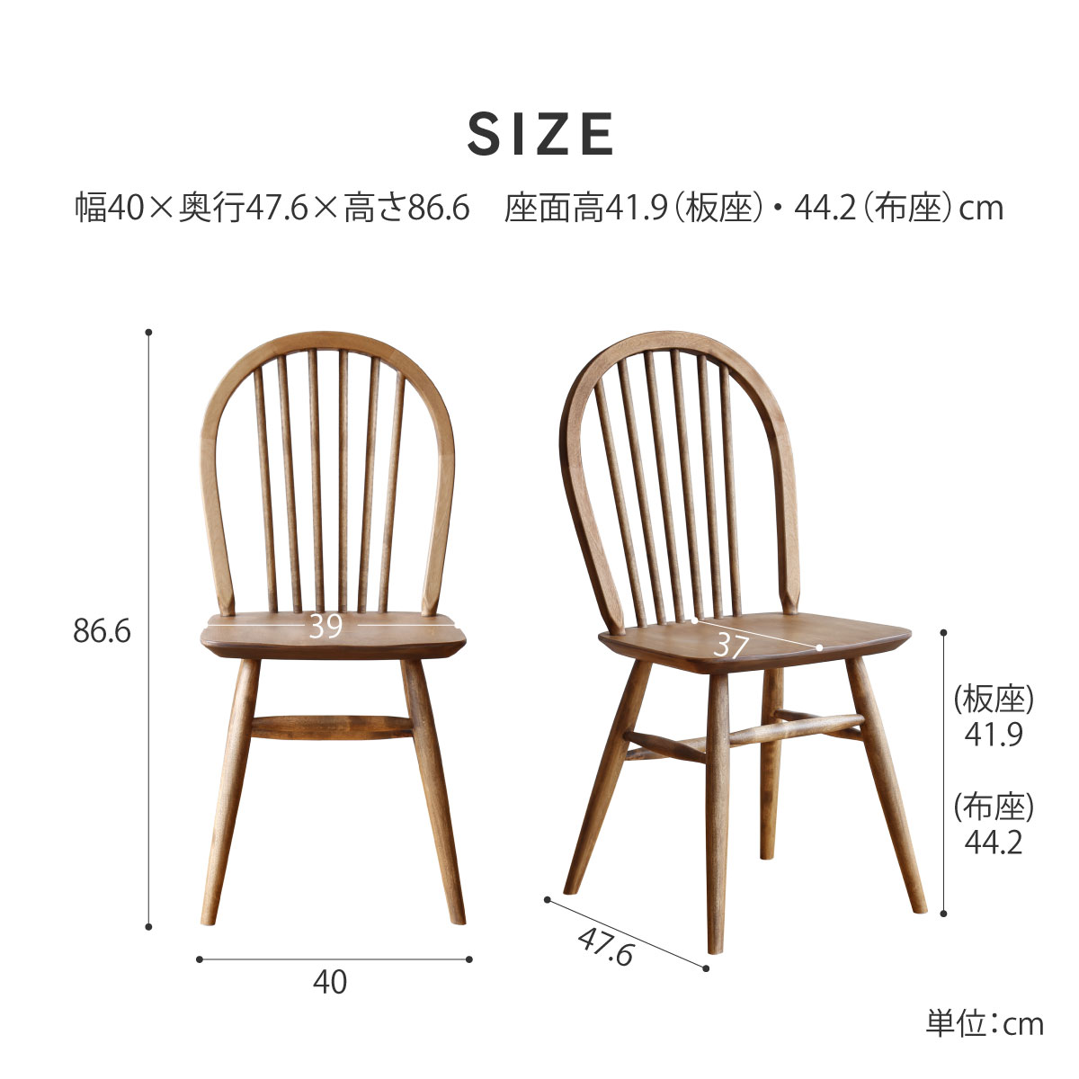 スポークタイプの逆三角形の背もたれや船底型に面取りされた座面縁など、細部まで丁寧に作られています。