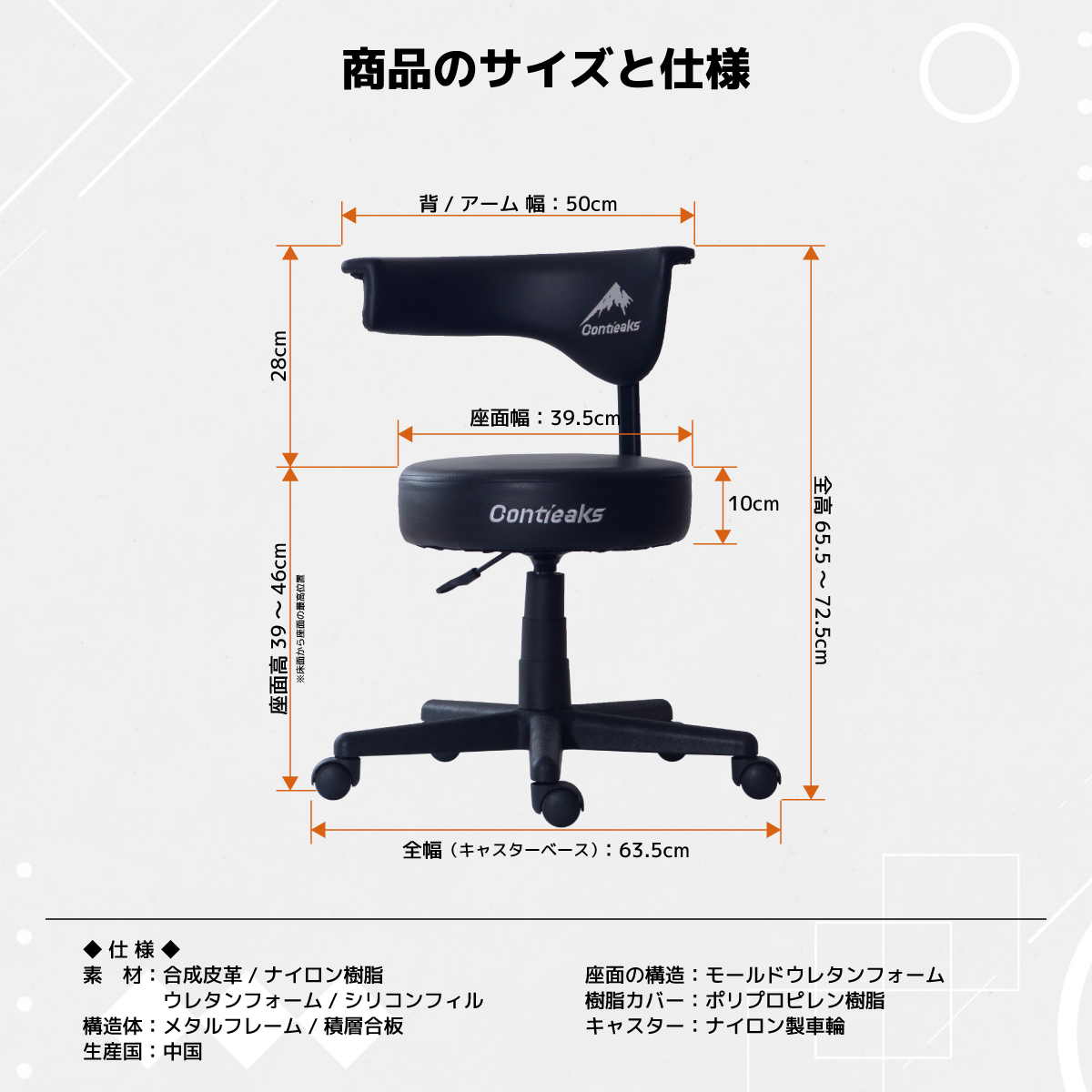 材質 合成皮革|スチール|モールドウレタン|樹脂|ナイロン樹脂キャスター