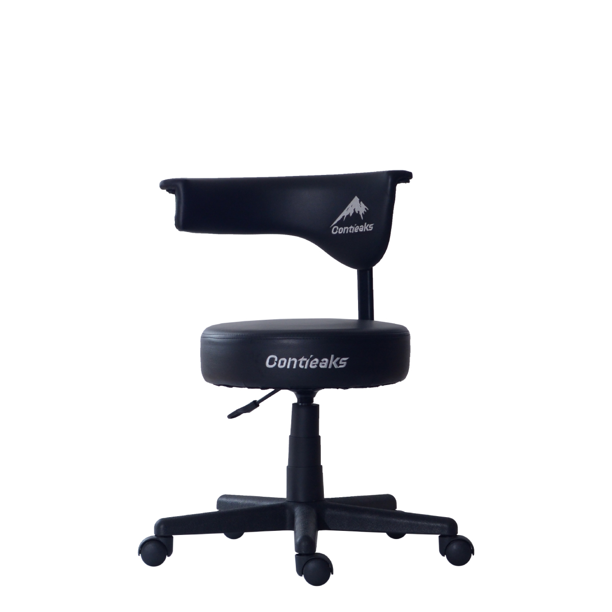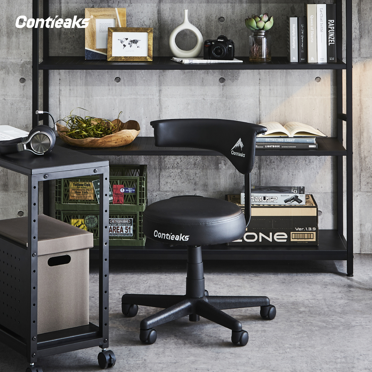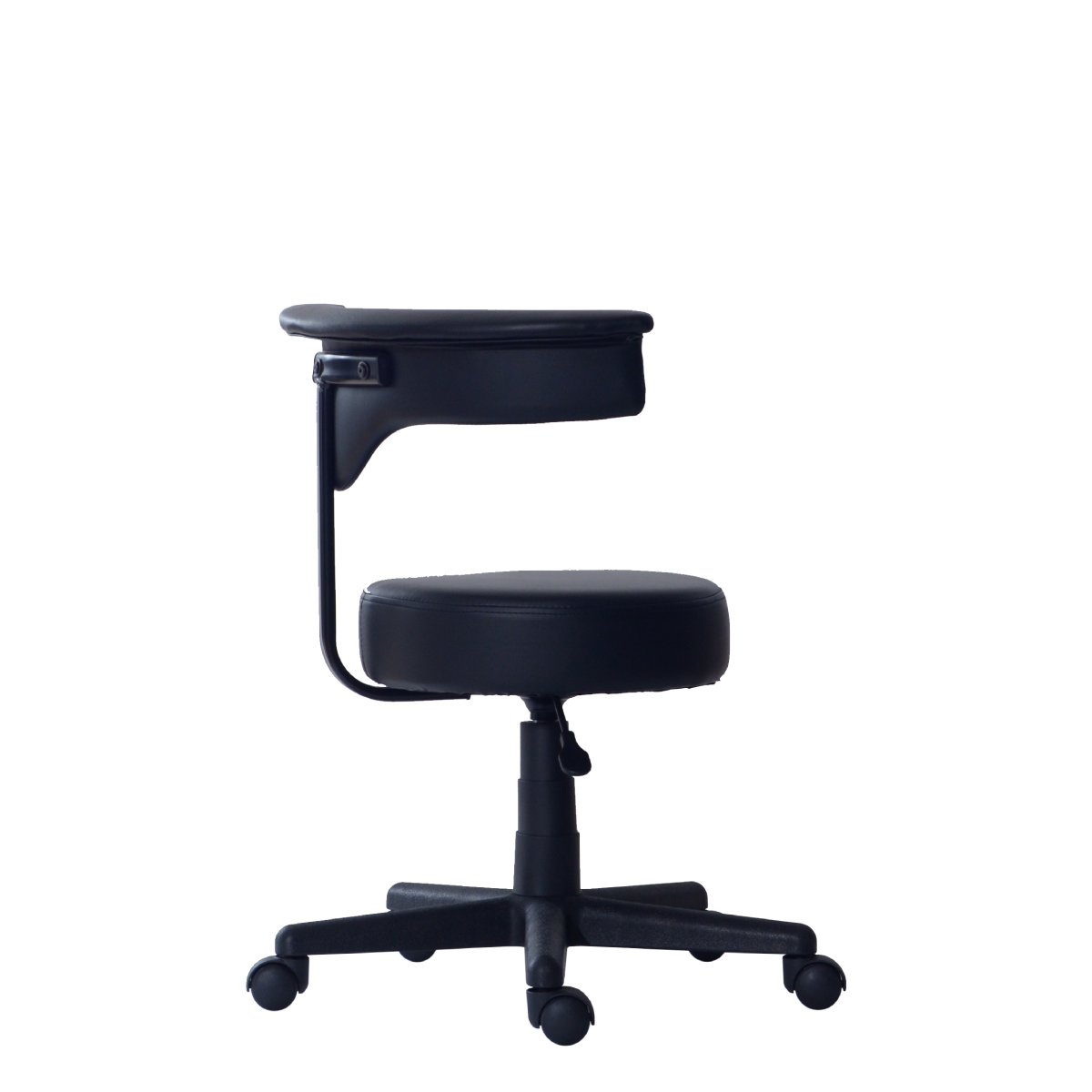 商品情報 プロが集まるトレーニングルームでの意見から生まれたスツール。 背もたれと回転させることで、背もたれが肘置きにもなるラウンドスツール