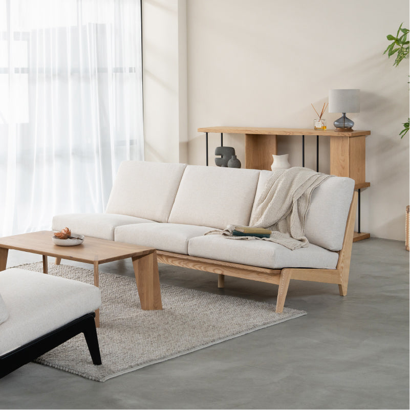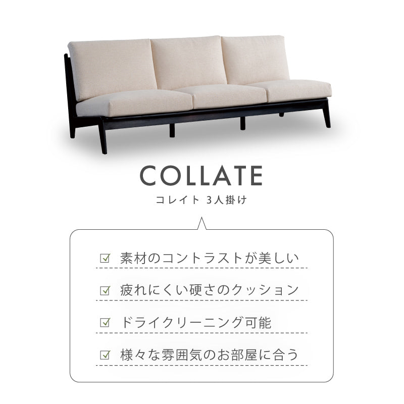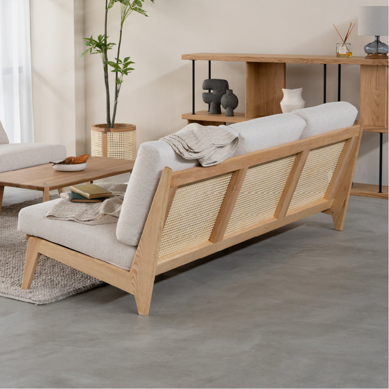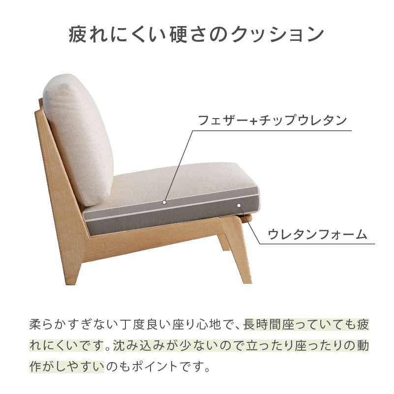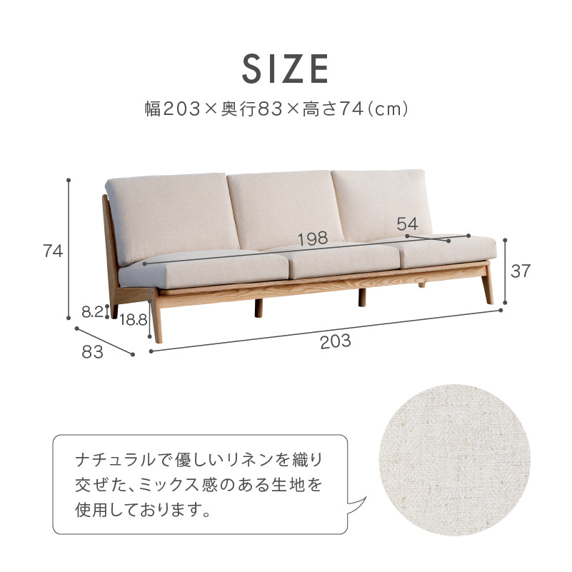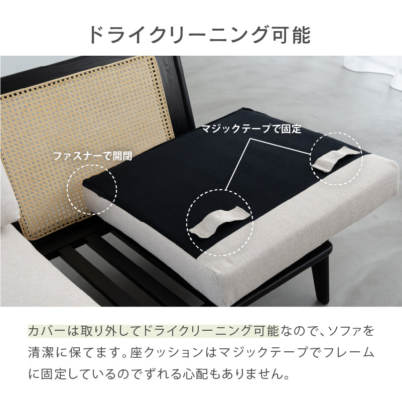 商品情報 重厚感と安定感がある木製フレームの背面には編み模様が美しいラタンをあしらいました。 ロータイプ・アームレスでお部屋をすっきりと広く見せることができます。 ナチュラルで優しいリネンを織り交ぜたミックス感のある生地を使用しています。フルカバーリング仕様でドライクリーニングでのお手入れができます。 3人掛けと1人掛けを対面で並べたり、1人掛けを2つ横に並べたり、様々なレイアウトでお部屋を彩ります。