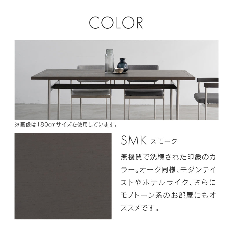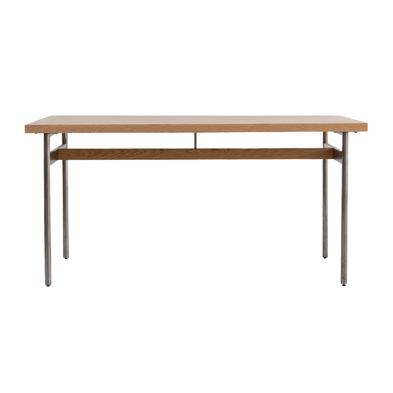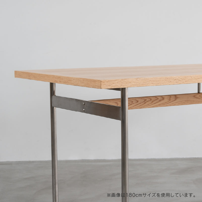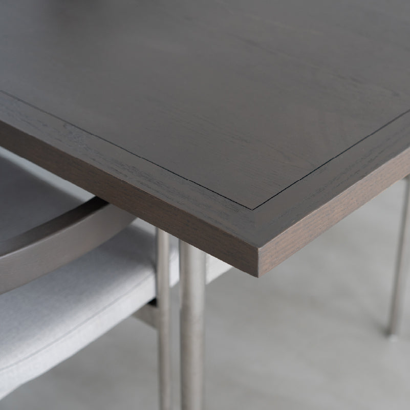 主張しないヘアライン加工されたステンレス脚とシャープですっきりとした木部の組み合わせが心地よいダイニングテーブル。