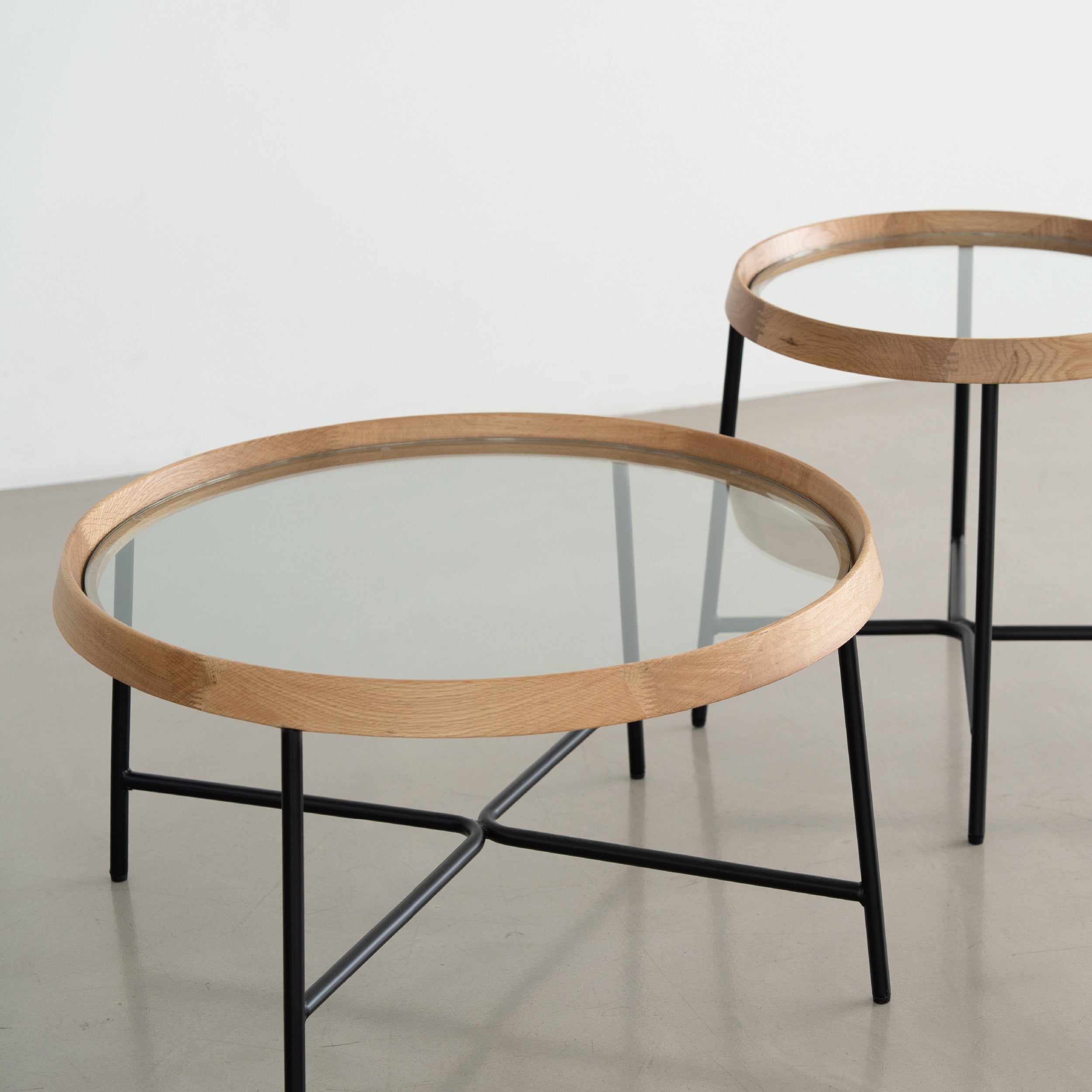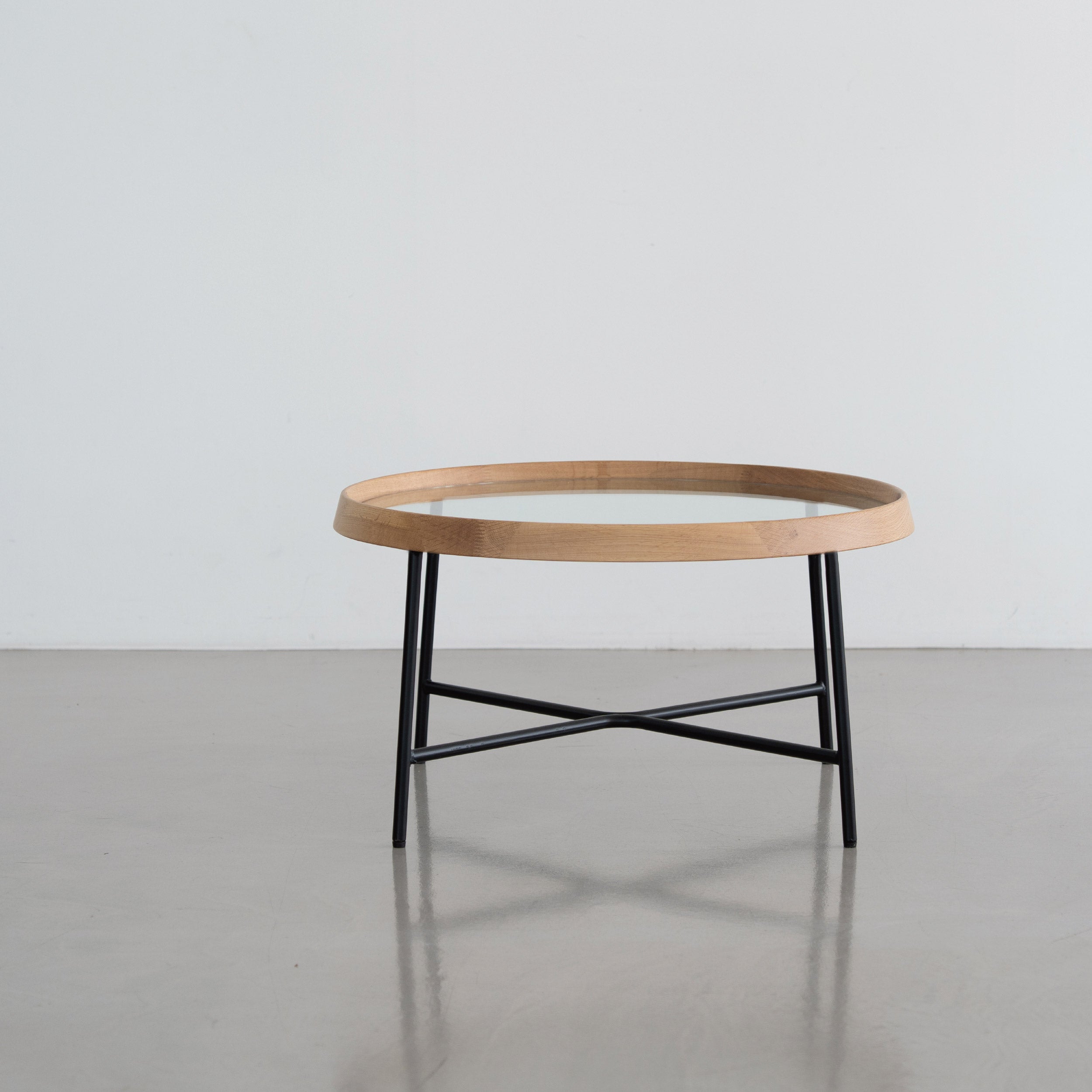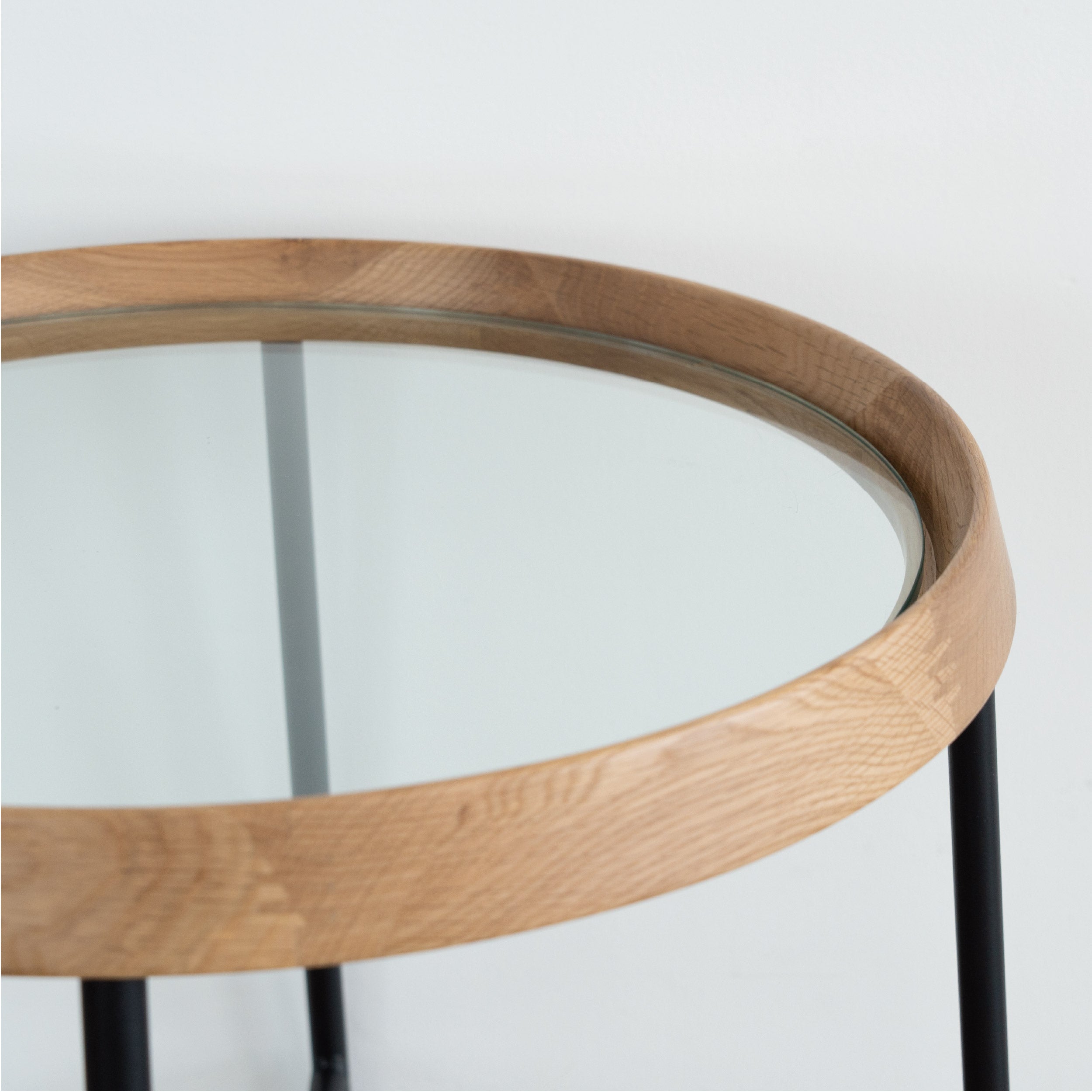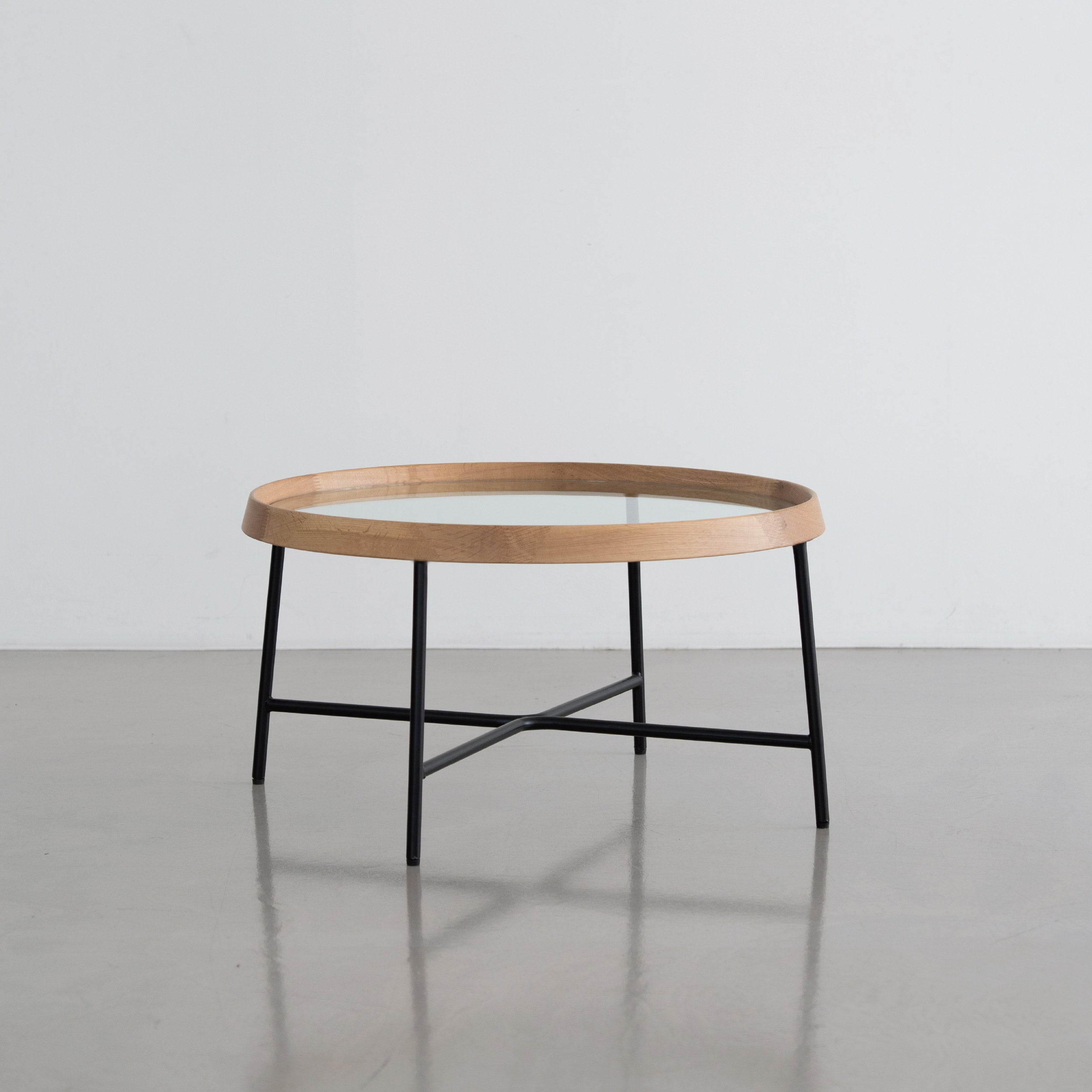 オーク材のしっかりとした縁と、ガラス天板×スチール脚の軽やかな組み合わせが、 抜け感のある洗練された印象を演出します。