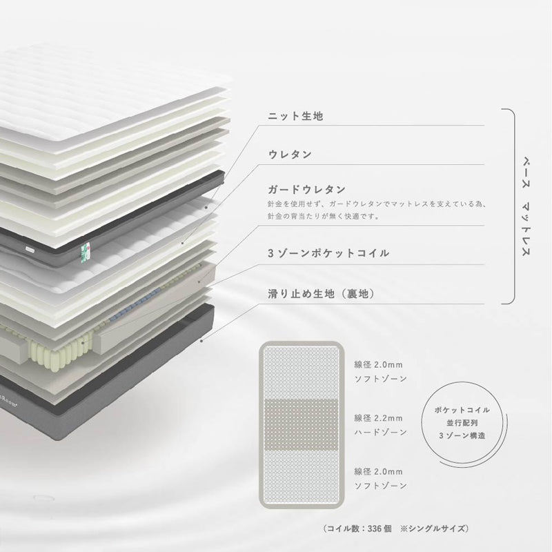 ポケットコイルは高密度の平行配列仕様で、体の動きに合わせてコイル同士が干渉することなく柔軟に対応します。※画像はクイーンサイズです。