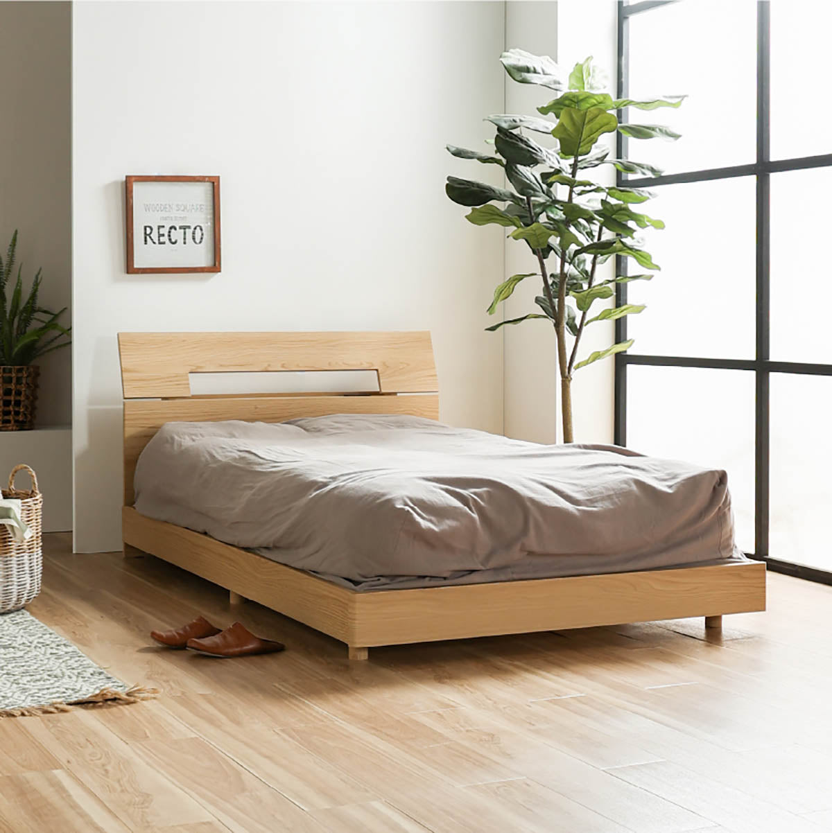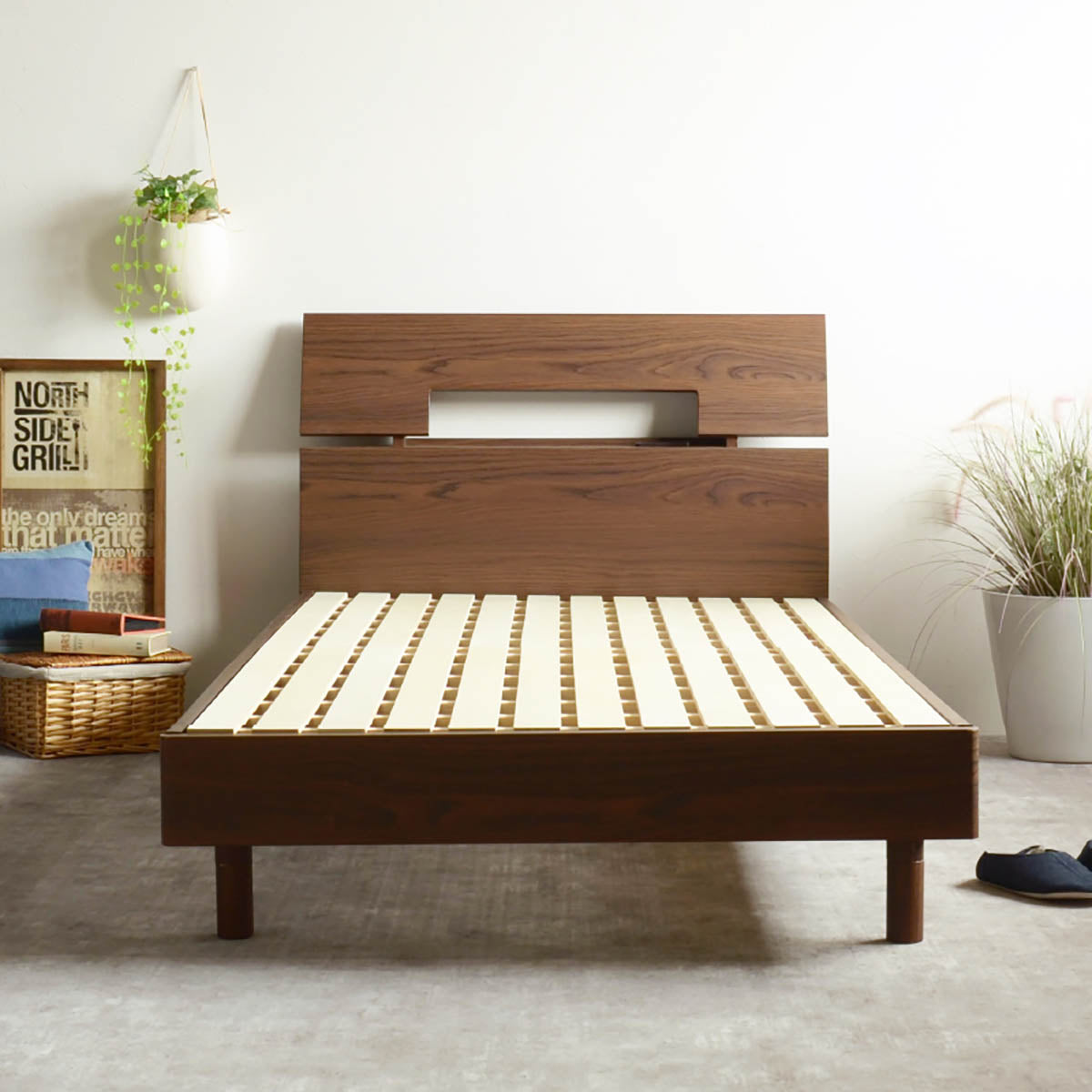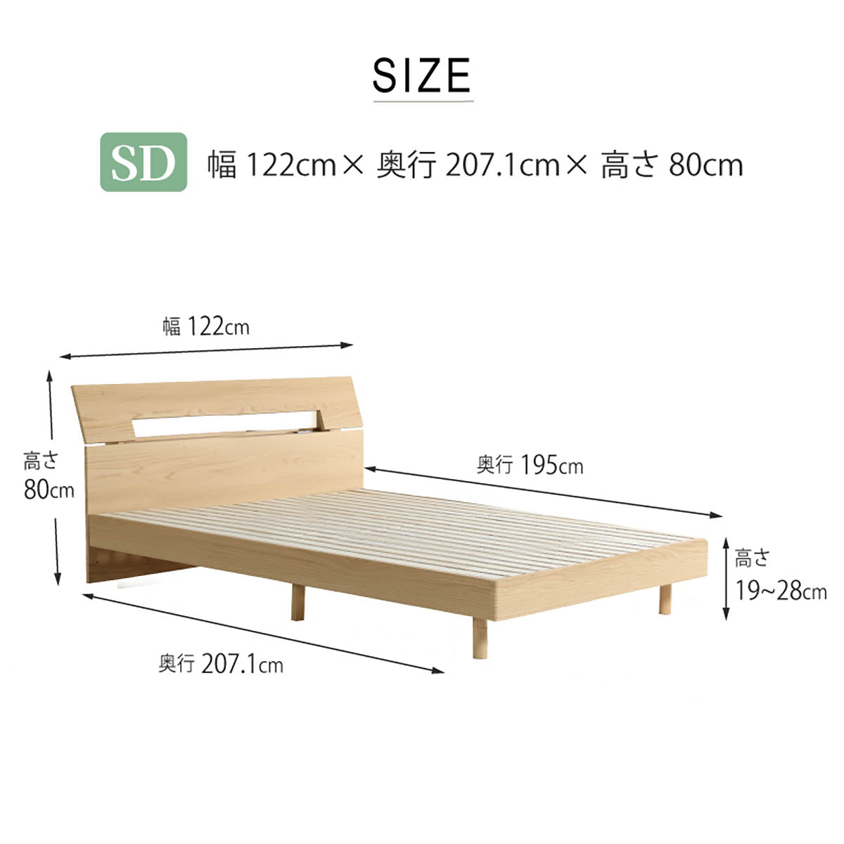 商品情報 色は【ブラウン・ナチュラル】の2色、サイズは【シングル・セミダブル・ダブル】の3展開です。床面からの高さは【19・28cm】の2段階から調整可能・ヘッドボードには小物を置くのに丁度いいチョイ宮付で2口コンセント付の為、スマートフォンを置いたまま充電が出来ます。
