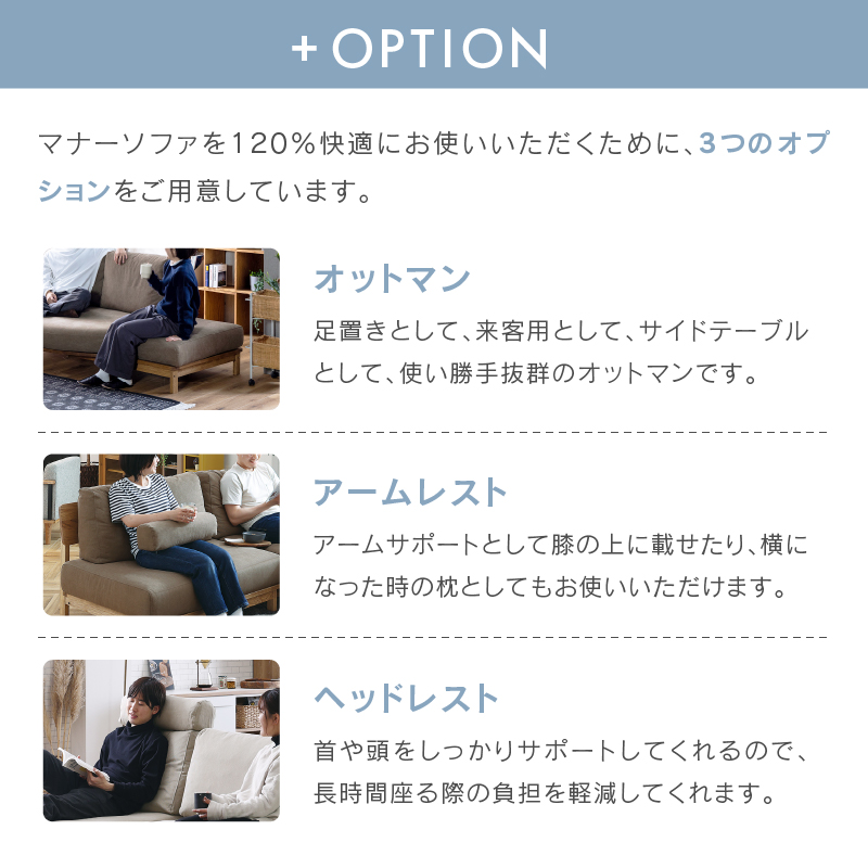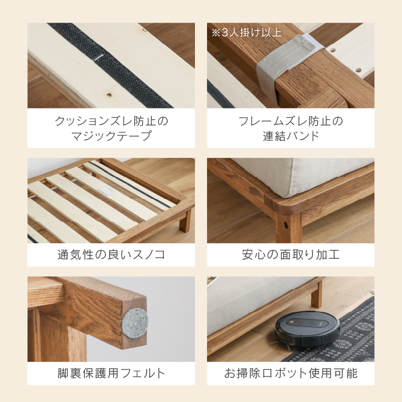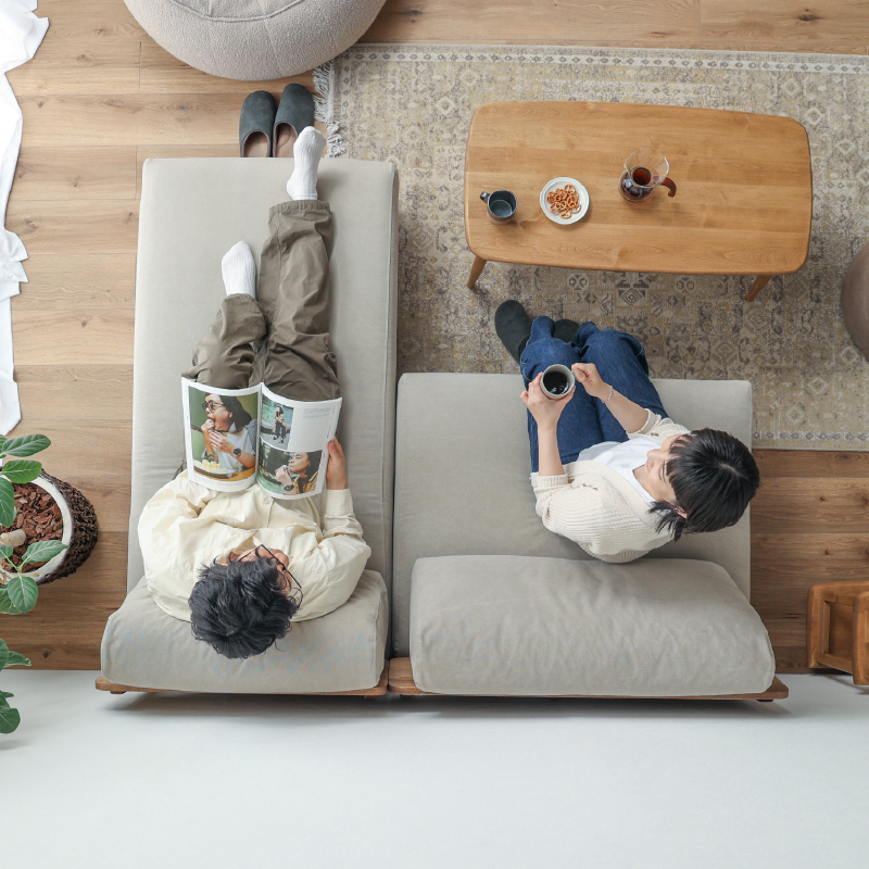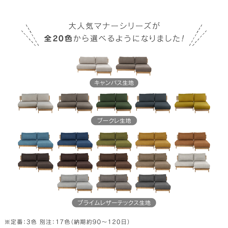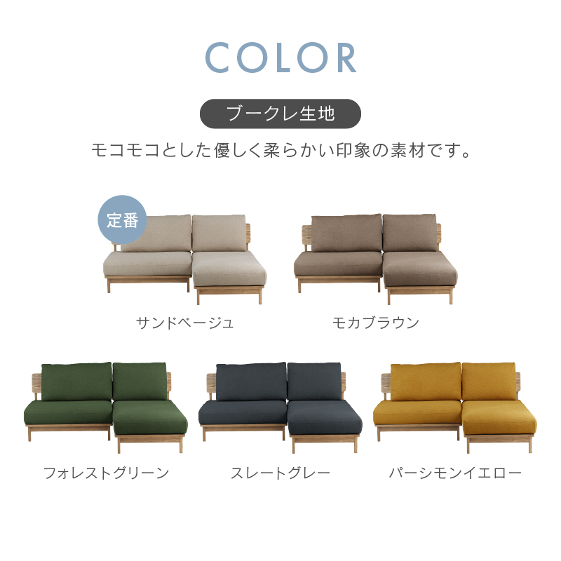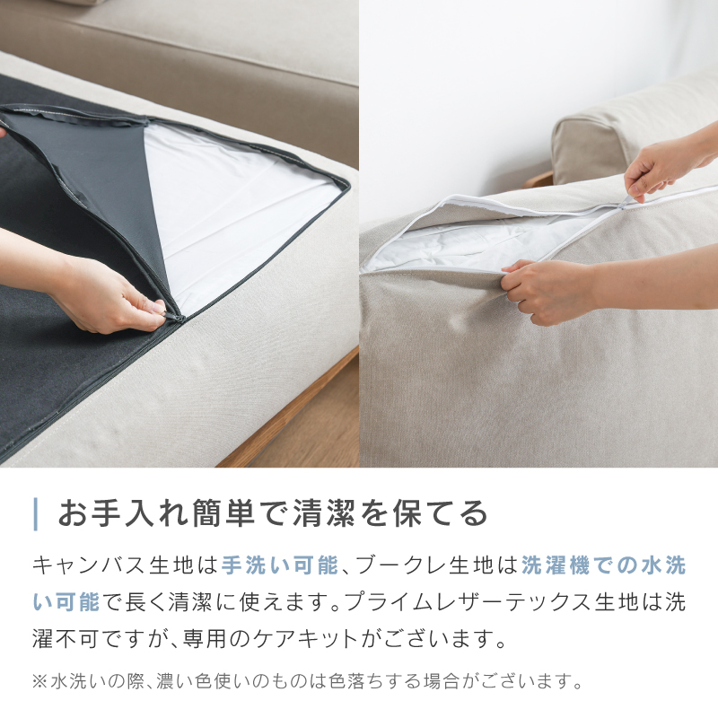 設置の際はソファを壁から少し離してお使いください。(目安:10~15cm 程度)壁に直接触れていると、色移りしたり、壁紙が変色するおそれがあります。また、風通しが悪くなり空気が滞留することで、壁側の結露や外気の影響でカビが発生しやすくなり、健康を害することがあります。開梱時に稀に表面のシワ、変形等が見られる場合がありますが、輸送中におこったものなので、ご使用されるうちに自然に回復します。また、叩いたり張地を軽く引っ張ると回復も早くなります。濡れた体で腰掛けたり、濡れたものなどを製品に乗せないでください。カビや汚れ、変色の原因となります。摩擦(特に湿った状態での摩擦)や汗や雨などの水分で衣類等に色移りする場合がございます。また、淡色系の物には十分にご注意ください。新聞や雑誌などの印刷物を長時間置いておくと商品にインクが移る可能性がございますので、長時間放置しないでください。アルコール・ベンジン・シンナー・除光液等有機溶剤・エタノール・消毒液・除菌液は色落ちとシミの原因となりますので使用しないでください。カバーリングソファの場合、カバーを外した状態の製品を直射日光に当てないでください。変色や劣化の原因になります。「上に立つ」「踏み台代わり」、また製品の上で飛び跳ねるなど人が座る用途以外には使用しないでください。転倒によるケガ・破損・変形の原因となります。床面に「傾斜」や「段差」がある場所には設置しないでください。転倒・変形・破損の原因となりますので平らな場所に水平に設置してください。製品のひじ掛けには腰掛けないでください。思わぬ事故の原因になります。床面がフローリングや畳の場合は、敷物を敷いたり、脚の底面にフェルト等の緩衝材を貼ってご使用ください。床面の傷防止になります。ソファの中央についている脚は、人が座った時に床に接地する構造で、 あくまで荷重がかかった時の補強用のものでございますので、浮いている状態が正常になります。購入時期が異なる場合や、ご購入いただいた商品の製造時期によって、同じ商品・色名でも色が多少異なります。