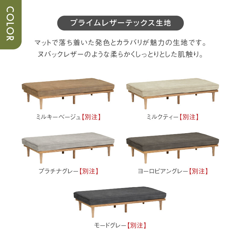 設置の際はソファを壁から少し離してお使いください。(目安:10~15cm 程度)壁に直接触れていると、色移りしたり、壁紙が変色するおそれがあります。また、風通しが悪くなり空気が滞留することで、壁側の結露や外気の影響でカビが発生しやすくなり、健康を害することがあります。開梱時に稀に表面のシワ、変形等が見られる場合がありますが、輸送中におこったものなので、ご使用されるうちに自然に回復します。また、叩いたり張地を軽く引っ張ると回復も早くなります。濡れた体で腰掛けたり、濡れたものなどを製品に乗せないでください。カビや汚れ、変色の原因となります。摩擦(特に湿った状態での摩擦)や汗や雨などの水分で衣類等に色移りする場合がございます。また、淡色系の物には十分にご注意ください。新聞や雑誌などの印刷物を長時間置いておくと商品にインクが移る可能性がございますので、長時間放置しないでください。アルコール・ベンジン・シンナー・除光液等有機溶剤・エタノール・消毒液・除菌液は色落ちとシミの原因となりますので使用しないでください。カバーリングソファの場合、カバーを外した状態の製品を直射日光に当てないでください。変色や劣化の原因になります。「上に立つ」「踏み台代わり」、また製品の上で飛び跳ねるなど人が座る用途以外には使用しないでください。転倒によるケガ・破損・変形の原因となります。床面に「傾斜」や「段差」がある場所には設置しないでください。転倒・変形・破損の原因となりますので平らな場所に水平に設置してください。製品のひじ掛けには腰掛けないでください。思わぬ事故の原因になります。床面がフローリングや畳の場合は、敷物を敷いたり、脚の底面にフェルト等の緩衝材を貼ってご使用ください。床面の傷防止になります。ソファの中央についている脚は、人が座った時に床に接地する構造で、 あくまで荷重がかかった時の補強用のものでございますので、浮いている状態が正常になります。購入時期が異なる場合や、ご購入いただいた商品の製造時期によって、同じ商品・色名でも色が多少異なります。