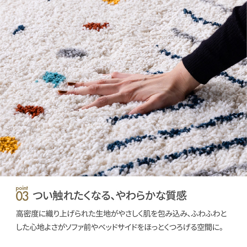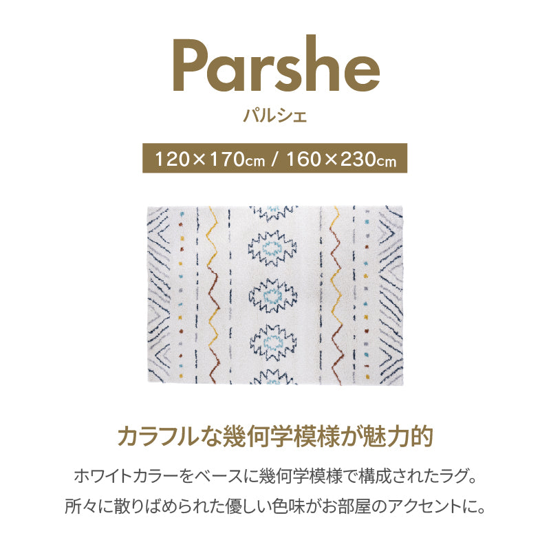 商品情報 ホワイトをベースに幾何学模様で構成されたラグ。ユニークなデザインと所々に散りばめられた優しい色味でお部屋のアクセントになる1枚。