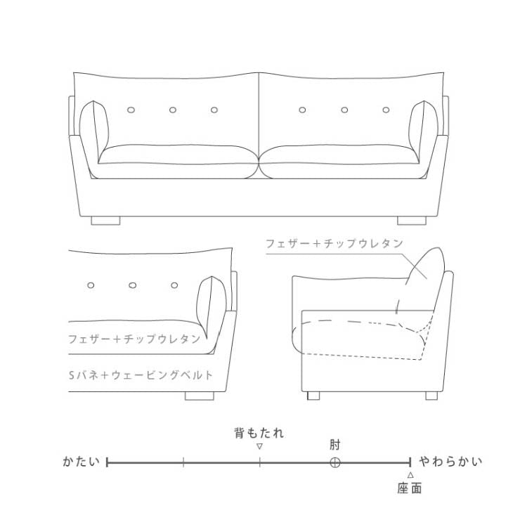 材質 フェザー・チップウレタン・ウレタンフォーム・Sバネ・ウェービングベルト・ファブリック