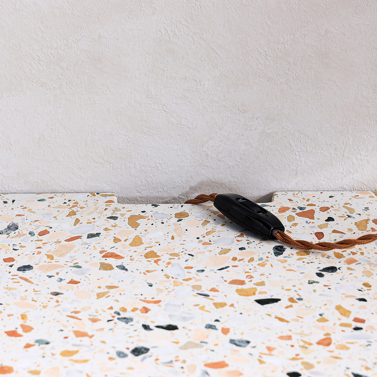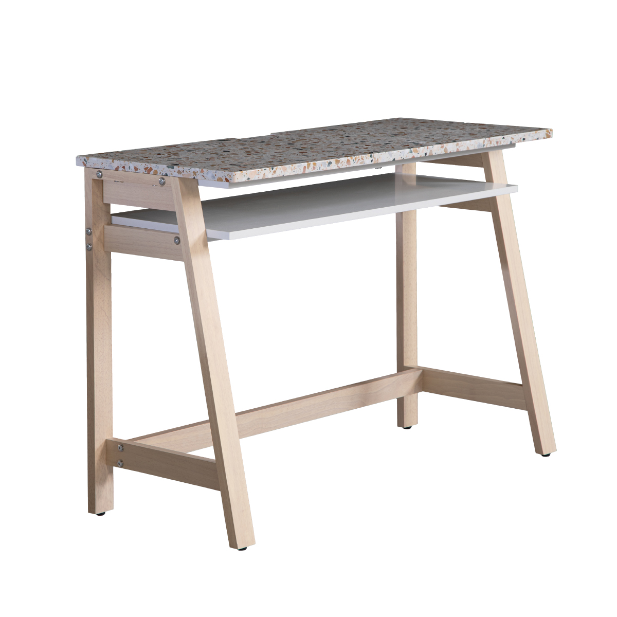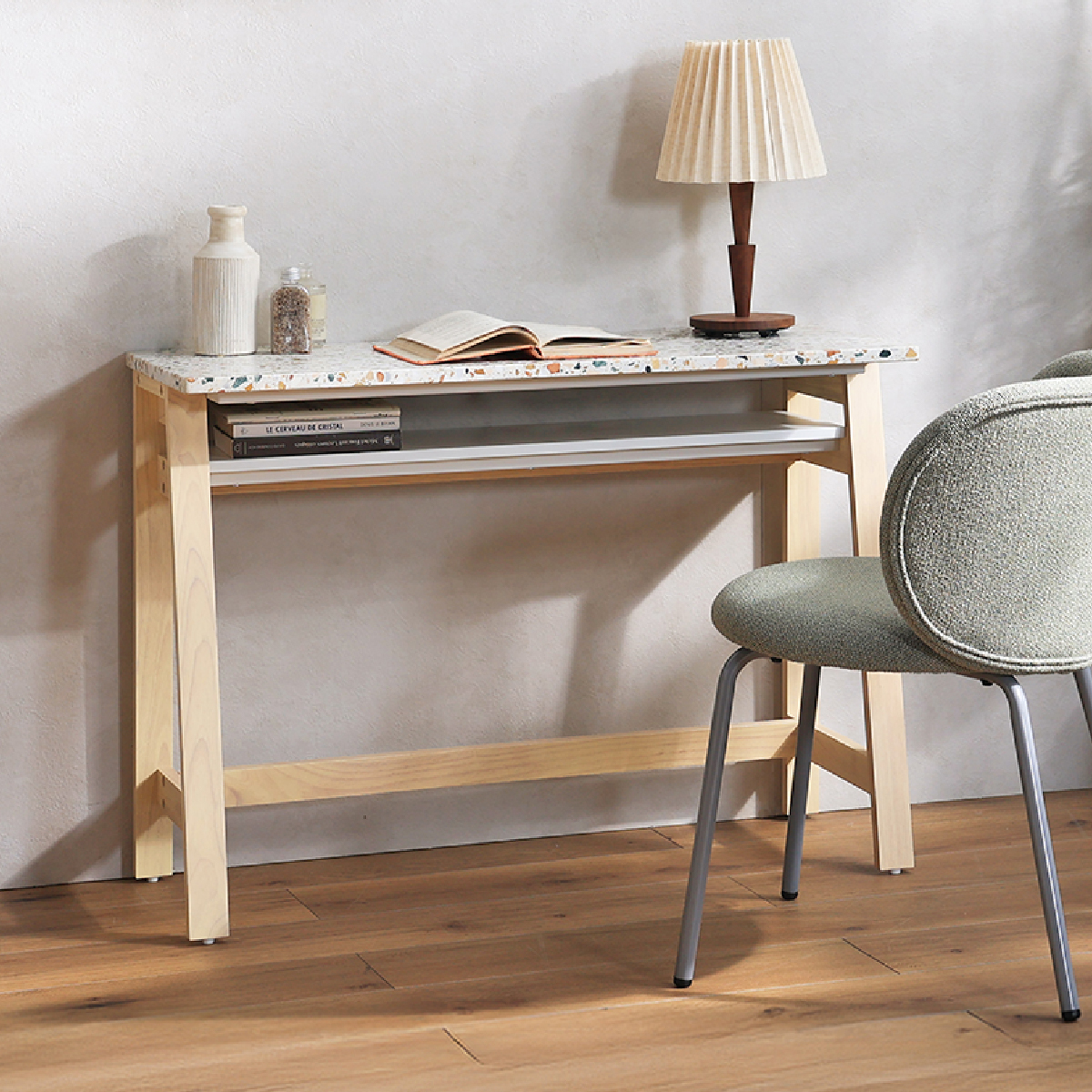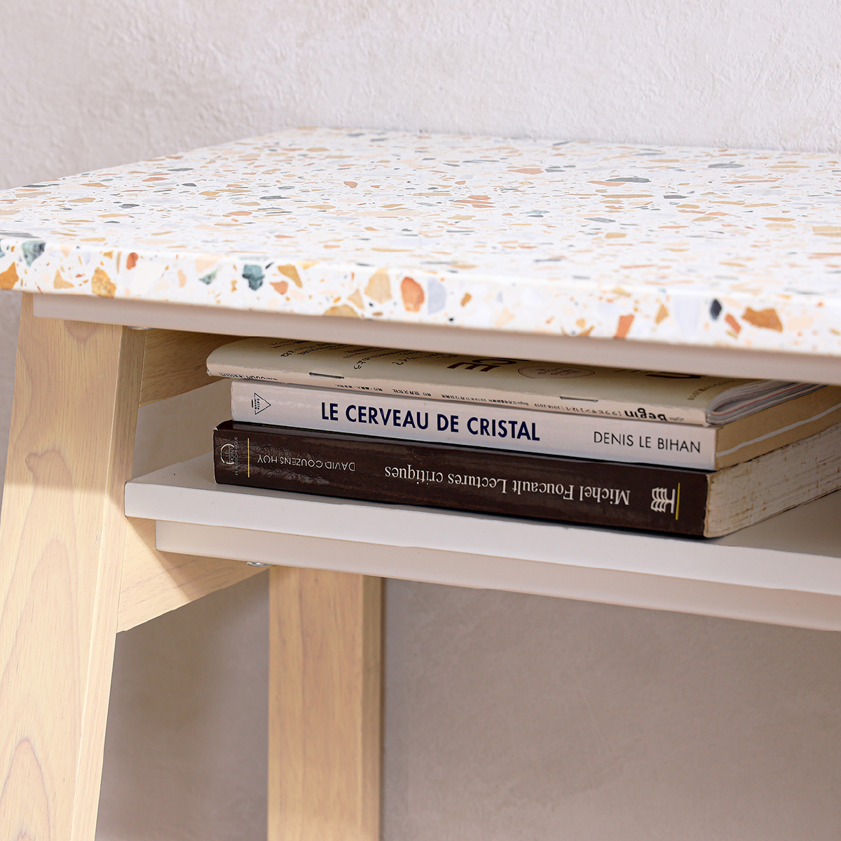 上品なデザインの中にカラフルなテラゾー柄が映えるフェルネデスク。柄シートではなく人造大理石を採用しているので、しっかりとした重厚感があります。