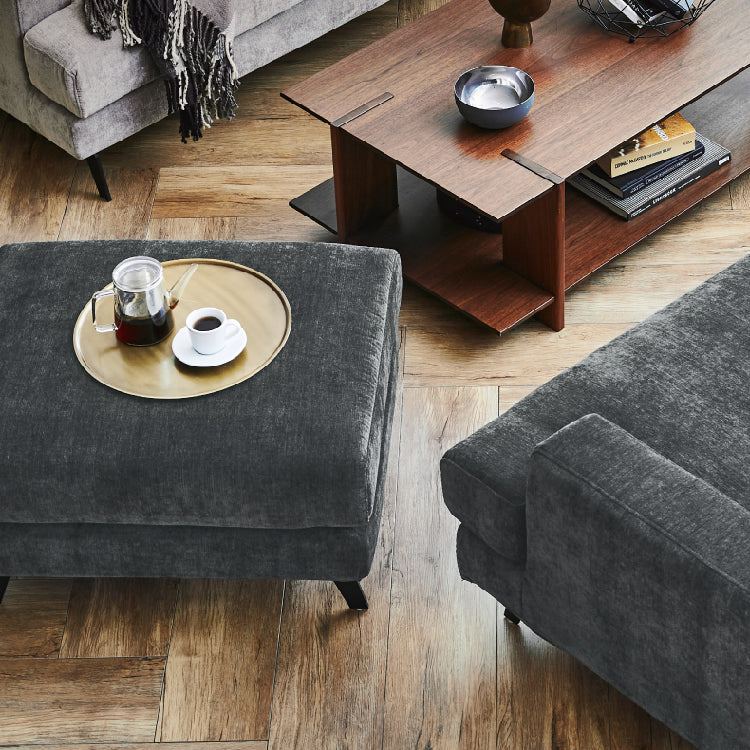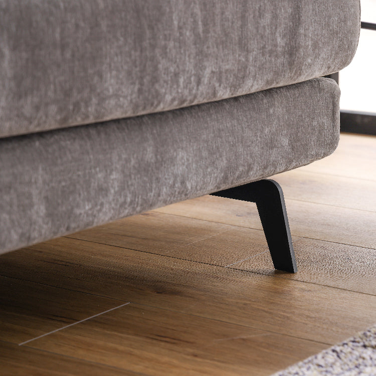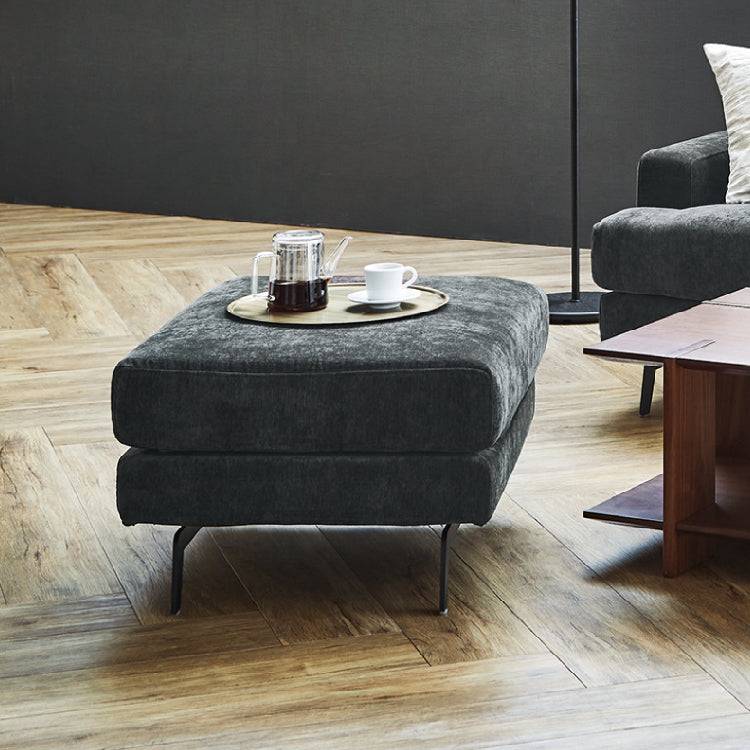 リビングがそれほど広くないので、ソファは2人掛けにしました。我が家は夫婦、2歳児、犬の家族構成のため、2人掛けソファに全員座ると手狭に感じます。スツールをセットにすることで、足を伸ばしてくつろいだり、2歳児の特等席になったり、犬のくつろぎスペースになったりと、大活躍です。 このソファとスツールを選んだ1番の要因はクッション下や肘置きのためのフレームがなく、金属脚もクッションの下に収まり、はみ出ていないので、小さい子供がソファの周りで遊んでいる時に、硬いもので頭をぶつける心配がない安心感です。