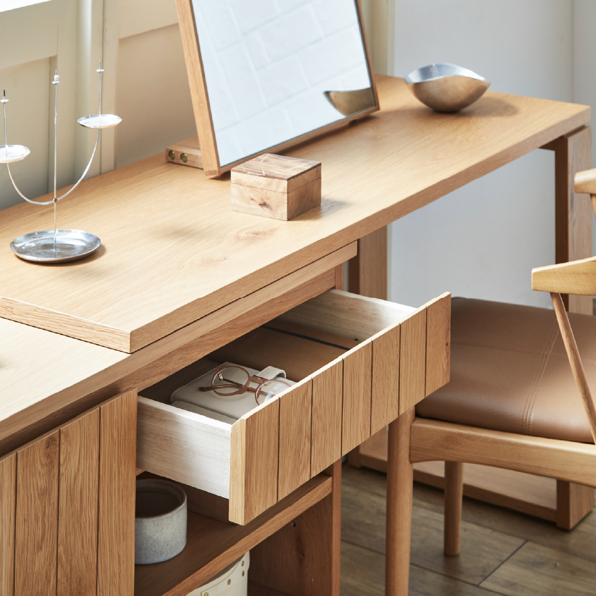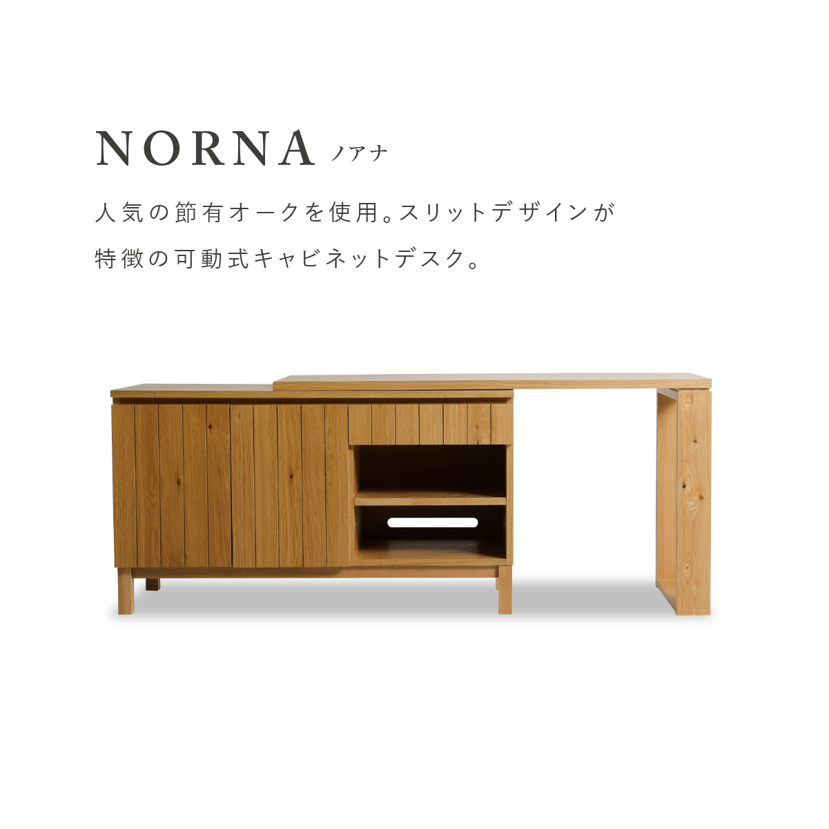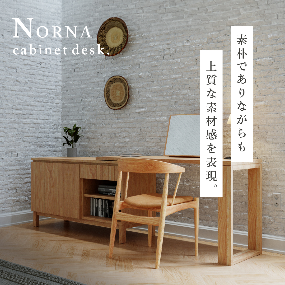 ナチュラルで軽やかな印象のキャビネットデスク。節有オークの美しい木目が特別感を演出します。