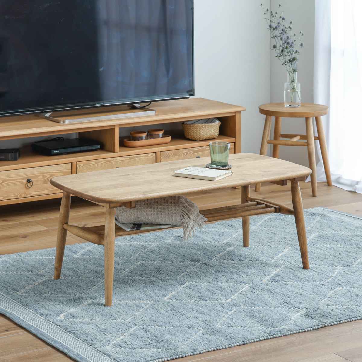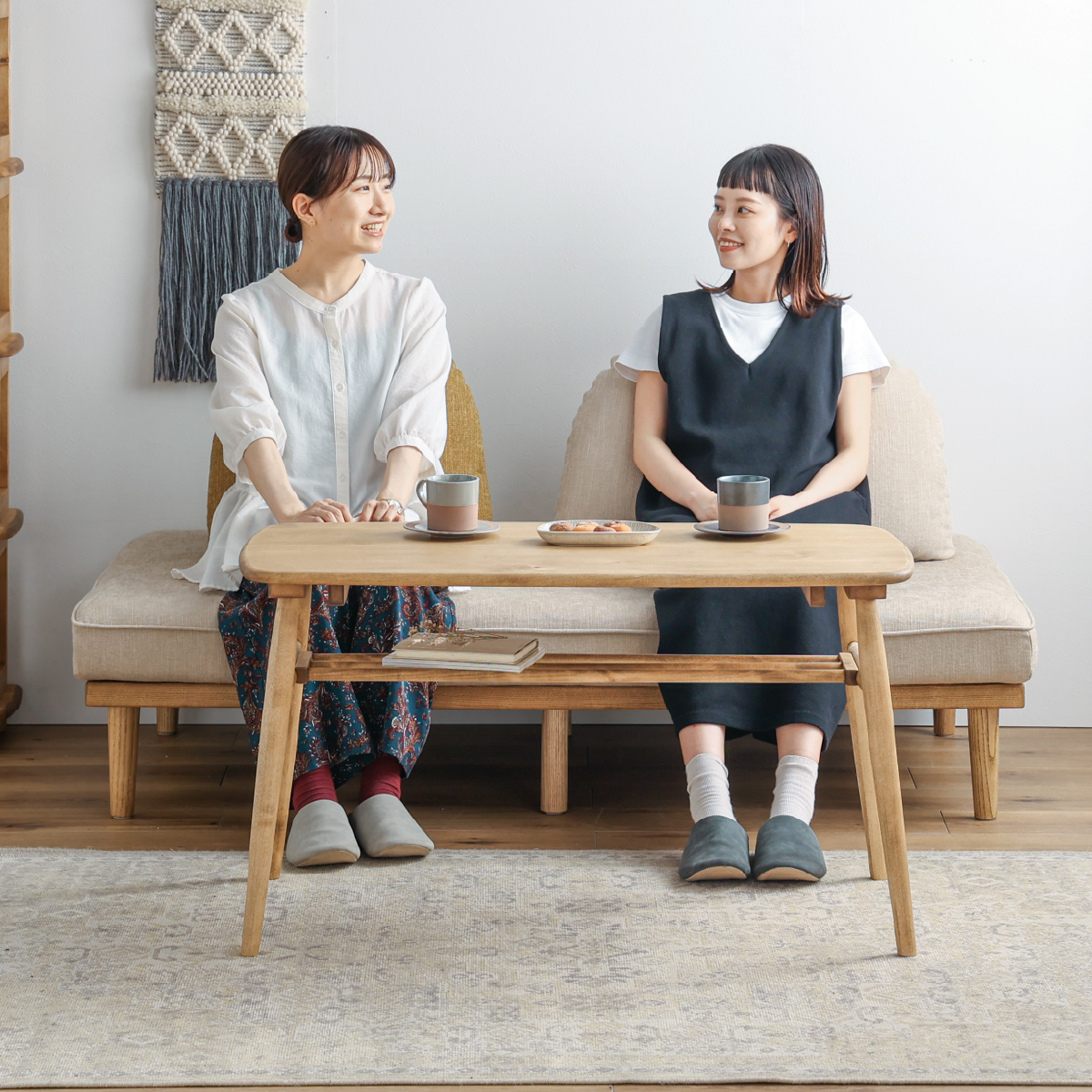 ソファに腰かけてご飯やお茶、パソコン作業をする生活なら、ローテーブルよりこれくらいの高さが最適だと思います。質感もよく、軽いので移動もしやすいです。女性1人でも組み立てできます。全体的に丸みのある柔らかなデザインです。どんな部屋でも合うと思います。