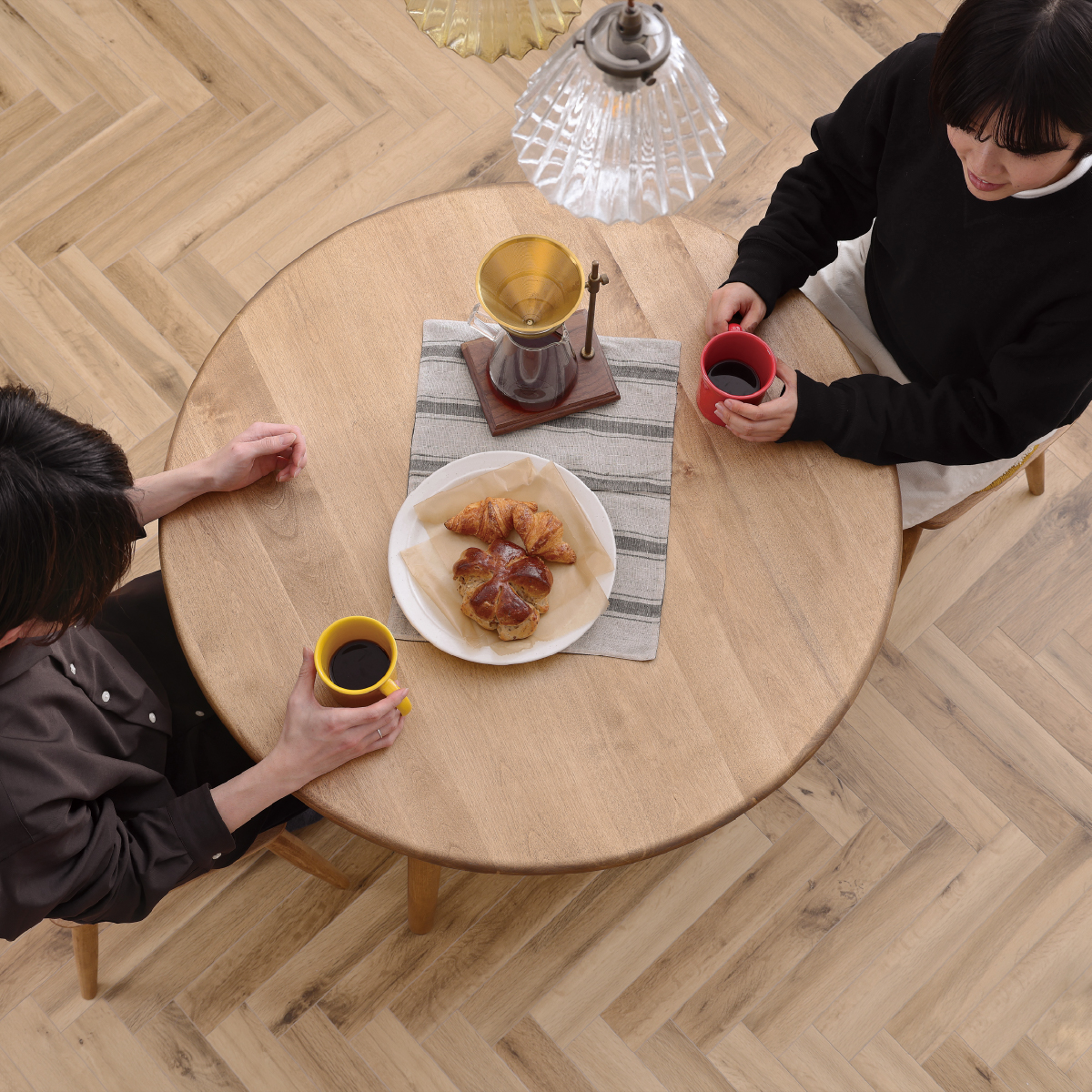 オイル塗装は水分・油分に弱く、長時間放置すると輪ジミやシミの原因になります。木材の表面に施した、無垢の風合いを活かした仕上げです。表面に硬い塗膜をつくるウレタン塗装とは違い、より無垢の状態に近い木の質感や手触り・風合いを残すことができ、経年変化も楽しめる仕上げです。その反面、使用中にシミや小さな傷や汚れなどがついてしまうことがあります。水拭きやアルコール成分による除菌等は可能な限り行わないでください。変形、塗装の剥離の原因となります。製品ご使用の際は可能な限りコースターやトレーなどをお使いいただき、水滴や食べカスなどが直接付着しないようにしてください。