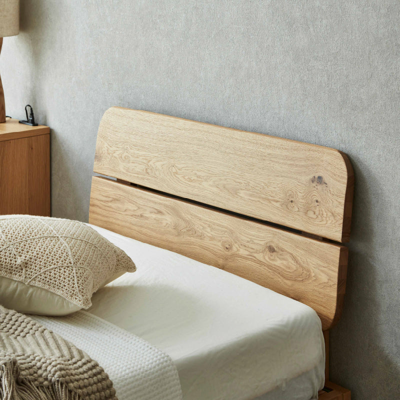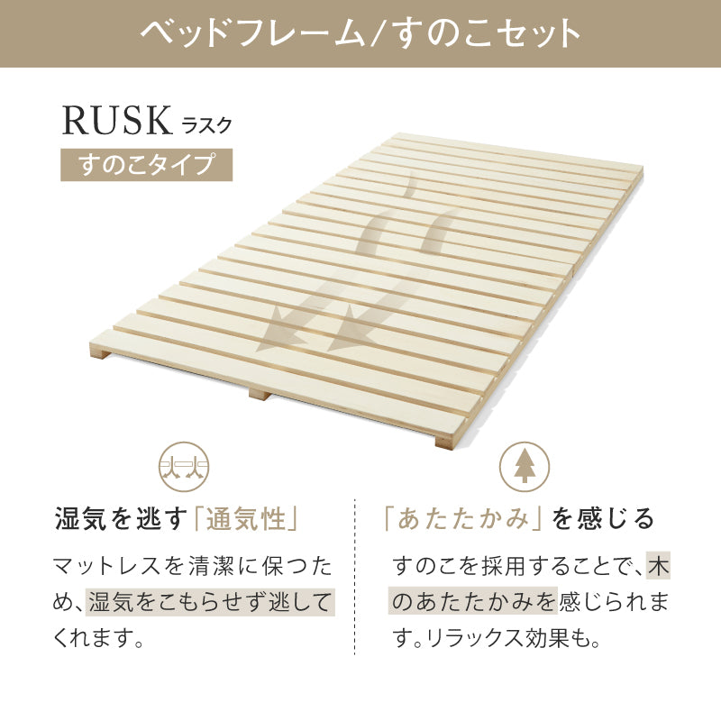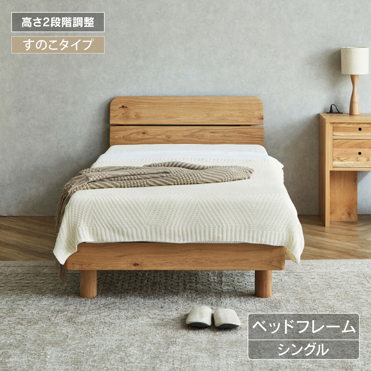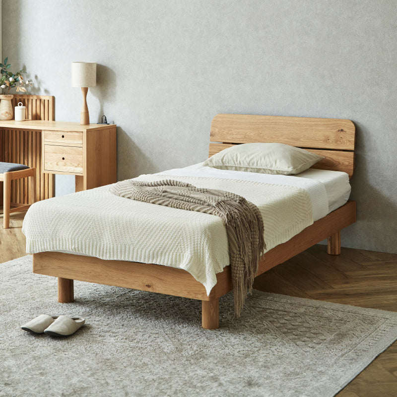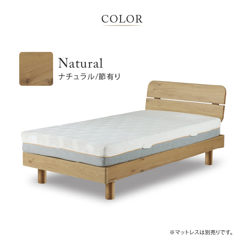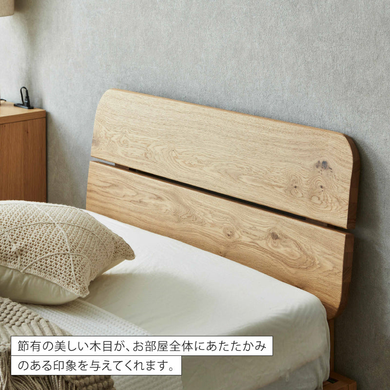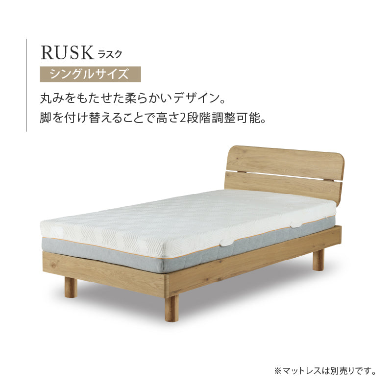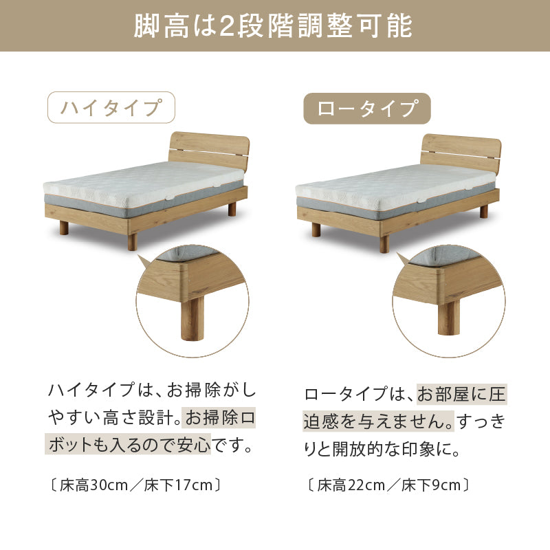 商品情報 丸みをもたせたヘッドボードが柔らかい印象のベッドフレームです。 高さが異なる2種類の脚を付け替えることで、床面の高さを2段階に調整できます。