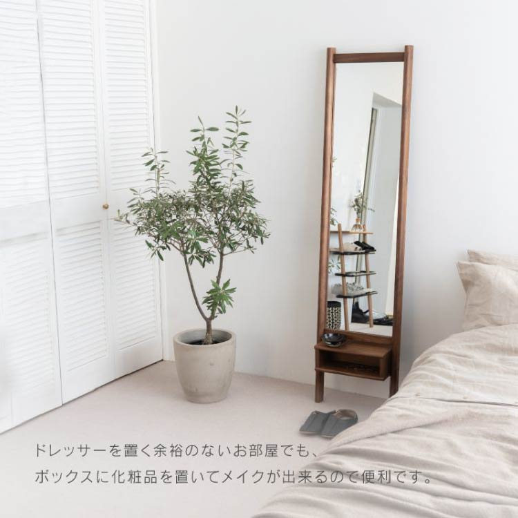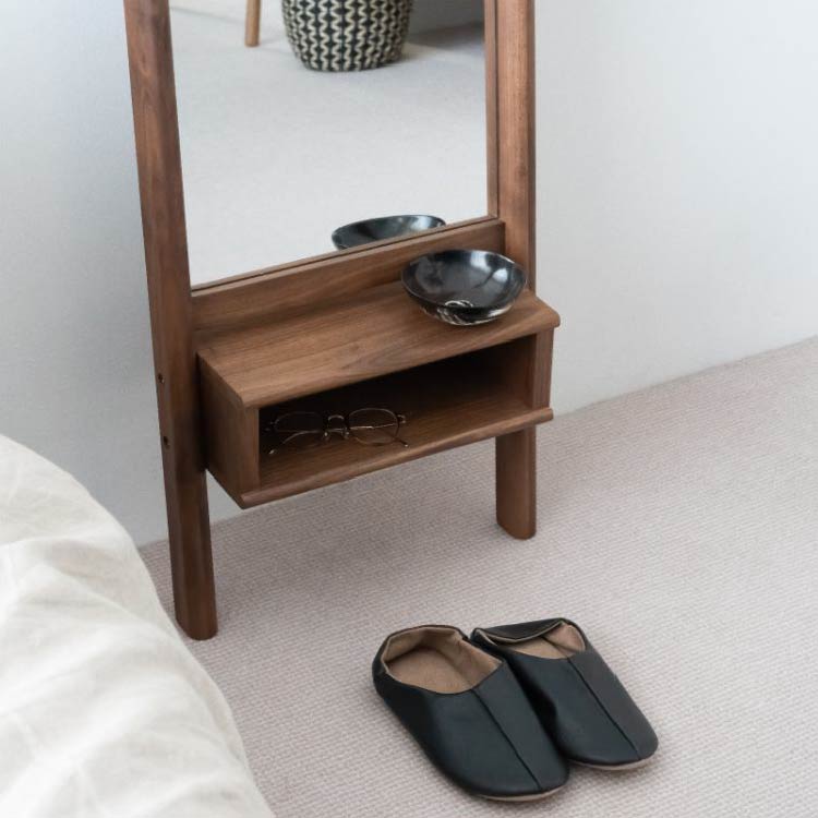 以前まで備え付けの姿見が玄関にあったのですが、引越し先で必要になり購入しました。 壁に穴が開けられないので、自立する姿見を探していました。 立てかけタイプは初めてでしたが、買って大正解です。作りもしっかりしていますし、なによりかわいい。ウォールナットを購入しましたが、私の部屋のアイコン的存在になっています。 鏡でこの金額を出したことがなかったので、購入するまでかなり迷いましたが、買ってよかったです。 ありがとうございました。