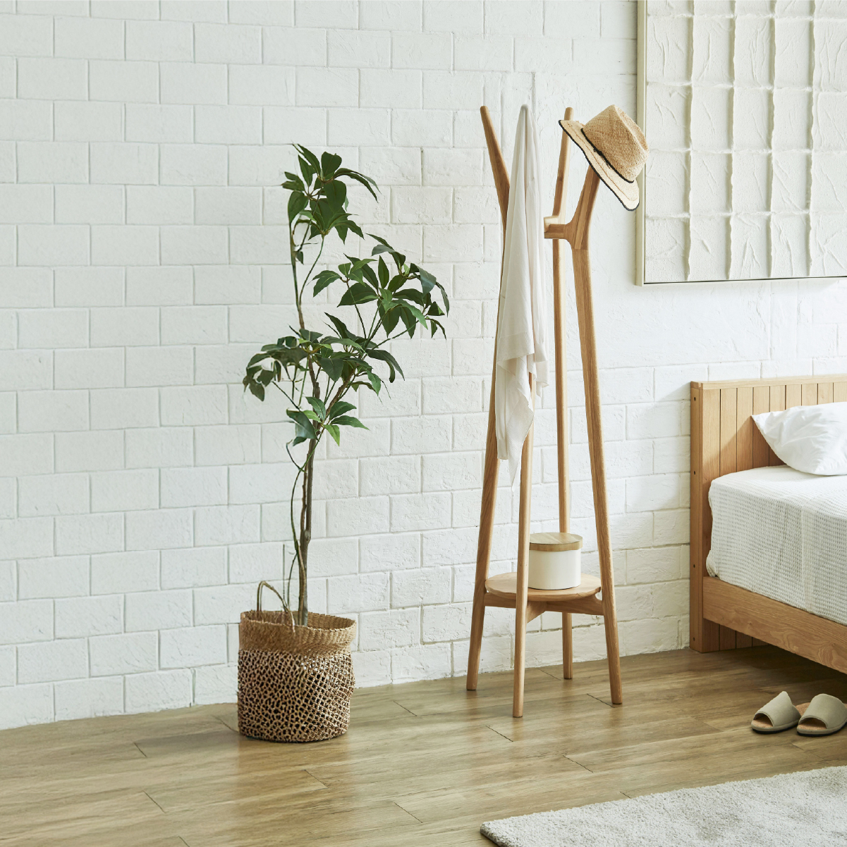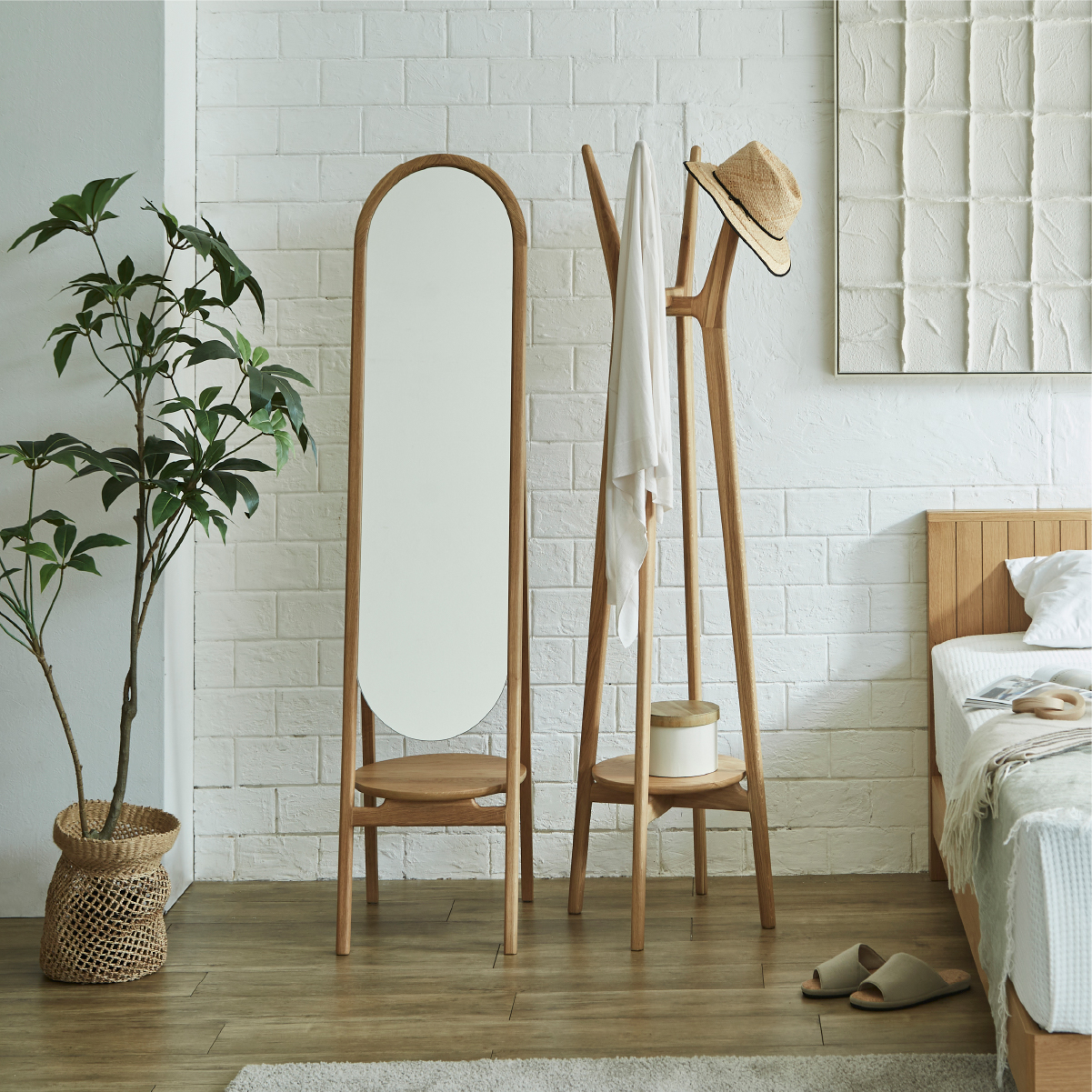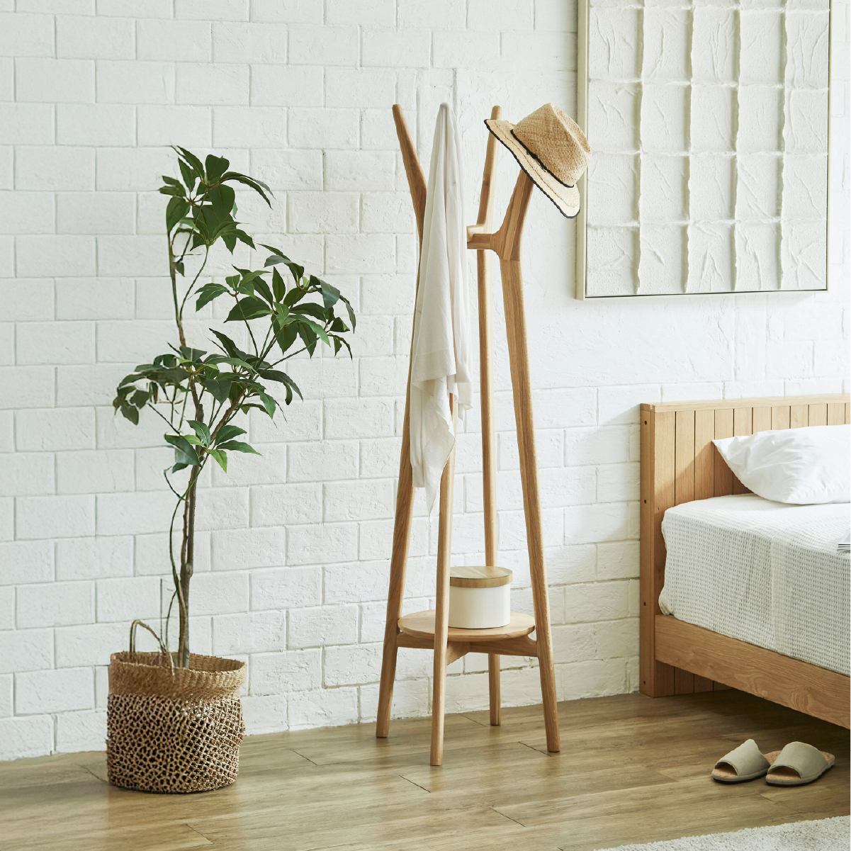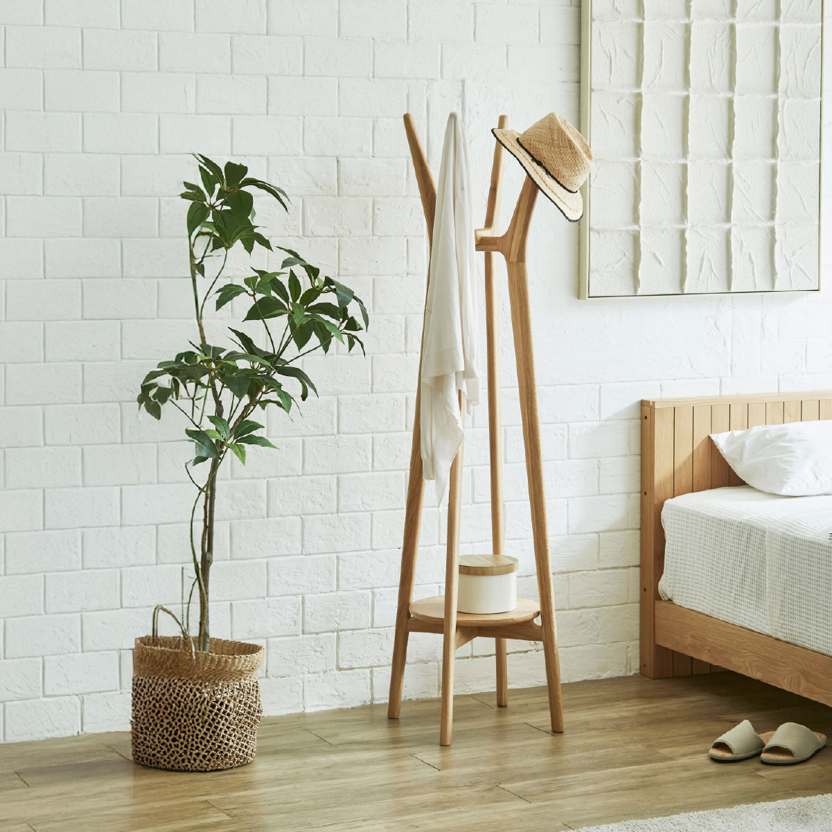 商品情報 オークの無垢材を贅沢に使用し、木の風合いを存分に楽しめる仕上がりです。 ハンガーや帽子、バッグなど、日常の小物をまるでインテリアの一部のように美しく掛けておけるのが魅力です。