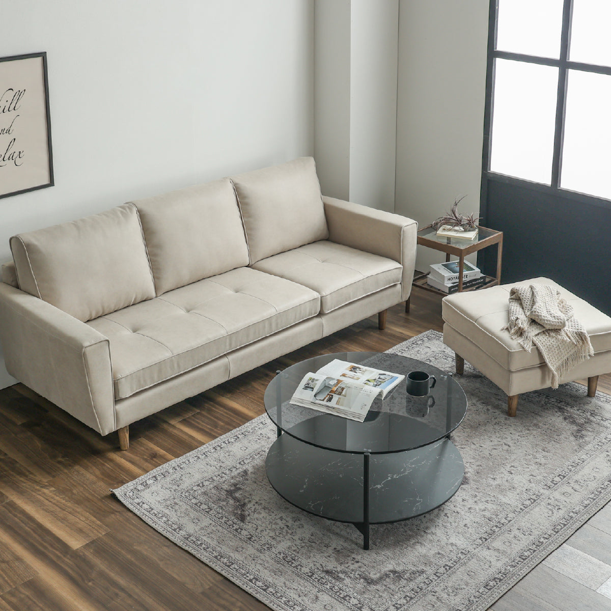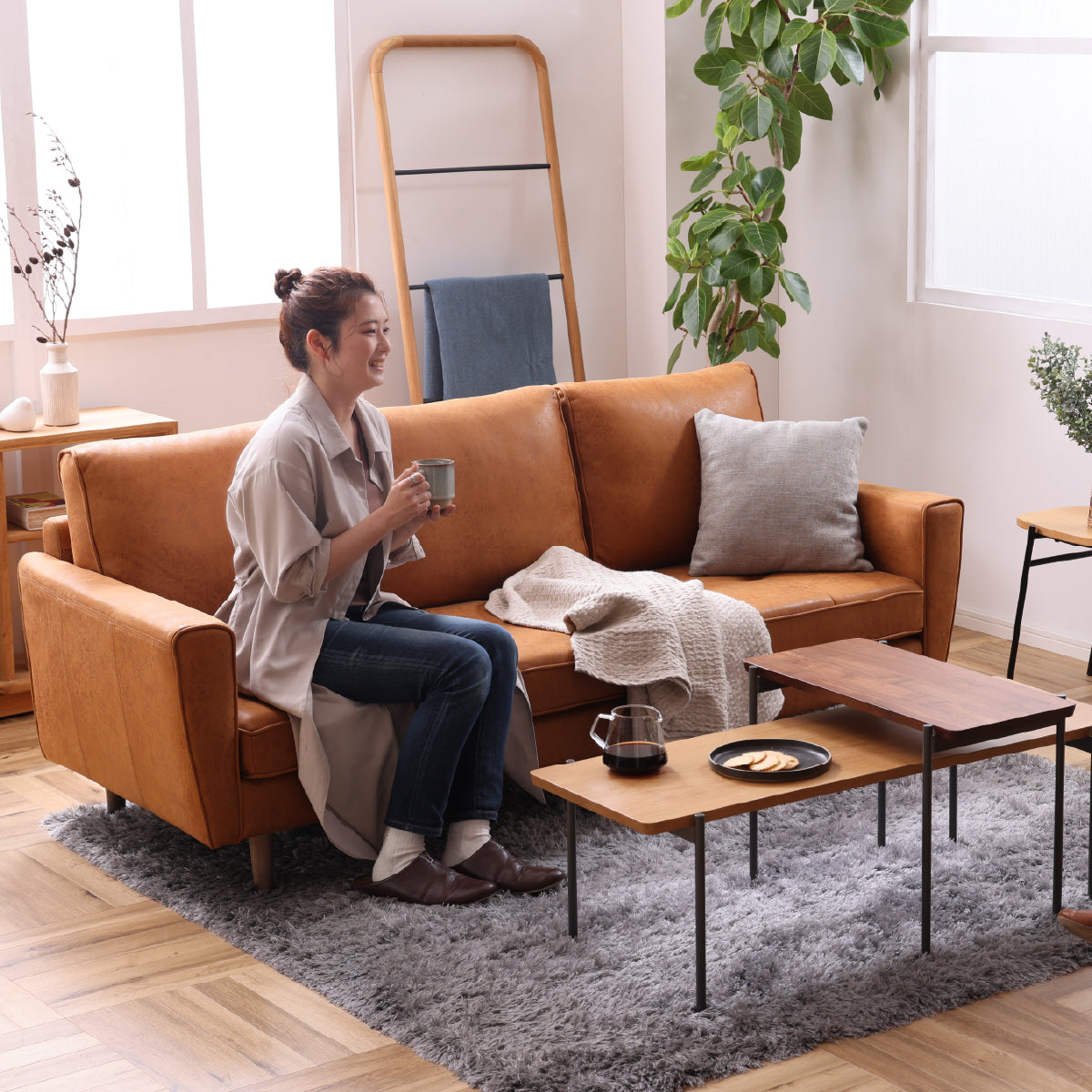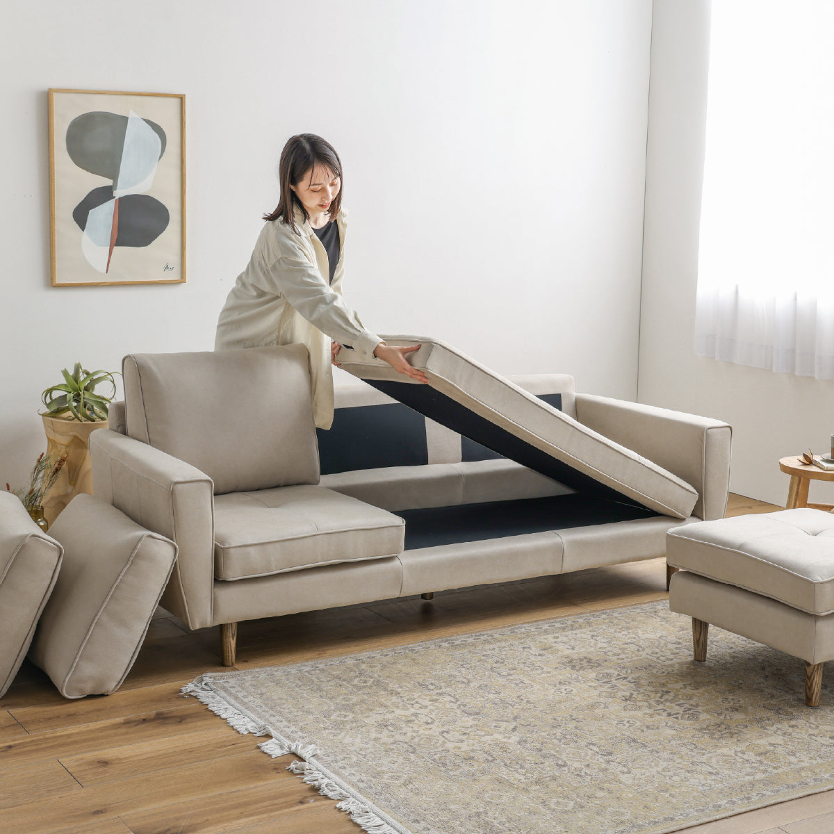 来客時には座面を組み替えて3人掛けとオットマンにしたりと、自由にレイアウトできるソファです。